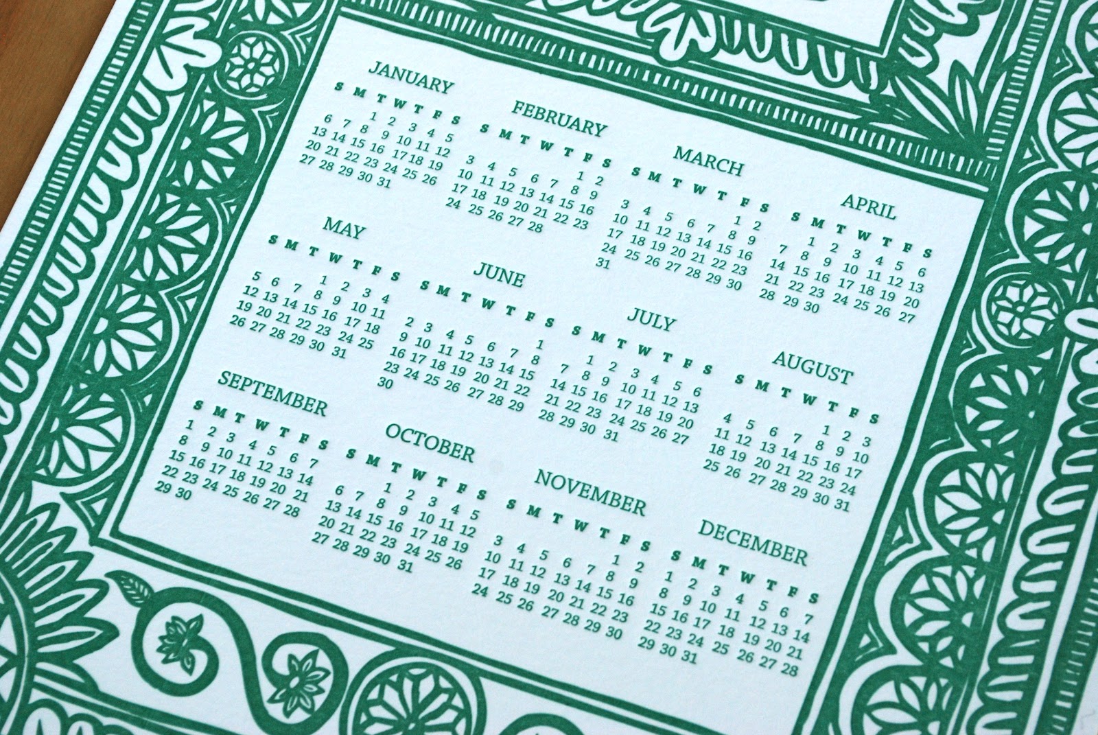 The calendar is a deep turquoise color, with a hand-painted design inspired by the intricate wall paintings we saw in Jaipur this spring. The old palaces we visited would be covered with these tiny floral and geometric designs on every wall, painted by the same families for hundreds of years. I used the same layout of borders and flowers to paint the design, then transferred it to a plate for letterpress printing.