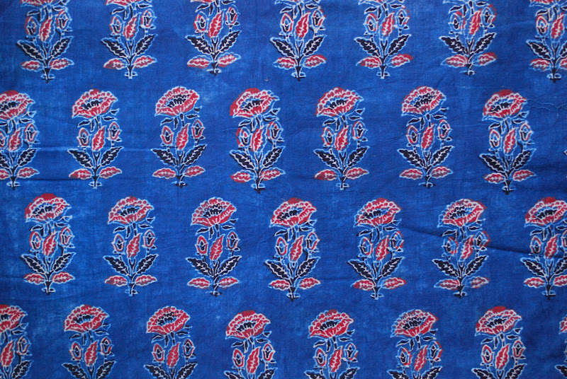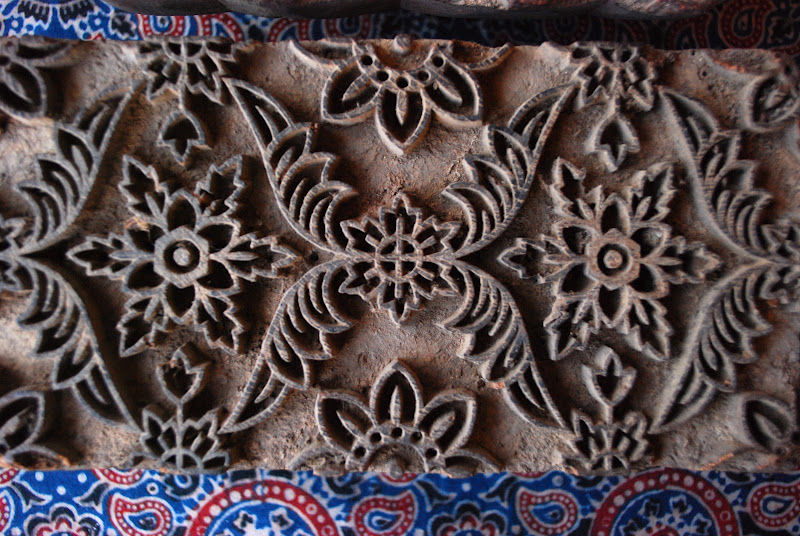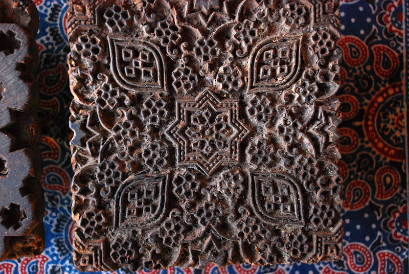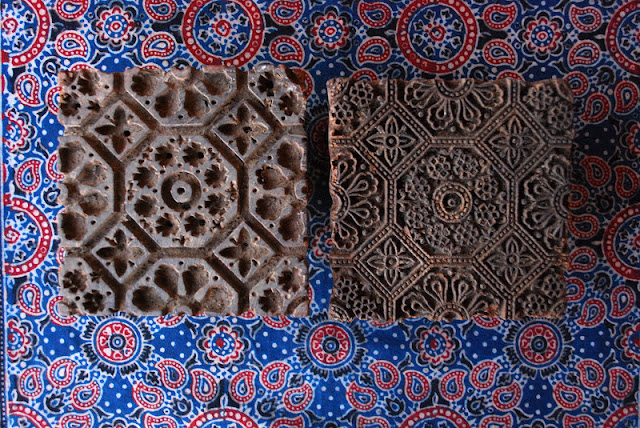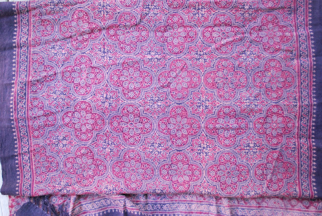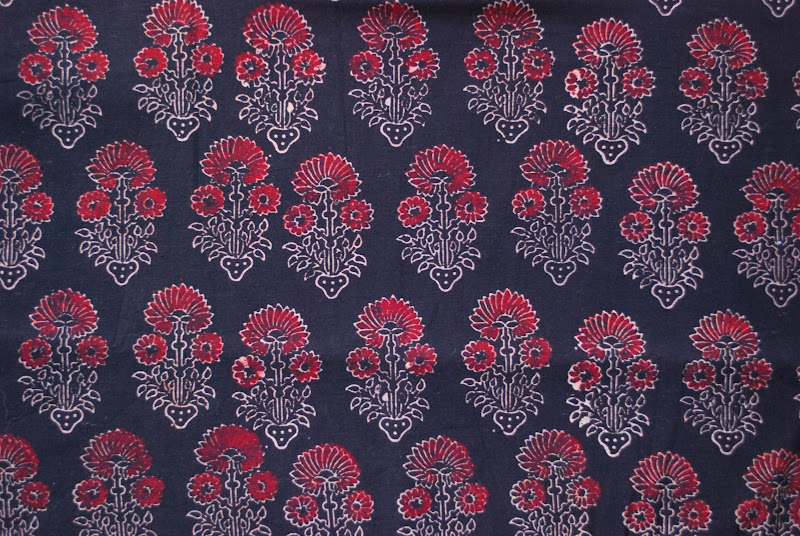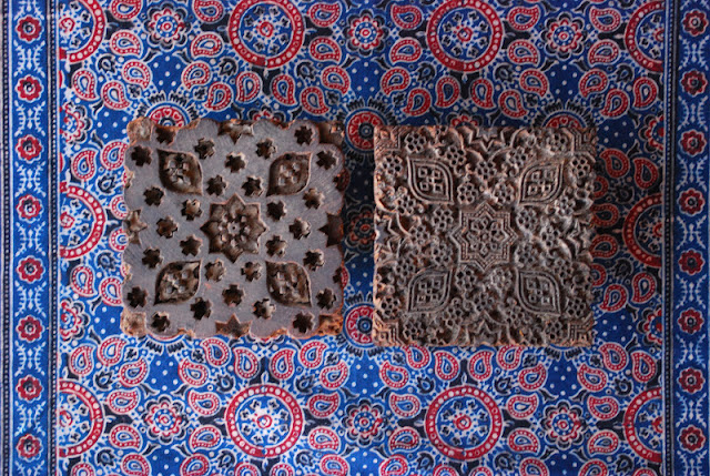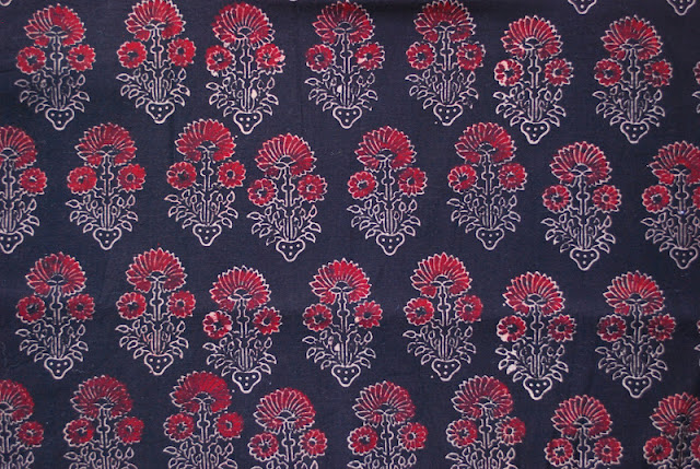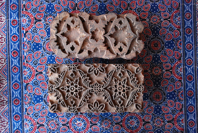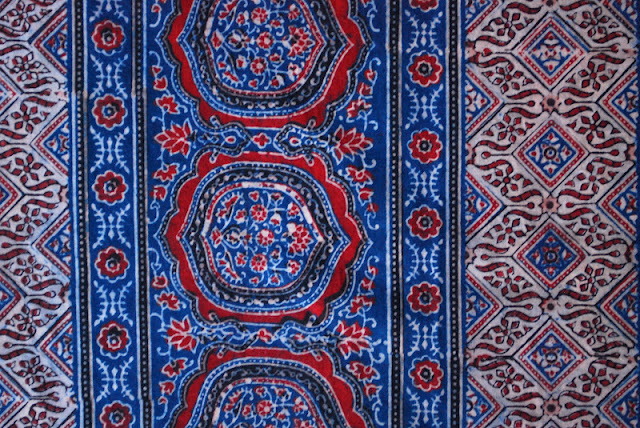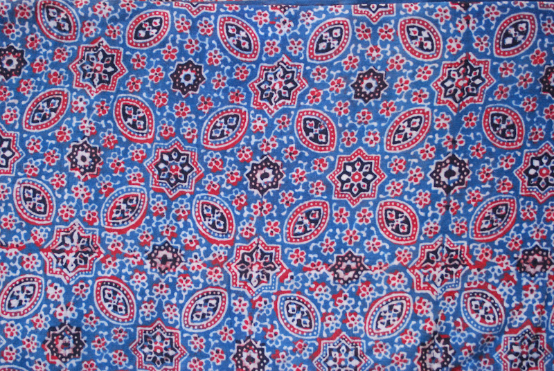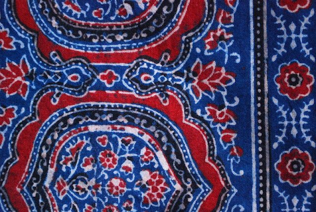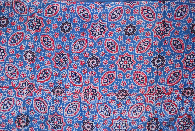 Now that we are settled in in Vermont, I can finally start sharing some of the things I brought back from India. Ajrakh printing is a type of block printing done in Kutch and the neighboring community of Sindh, Pakistan. Rather than printing with dyes like other types of block printing, they print with resists and then do an immersion dye, meaning that once it is dipped in dye the area that was block printed will remain white. This is a much more labor-intensive method of block printing, but the results are incredible, with such deep colors and intricate designs.