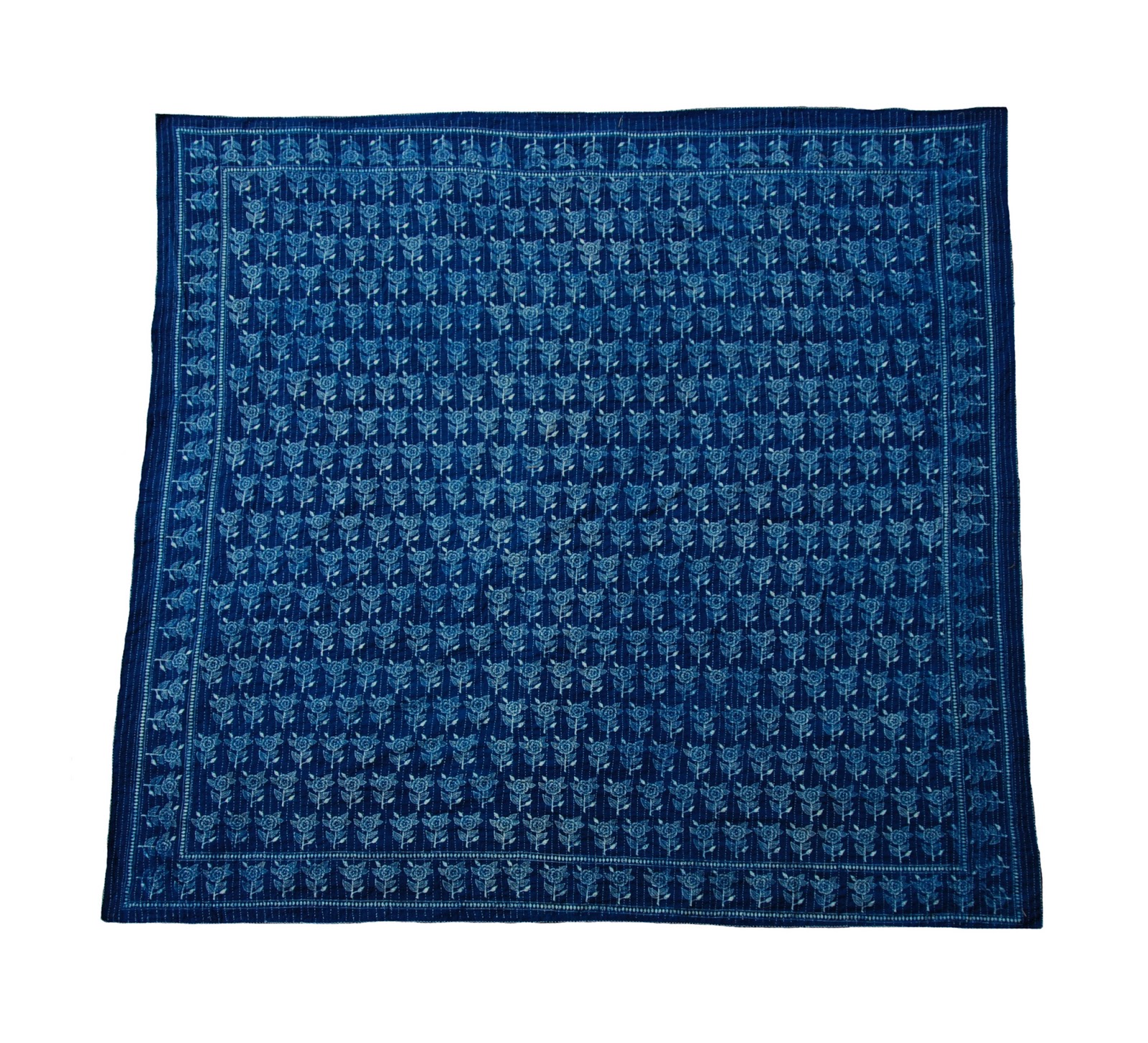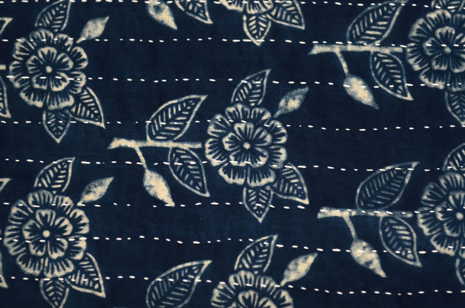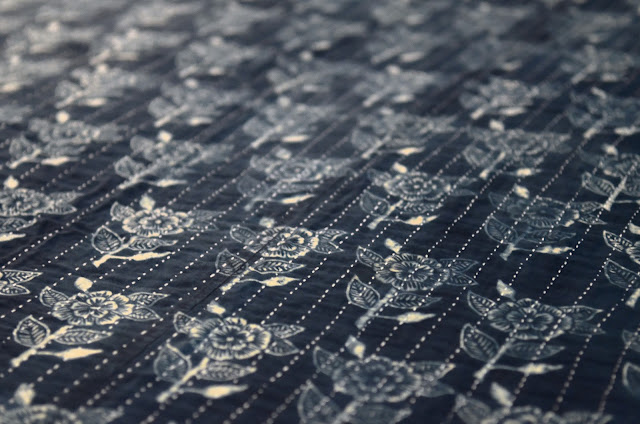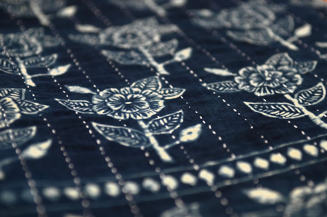 The quilts are resist-printed on 100% cotton, and dyed with natural indigo dyes. They are queen-sized, and reversible, with a block printed floral pattern on the front, and plain stitched indigo on the back.