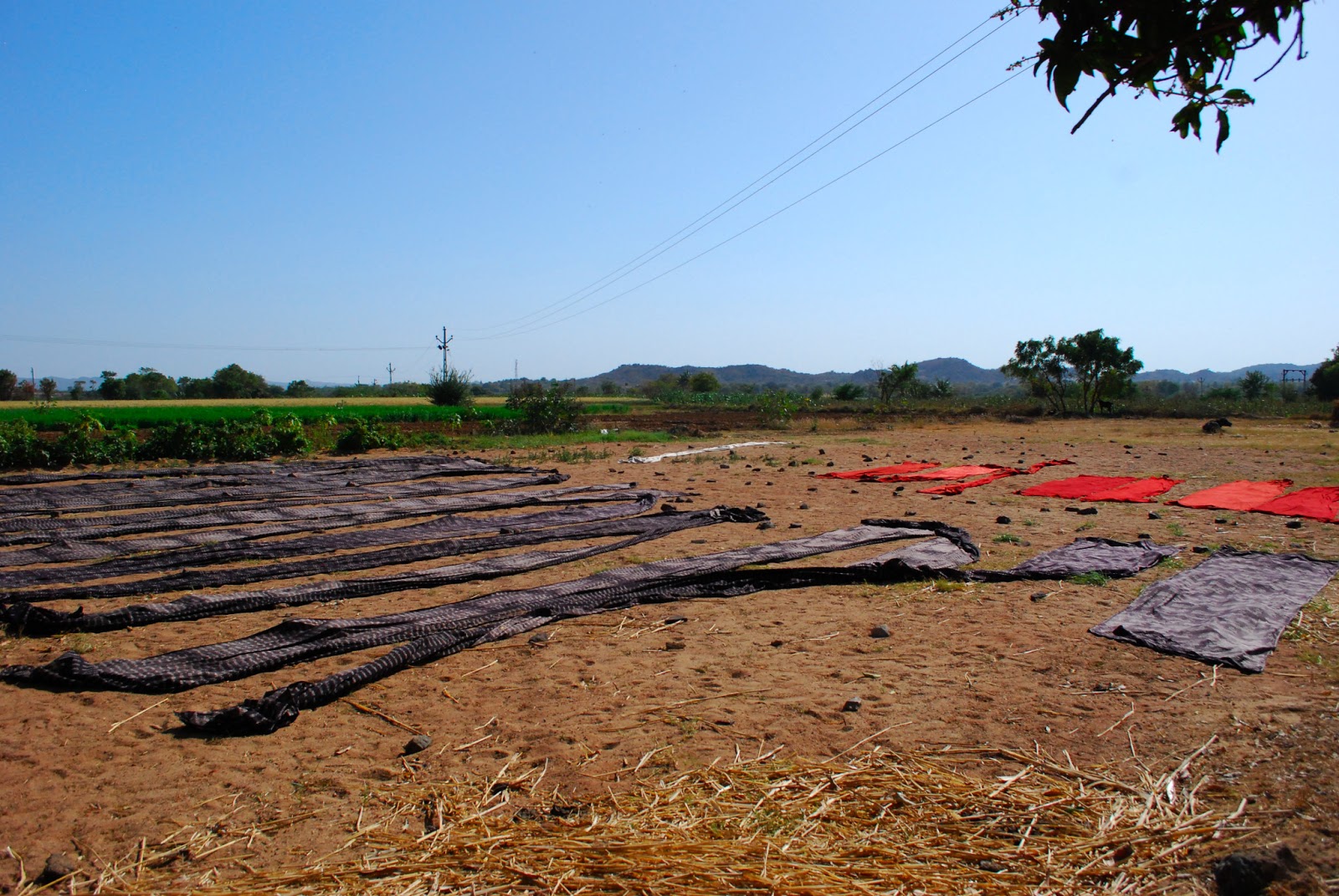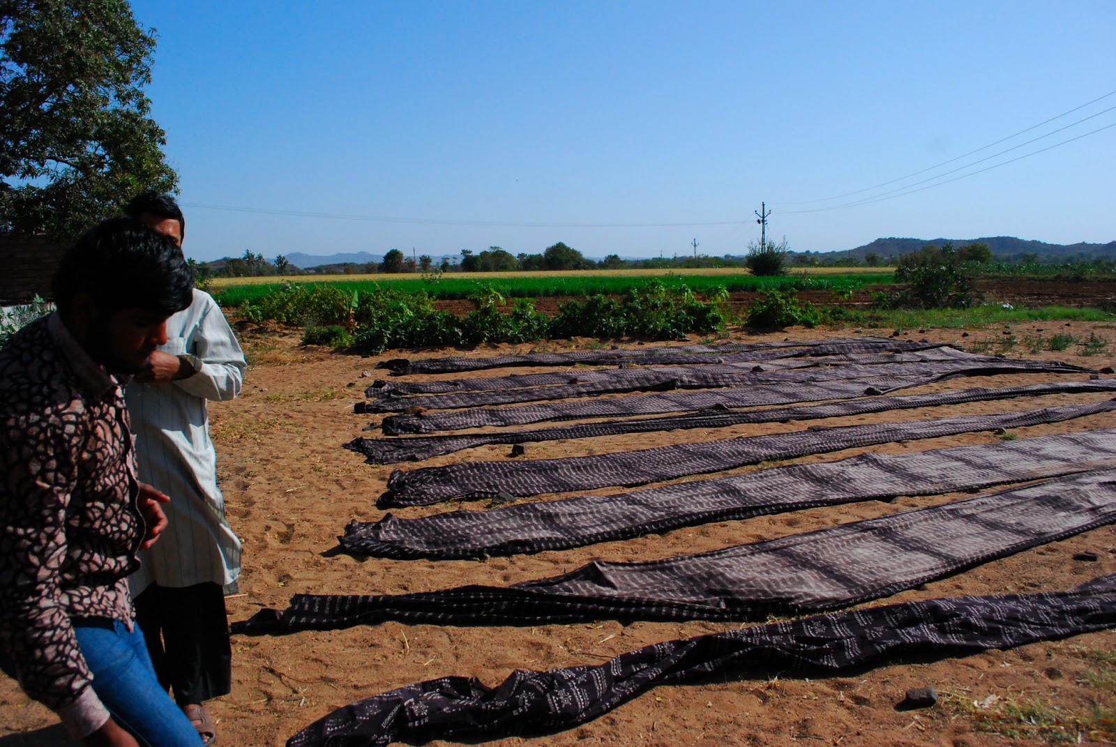 They are all printed by hand, then laid out in the sun to dry before rinsing. The plain and printed cotton pieces are then stitched together by hand, using a thick white thread.