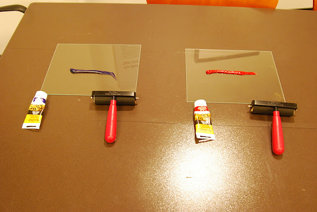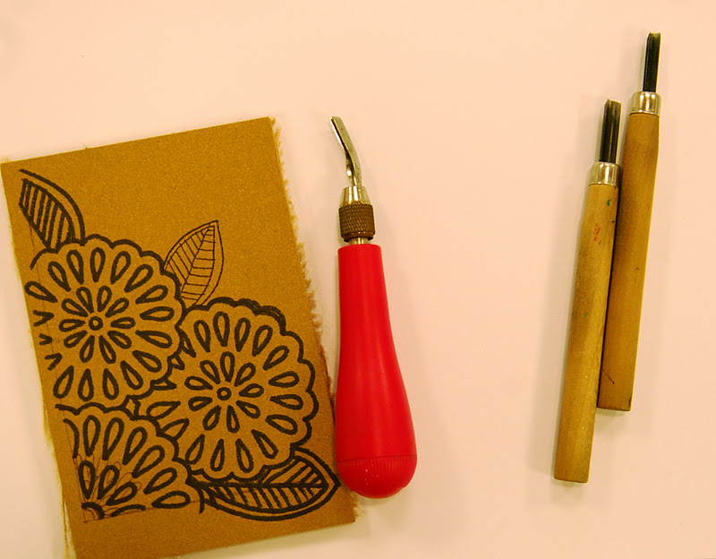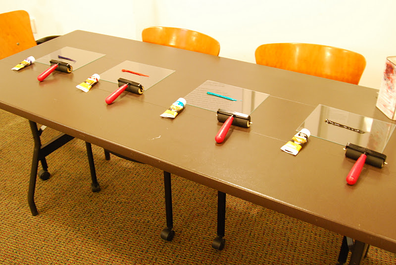 We went over the basics of how to carve and print linoleum blocks, and each student got to create their own design and print it. All set up and ready to go: