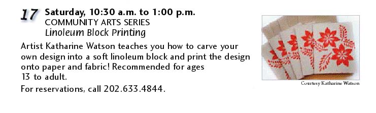 If you are in the DC area and would like to learn how to block print, you can call (202) 633 4844 to make a reservation. There are only a limited number of spots, so reserve your place soon. The class is free, and all materials will be provided, so you won't find a better opportunity!