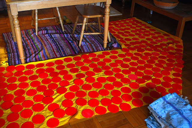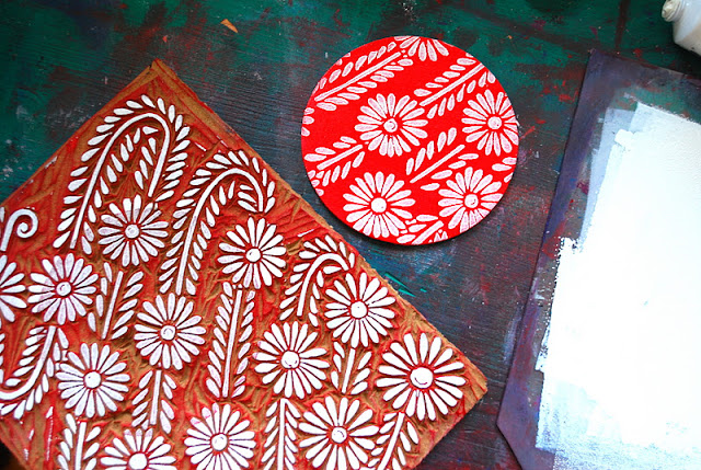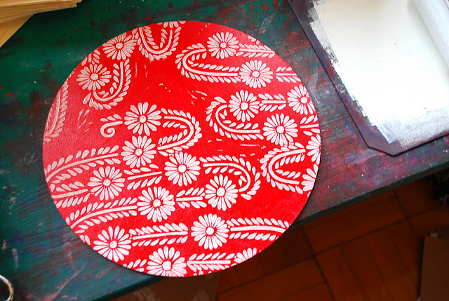 The ornaments are wooden, and each one is block printed with a design (some that you've seen before, some that will be new), and varnished to stand up to the elements all winter. I am making two sizes: one the size of a dinner plate that will be on the actual Lincoln Square tree, and a smaller 4" version that will be sold through in my shop as well as through the American Folk Art Museum shop. 10% of all the profits from this project will go to Folk Arts Rajasthan to support their programs in Jaisalmer, India. You can read more about the work they do on their website.
