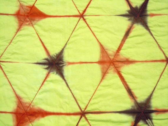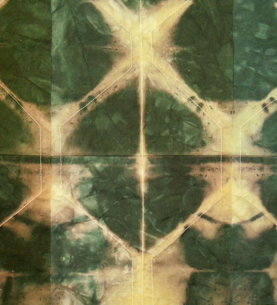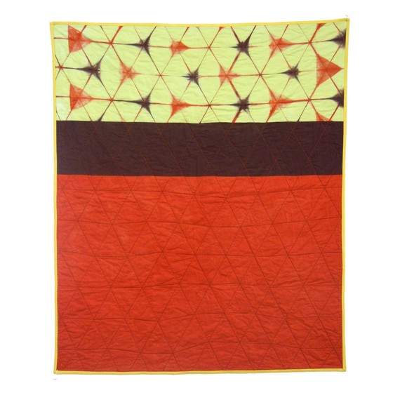 I love the way the patterns and solids are coordinated in the quilt below, and the design seems effortless and complicated at the same time. Even the quilt stitching is based on the shibori pattern.