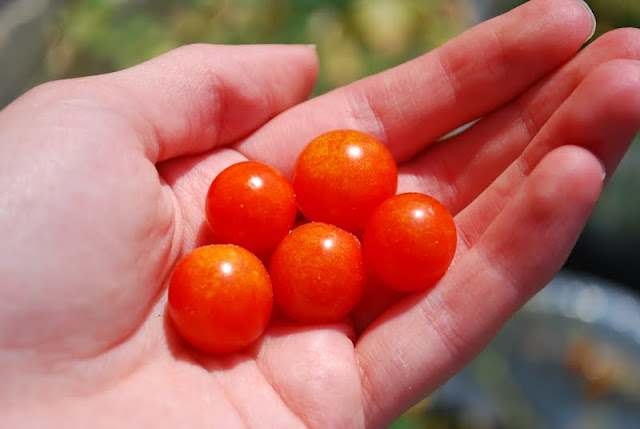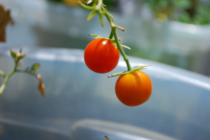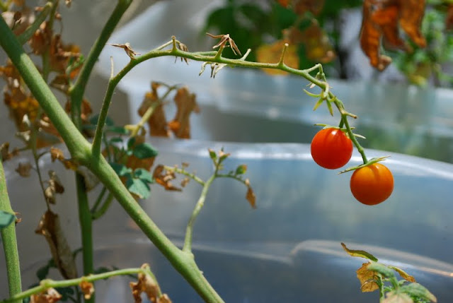 We considered bringing the plants inside for a few days to cool down, but since they are actually growing tomatoes it seemed better to leave them. The big tomato plant still hasn't produced a single flower or tomato, so I think we are going to call that one a failure and focus on the delicious cherry tomatoes.