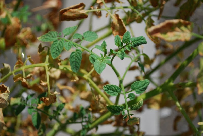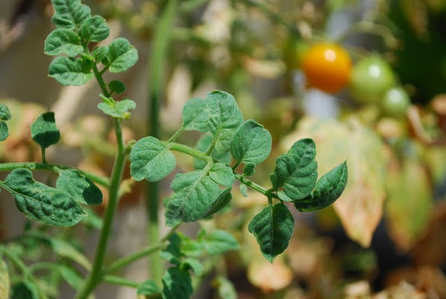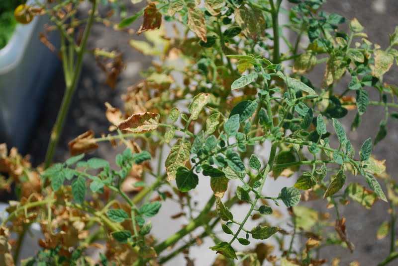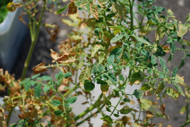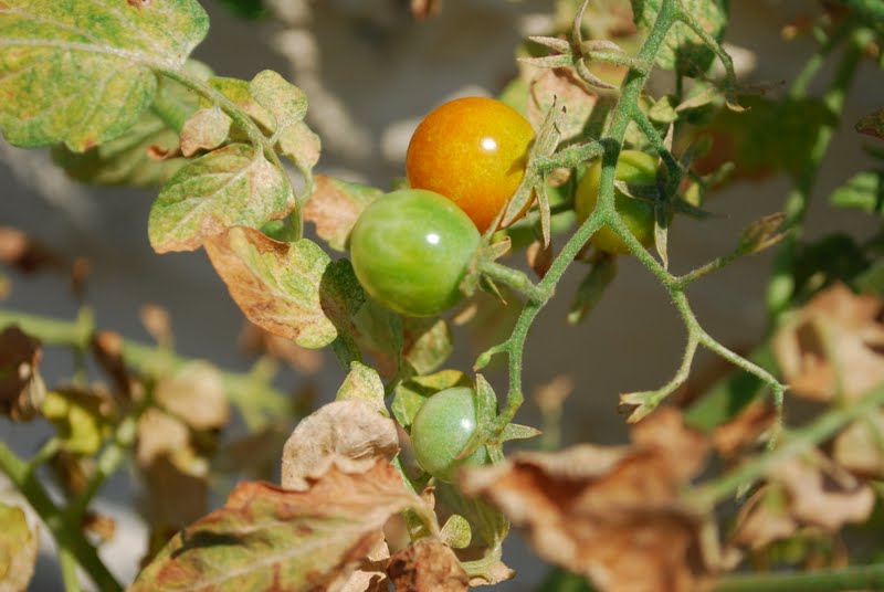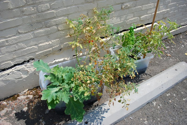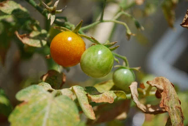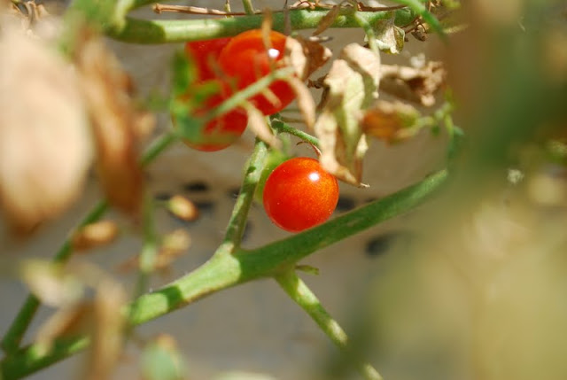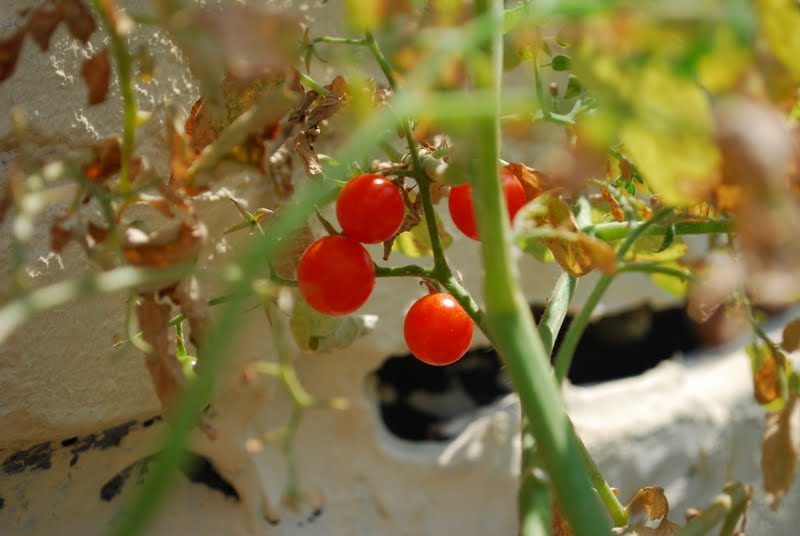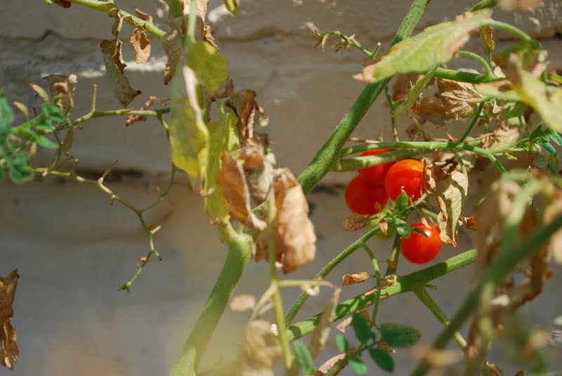 We've been giving them plenty of water, but it is just so hot that the leaves are withering. Even though the plants appear to be dead from afar, they are actually growing lots of delicious cherry tomatoes.