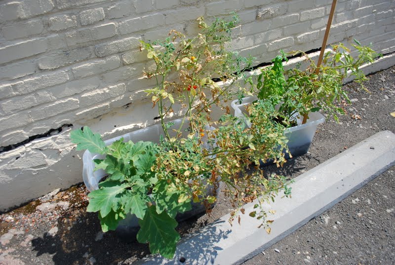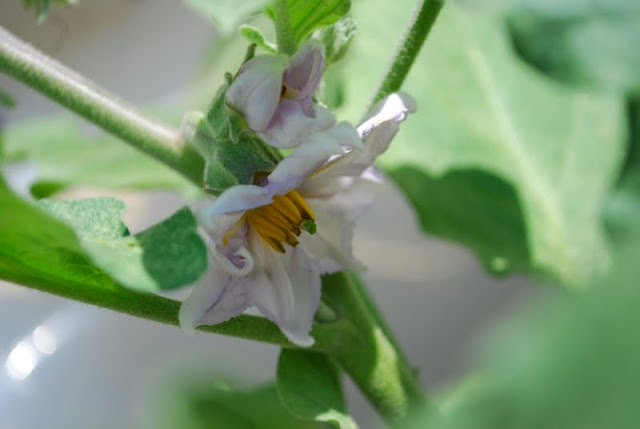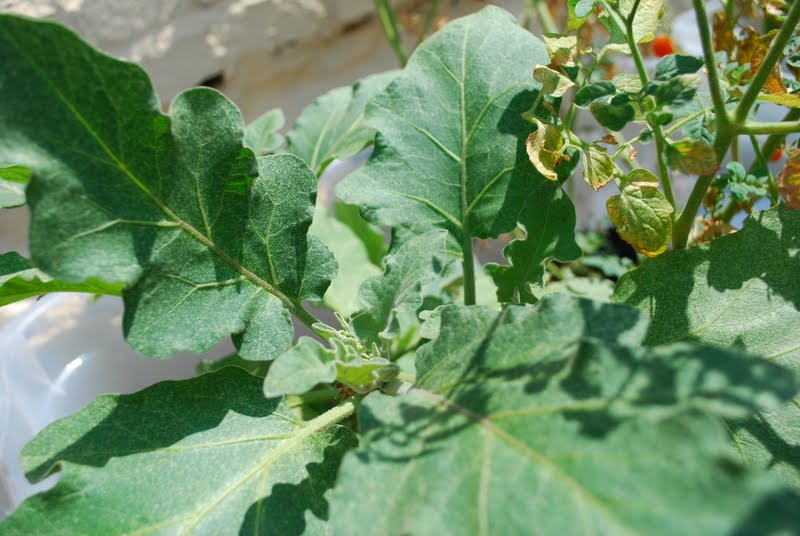 The eggplant is still totally green, and doesn't seem to care about the baking soil it is sitting in. There haven't been any eggplants yet, but it is flowering.