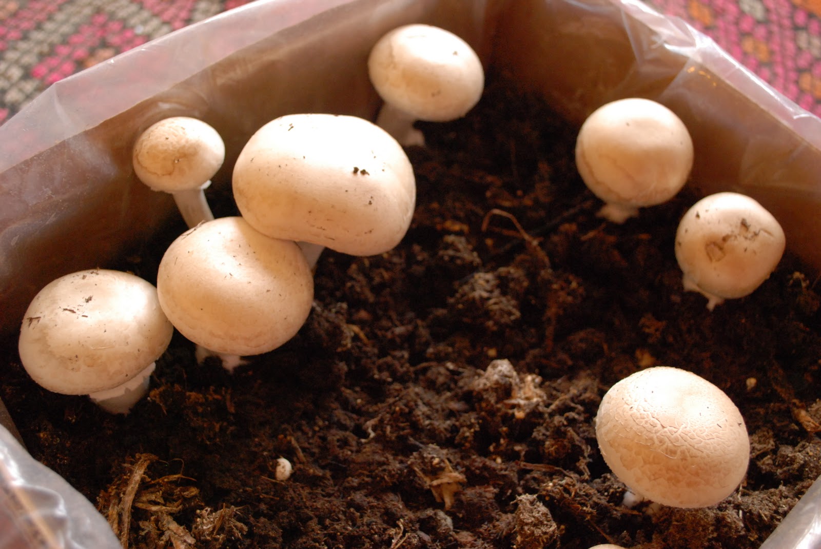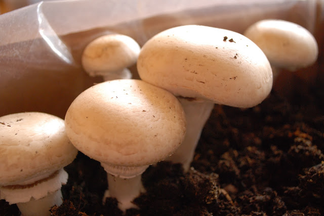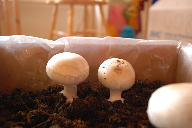 Since our apartment is too dark to grow leafy plants, and many rounds of cilantro and basil have withered and died, we are growing something a little more dark-friendly this time around: fungi.