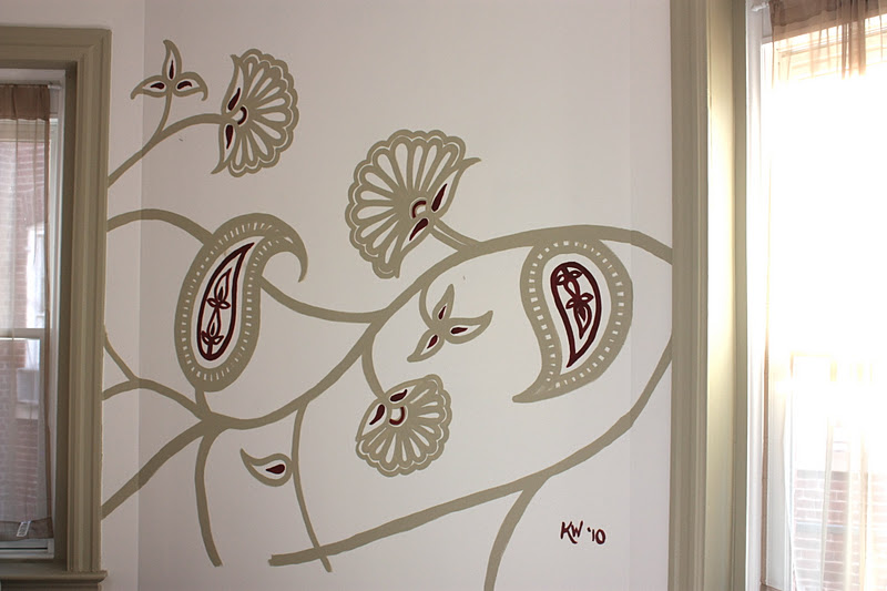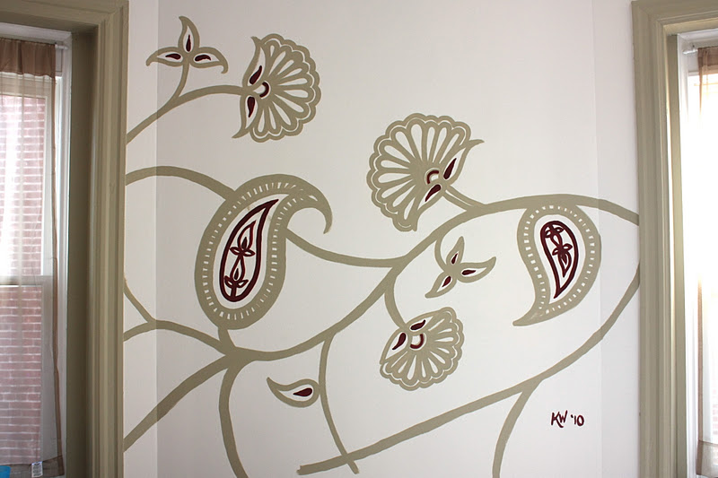 Last year, I painted a mural on my friend Rachel's wall. This week she is leaving DC to do her own textile research (we'll be meeting her in Asia in the spring) and is saying goodbye to the mural too, so I thought I would post some pictures here.