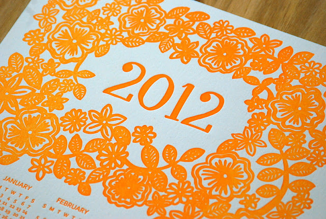 There is a new product in the shop today: the limited edition 2012 Letterpress Calendar. This 9" x 12" calendar is based off an original painting, and was letterpress printed with golden yellow ink on thick cream museum board. There are only 75 of them, and once they are gone, they are gone! This is the first time I have turned a design into a letterpress print, and I love the way it came out, so you can definitely expect to see more letterpress in the future.