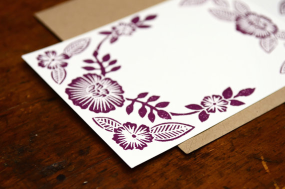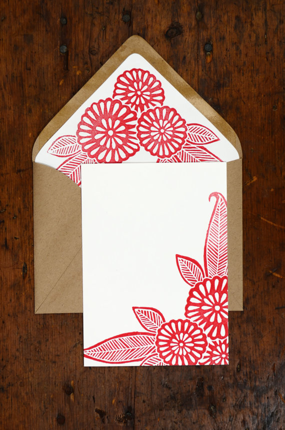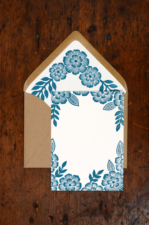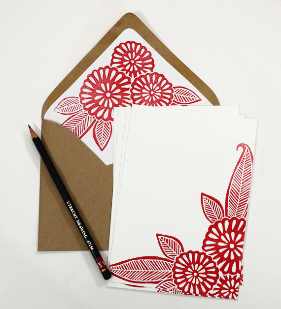 Each set contains six A7 flat cards and six kraft envelopes with matching liners. Both the cards and the liners are printed with a hand-carved linoleum block. You can find them in the shop right here.