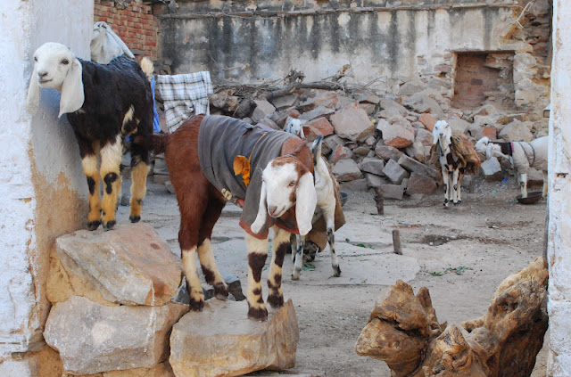 Our first stop in Jaipur was Samode Village, where we spent two nights with my parents who were in India for a conference. It was our first visit to an Indian village on this trip, and as soon as we walked out of the hotel, we were taken under the wing of a local painter who spent the afternoon walking us through the market and alleyways of the village (for the small price of us buying one of his little paintings). We saw lac bangles being made, iron pots and shovels being hammered into shape, goats wearing sweatshirts to protect them from the cold, and hundreds of kids screaming for pens and chocolates.