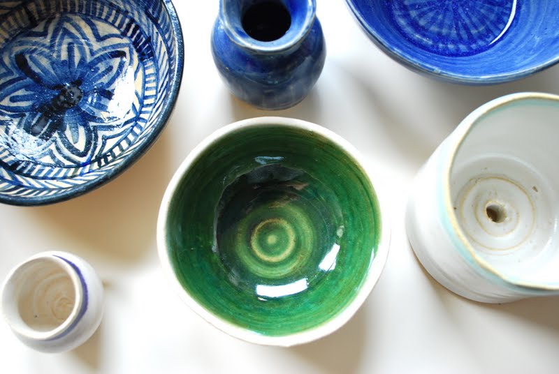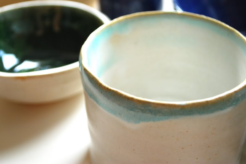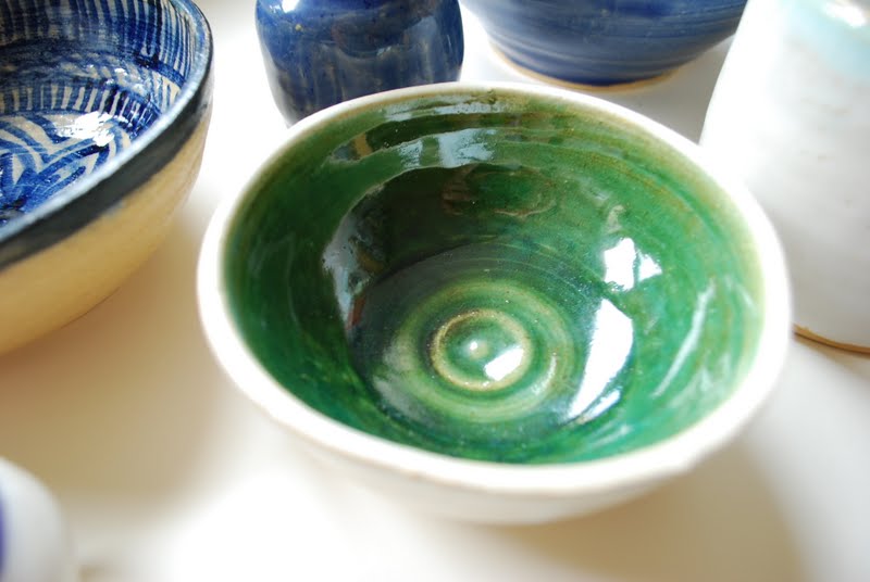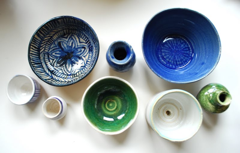 Last week I got my first ceramic pieces back from the kiln (actually, the second, but the first round was such a disaster that they will never be seen again). I made three bowls, three small vases, a little teacup and a planter. I tried several different glazes to see what I like best, since there is really no way of telling how something is going to look while you are glazing. My favorite is the patterned bowl on the top left (I do love pattern) and I have already glazed a few more pieces with the same design.
