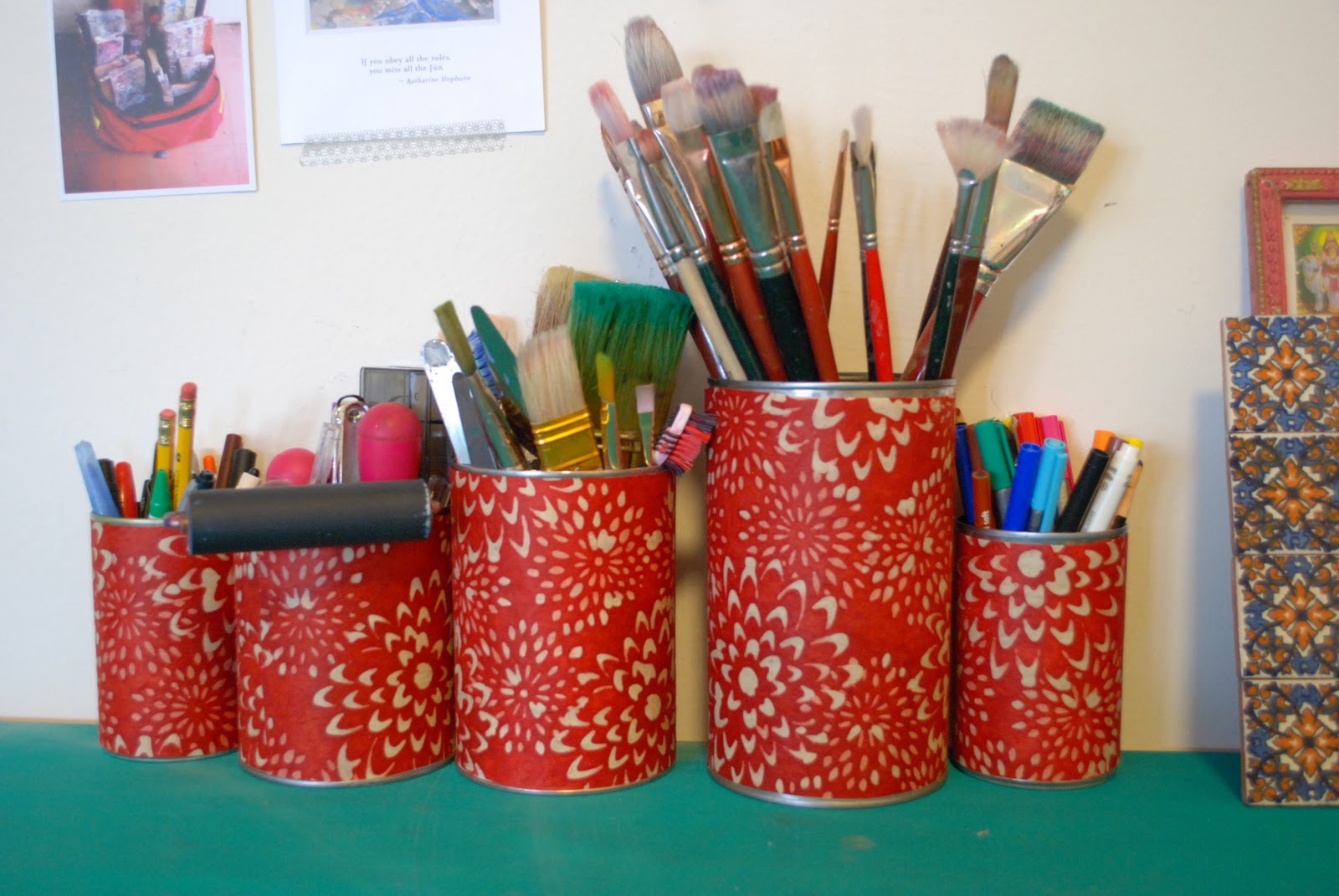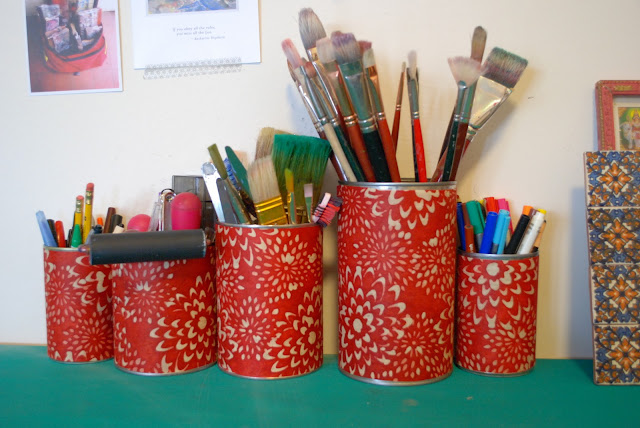 As part of my ongoing project to organize my studio space, I've slowly been putting up shelves, painting and making a place for everything. I've been collecting cans over the last few weeks to make pen and paintbrush holders, and as of this morning, finally had enough to hold everything.