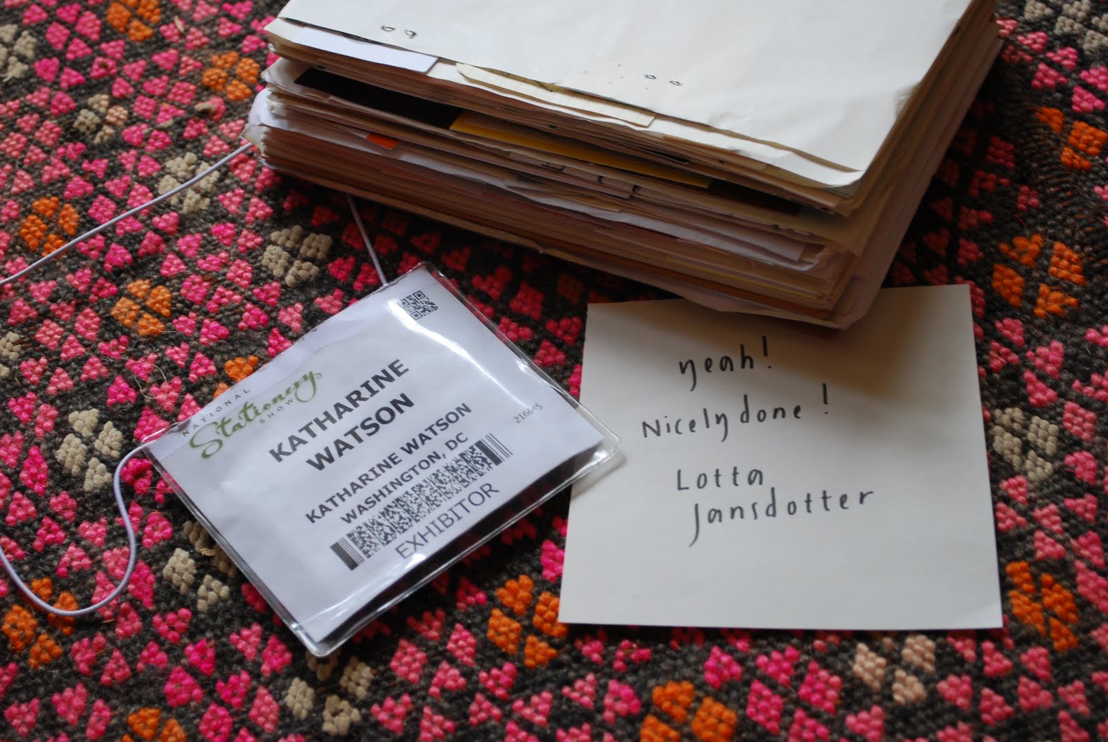 And now I'm home, with a huge notebook of new contacts and follow up emails to write (and my note from Lotta Jansdotter, which I'm going to hang in my studio), orders to work on and packages to ship. I took the whole day off yesterday to recover, and now it's back to work. See you at the 2012 Stationery Show!