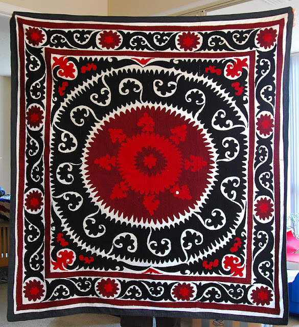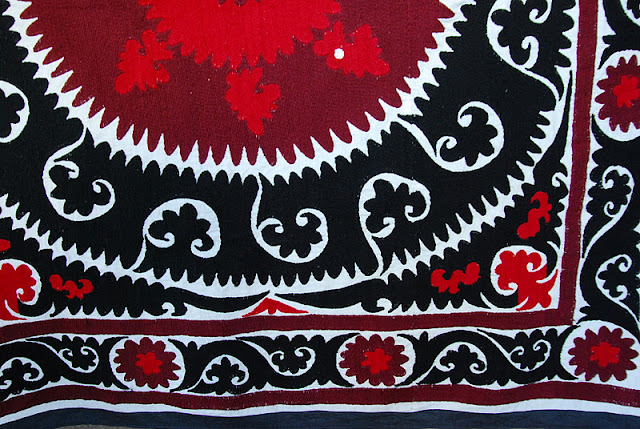 As you may know, my friend Rachel recently got back from a textile research trip to Uzbekistan, Kyrgyzstan and Kazakhstan. Her next stop will be Hong Kong with us! She brought back a collection of Suzanis, traditional Uzbek embroidered quilts, and they are gorgeous. I bought this one from her basically as soon as she stepped off the plane (I think my first question was "What textiles you bring back?!?").