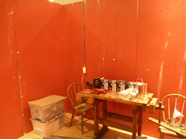 Leaving them with spackle and holes when we were too tired to work any more. The next morning we touched up the walls, hung the shelves and lights, and put up the products (sounds fast but took about six hours).