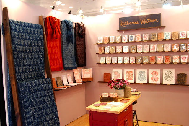 For my booth this year, I went with a purple-grey color (a more subtle look than last year's red walls). I wanted to stick to a lighter color this year since there were so many products in the booth. The big new addition was the block printed quilts which got a great response! They are made by the same printers who block print the scarves and I'll be sharing lots of photos soon. I built a wooden ladder to display the quilts and loved the way they looked hanging in the booth.