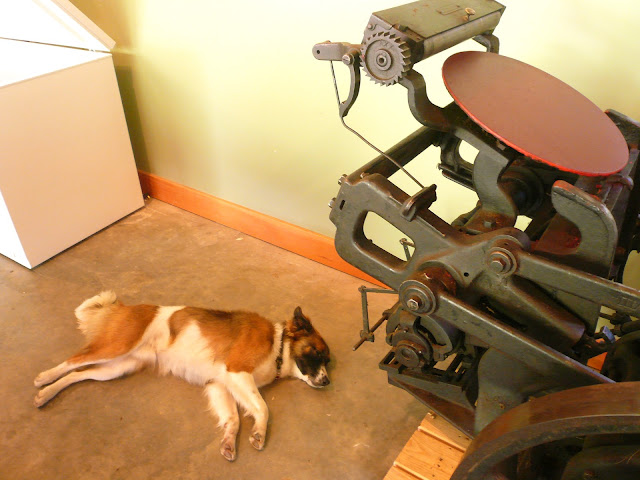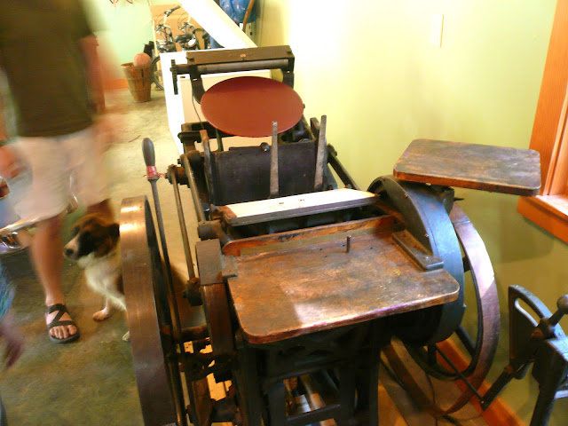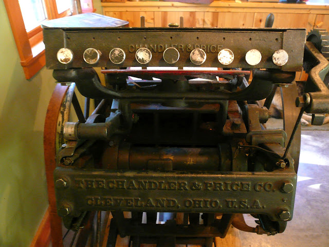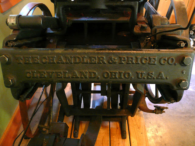 This weekend Joe and I drove four hours south to pick up a new addition to the studio that I found on Craigslist: a Chandler and Price letterpress. It was quite an adventure; we borrowed a trailer and drove the GPS's "most direct route" which went through winding back roads and unmarked paths (I think it's time for a new GPS). When we got there, the door needed to come off the studio it was in, and it took us two hours to roll it out and onto the trailer. Then we hauled the one-ton press back over the winding roads, to it's new home in the garage.