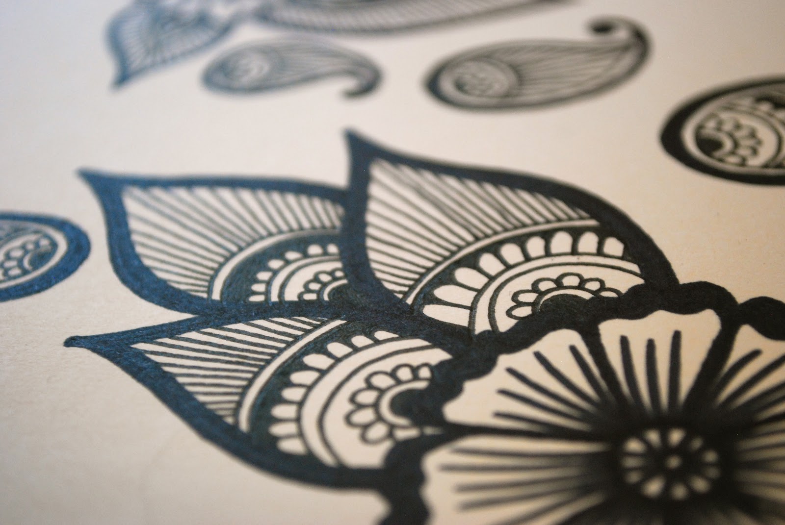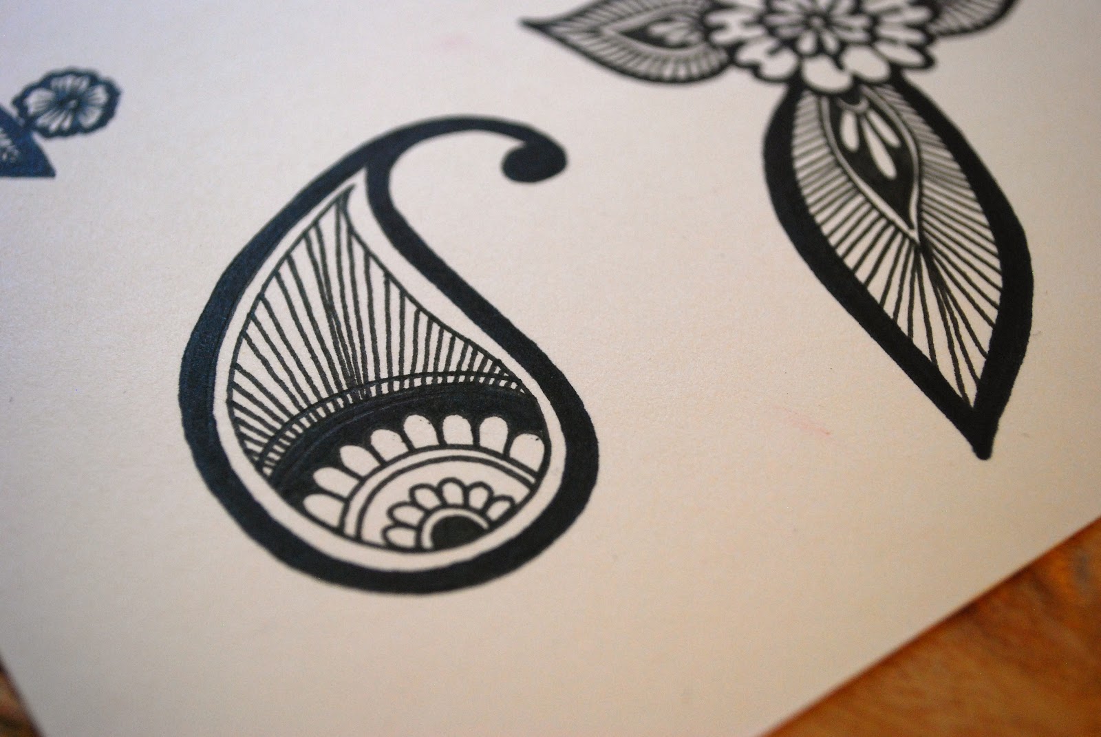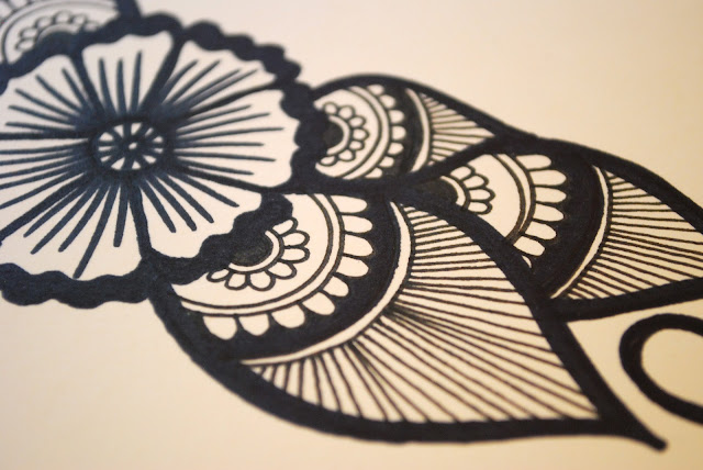 When I work on custom designs or non-block-prints, I usually draw them out by hand and play with pens and sharpies to get the design right, then scan it in and adjust in Photoshop. The corner drawing below is for an envelope liner like this one; I think it's going to look beautiful!
