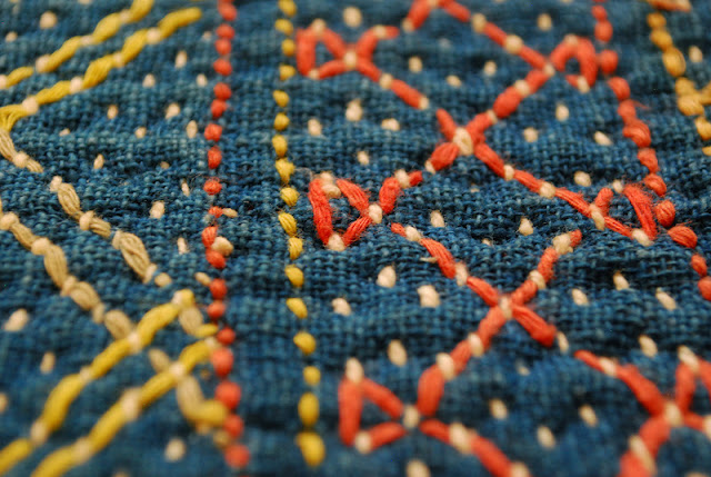 Because the pieces are part of a private collection, I won't be sharing the photos here, but I've been taking a few close-ups to document the techniques. Below is block printing, kantha stitch, Parsi embroidery, more kantha, running stitches, mochi embroidery, zari embroidery, kalimkari, and more kantha stitches.