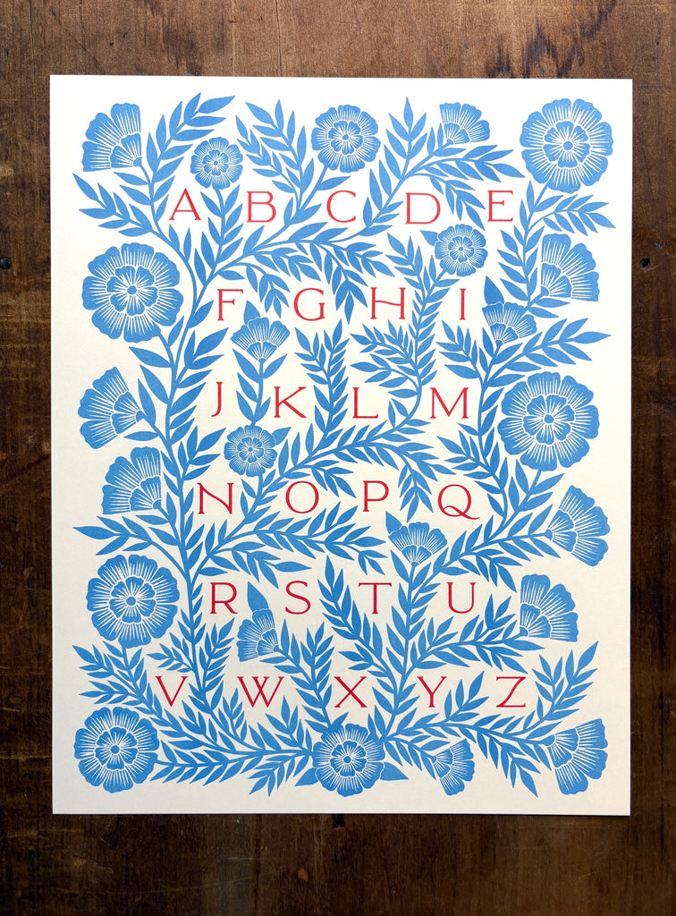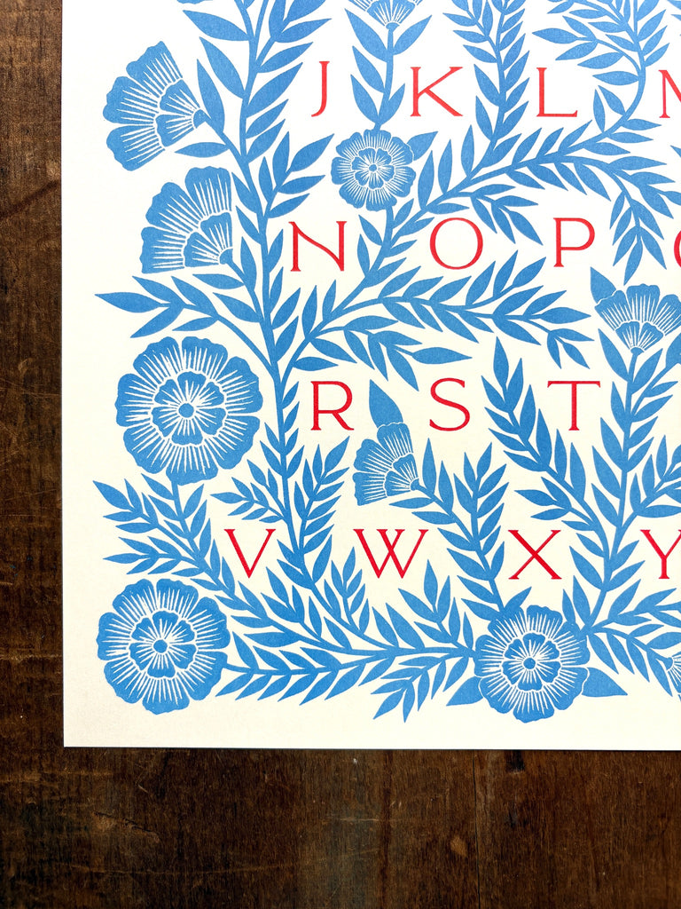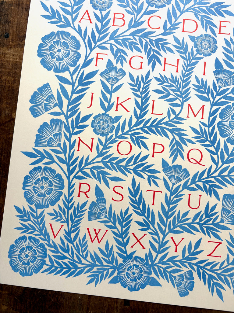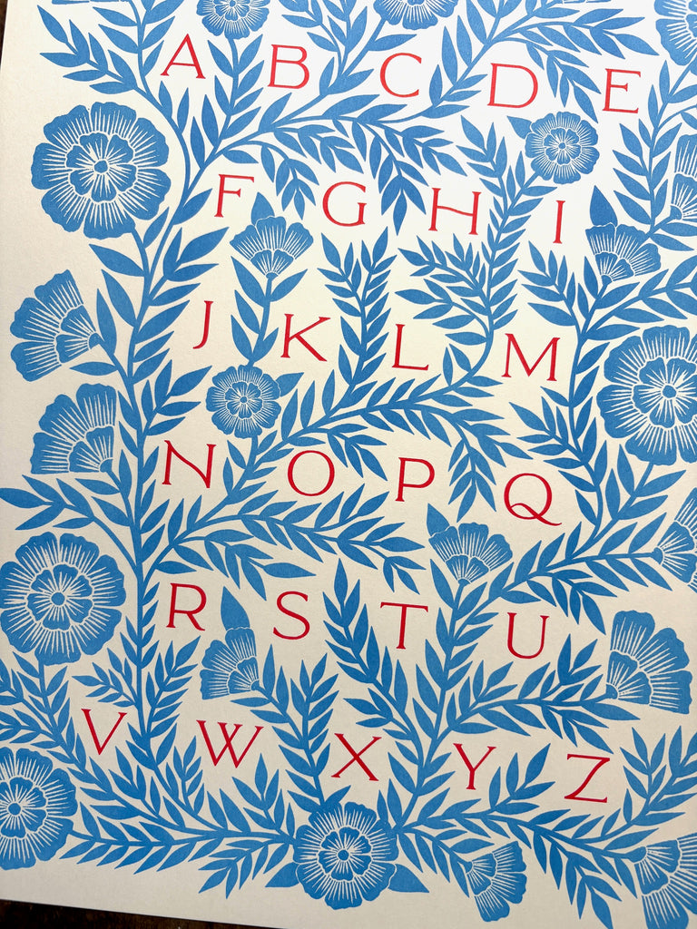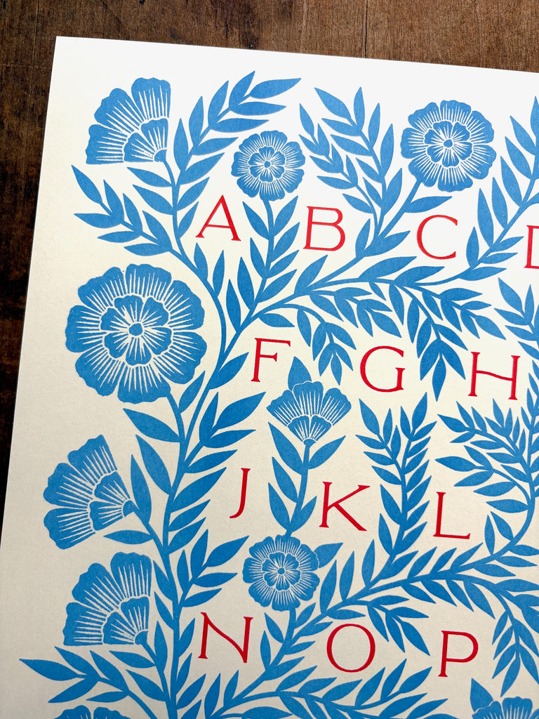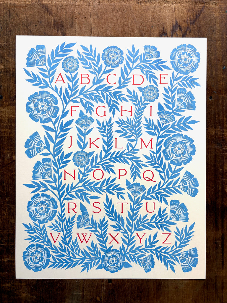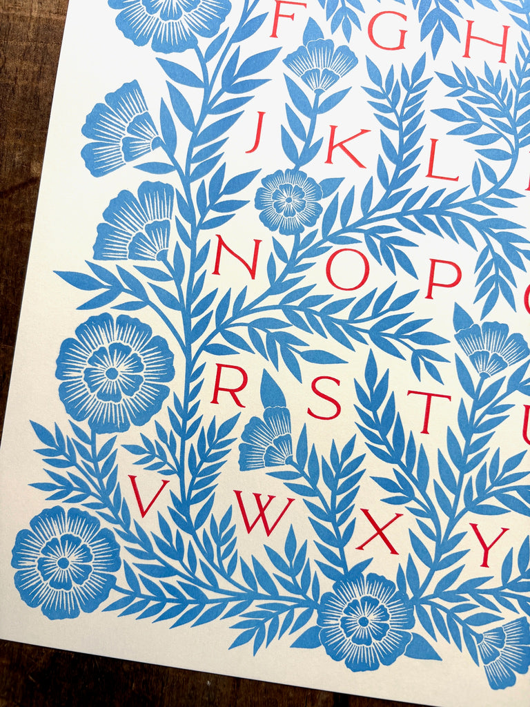 An original Katharine Watson alphabet print, risograph printed in a bright color palette of blue and red.