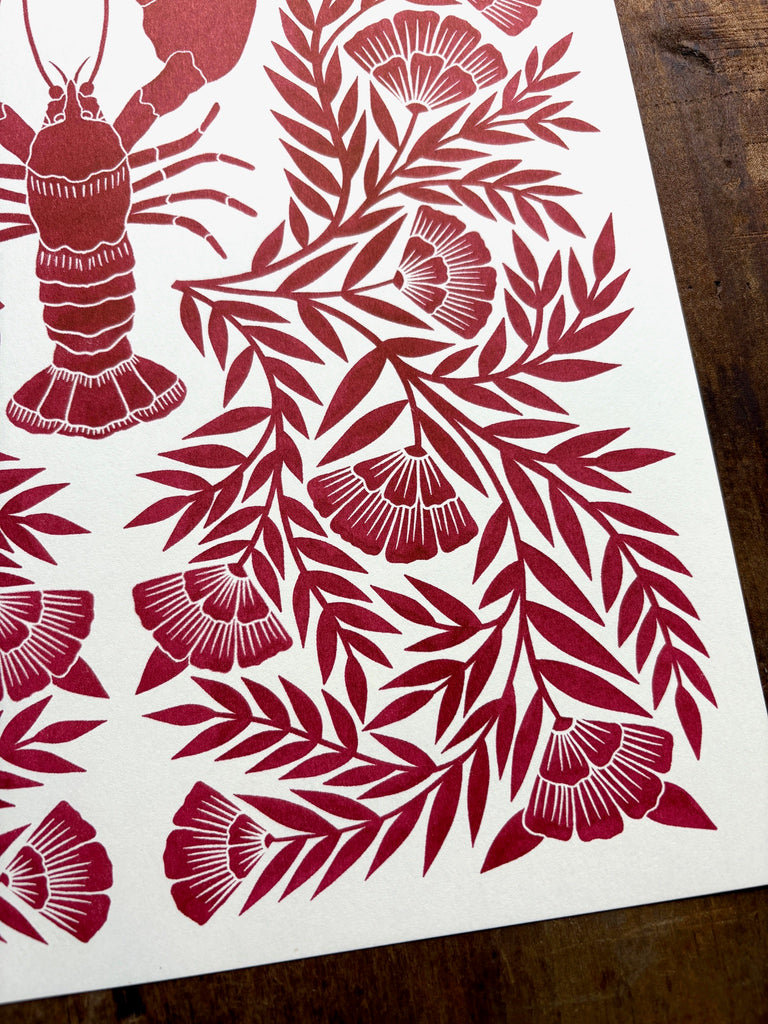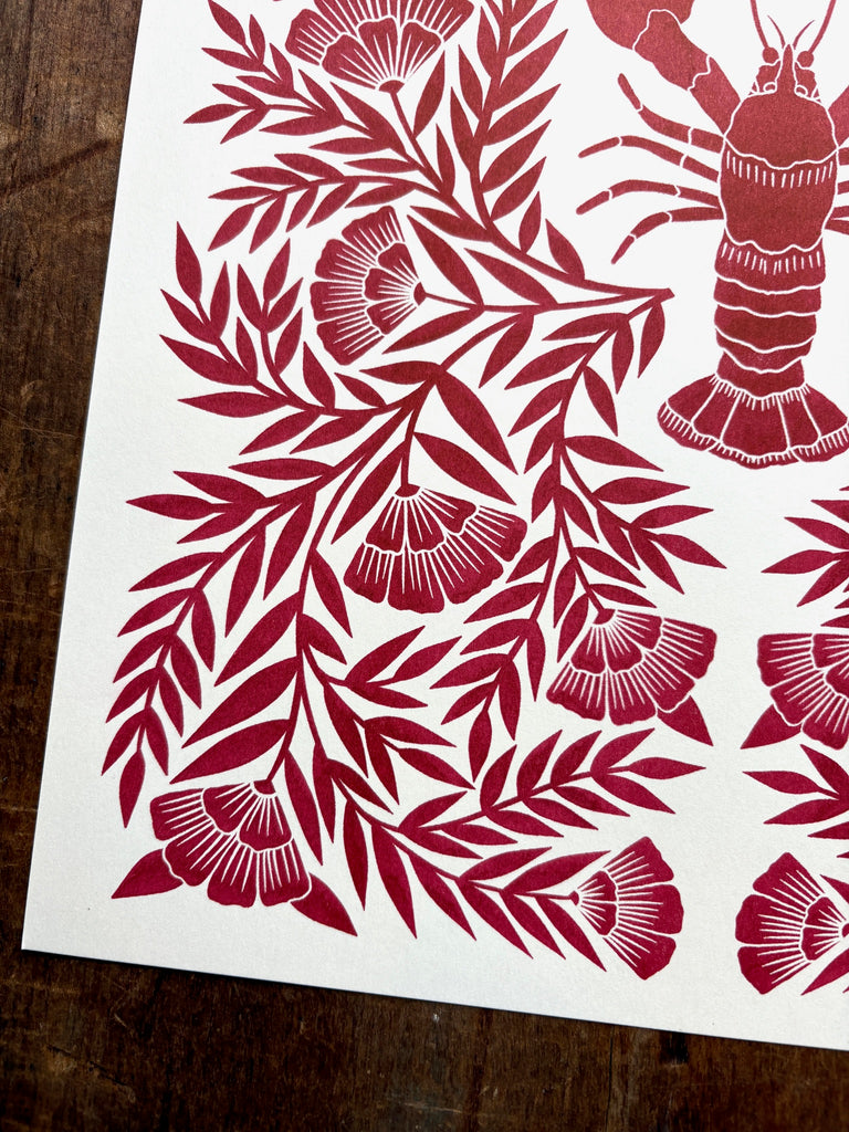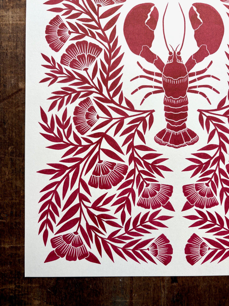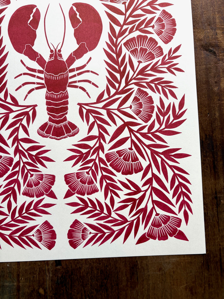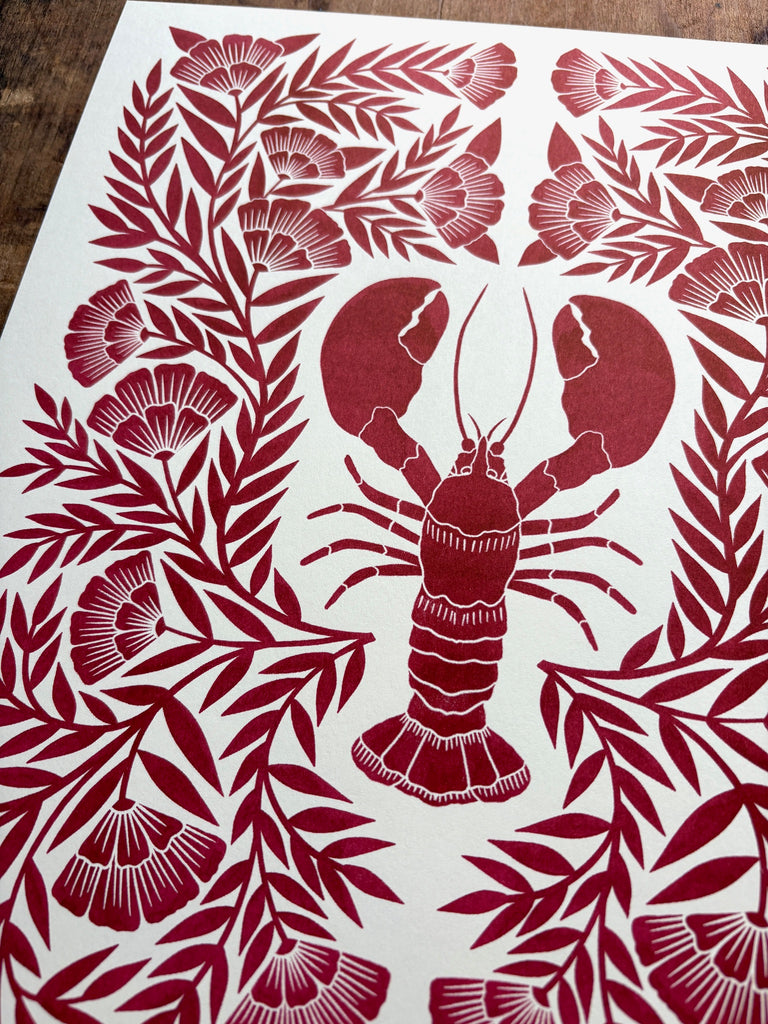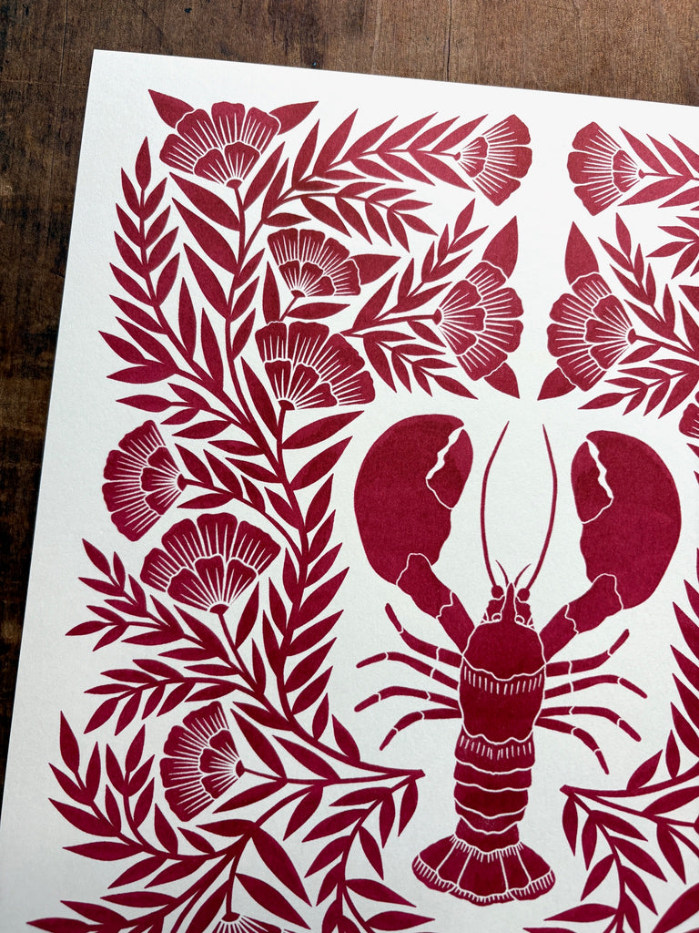 An original Katharine Watson lobster print, risograph printed in deep red.