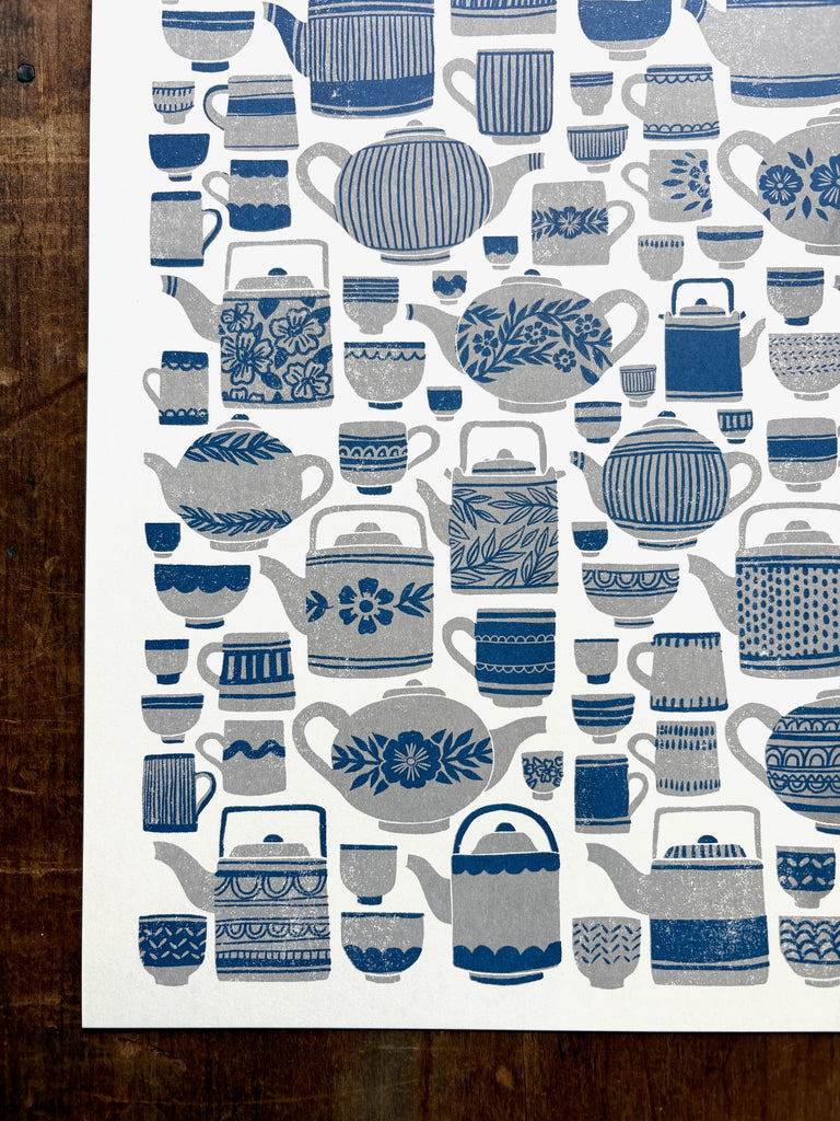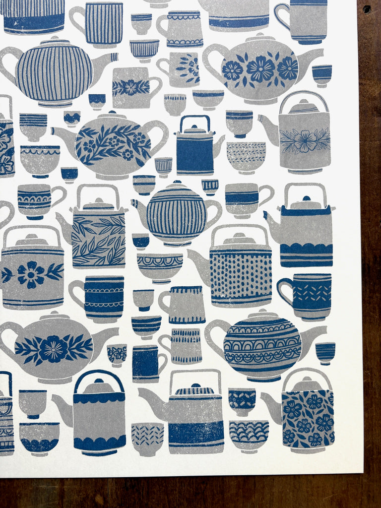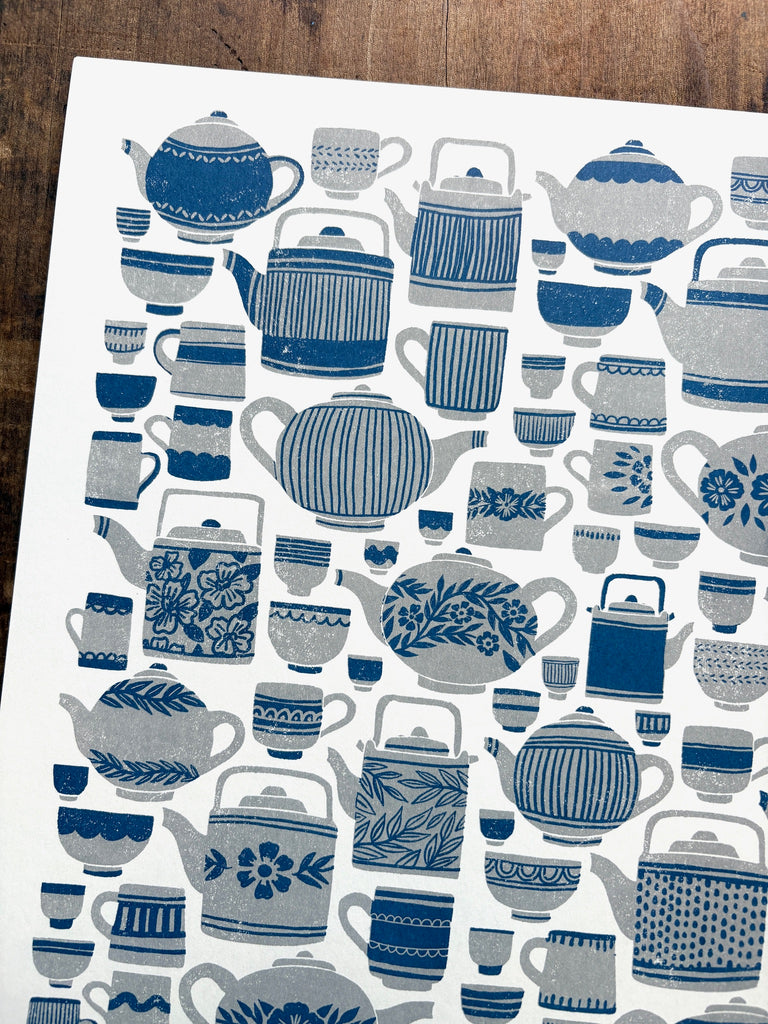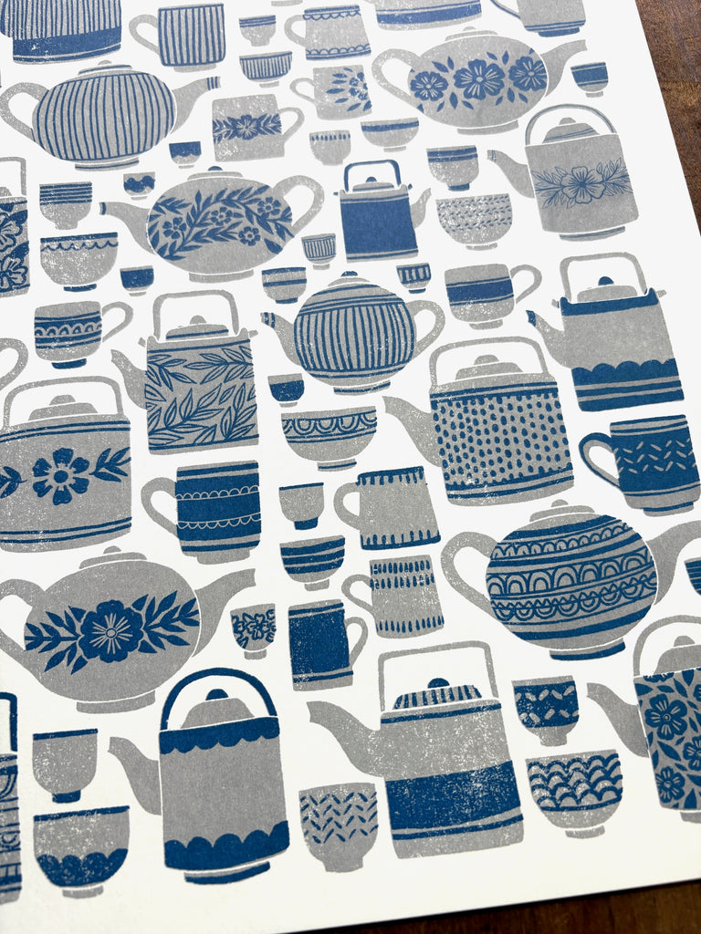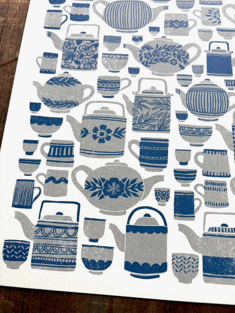 An original Katharine Watson tea set print, risograph printed in grey and blue.