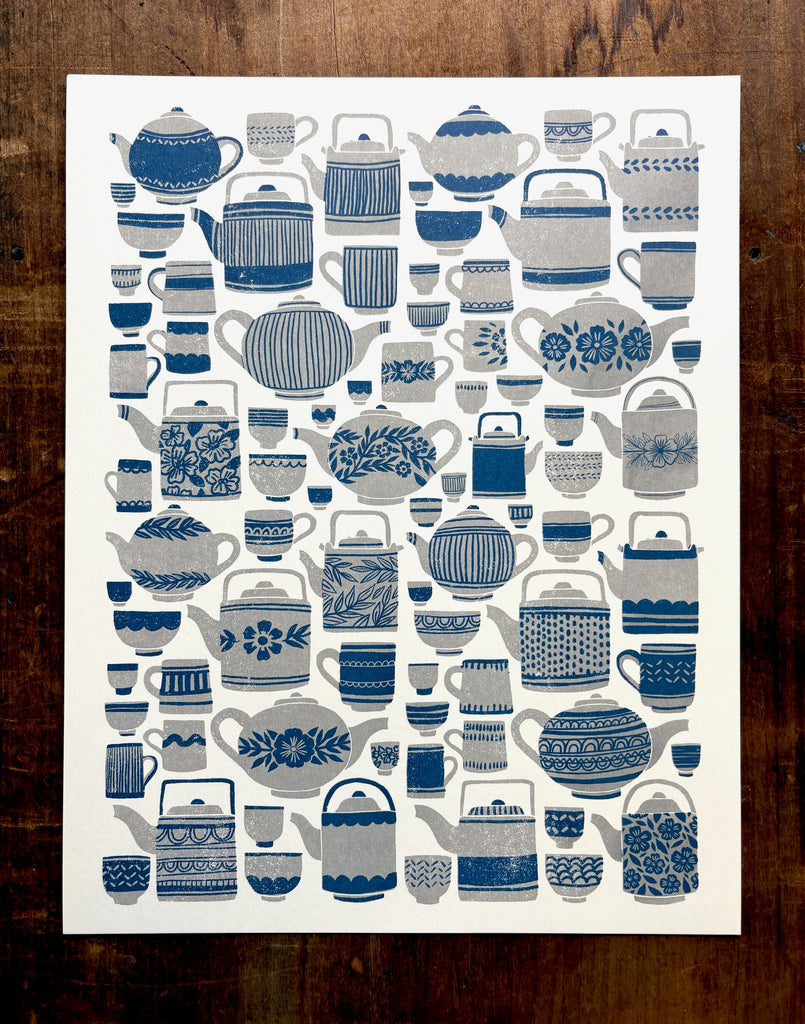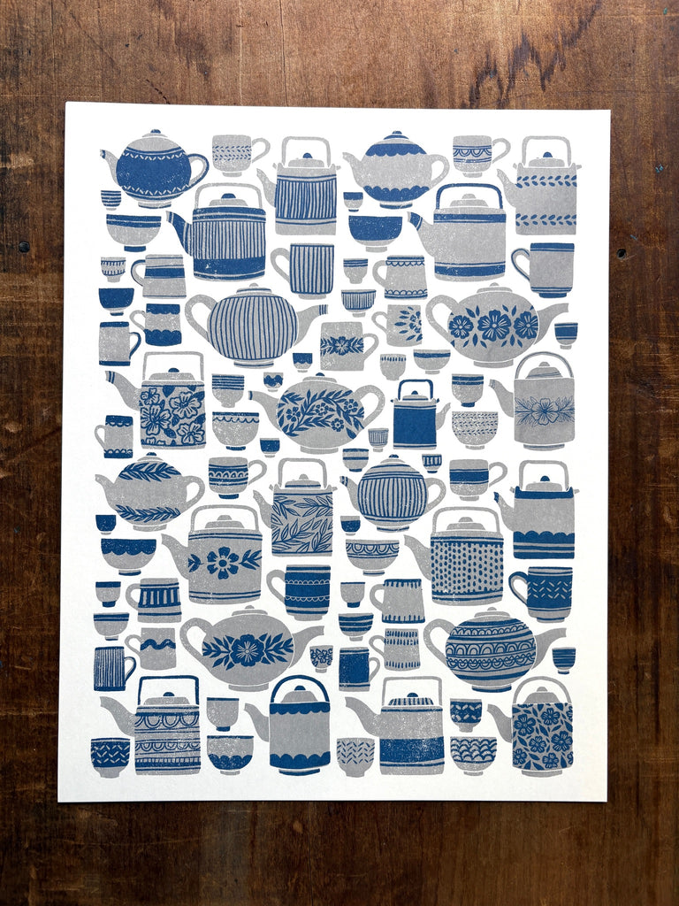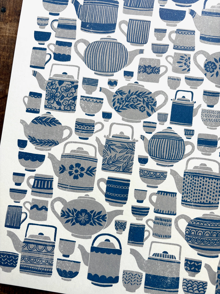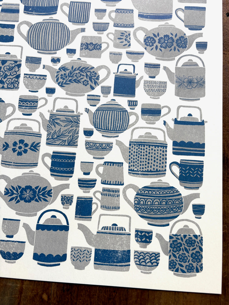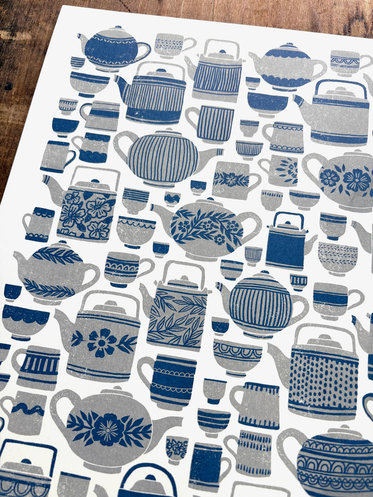 An original Katharine Watson tea set print, risograph printed in grey and blue.