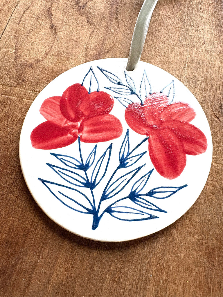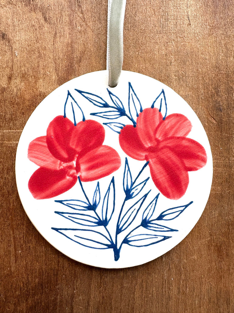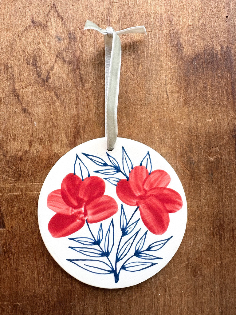This ceramic ornament features an original hand-painted design by Katharine Watson. The ornament is glazed on the front and unglazed on the back.