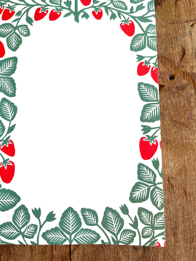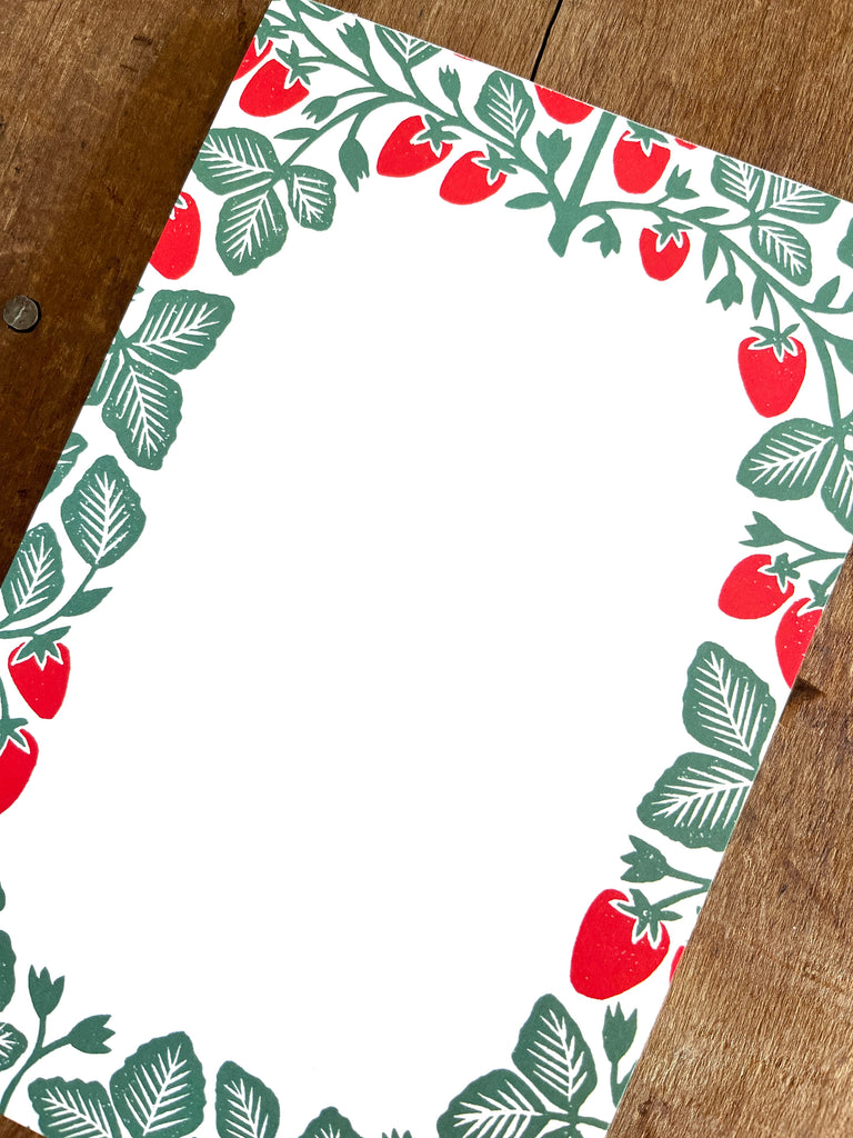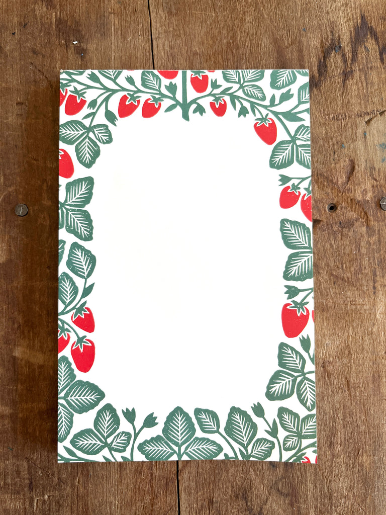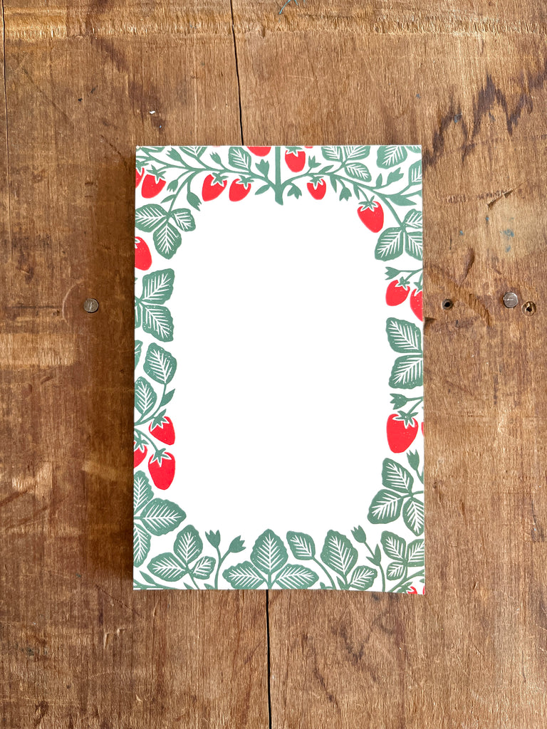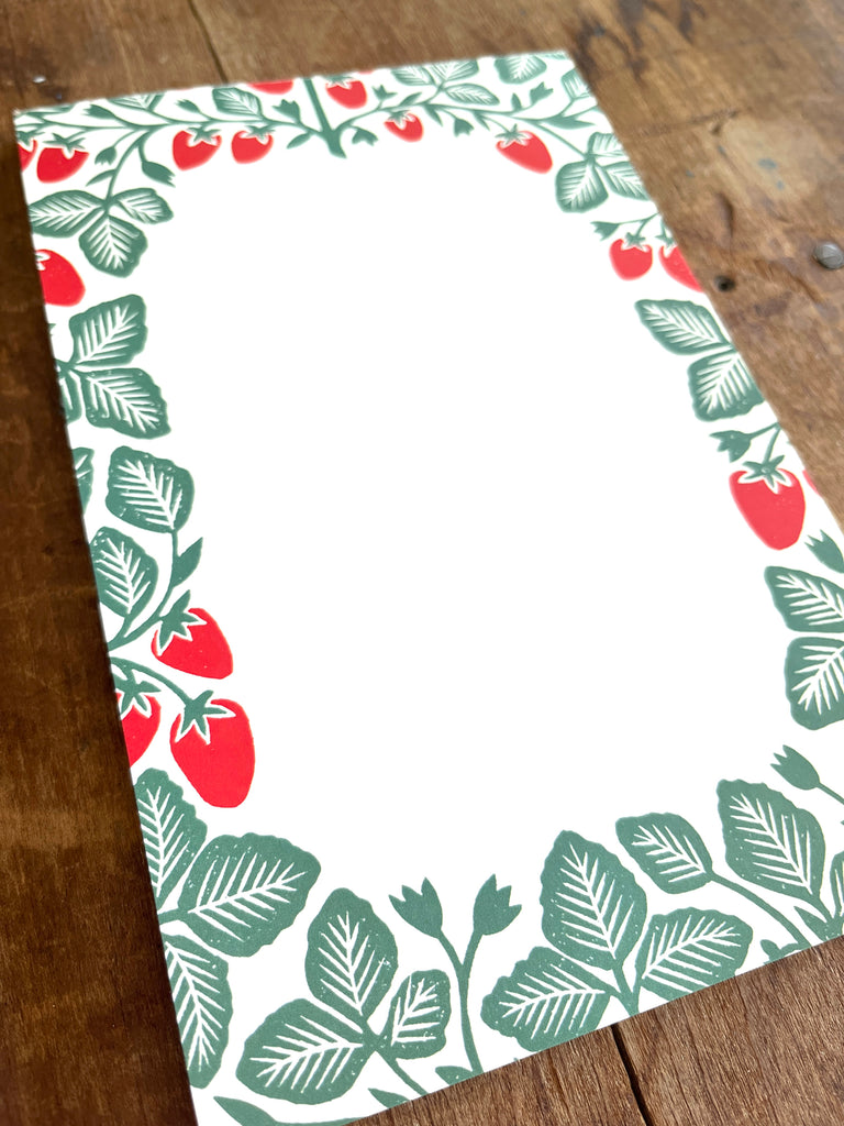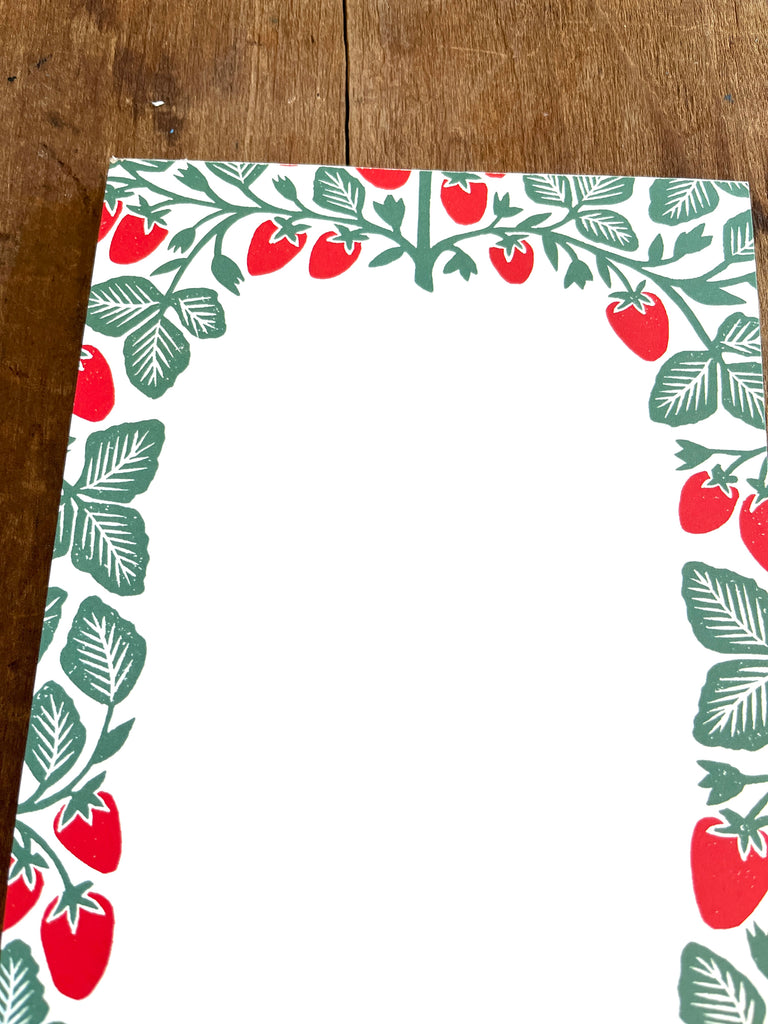 A Katharine Watson strawberry print notepad, perfect for grocery lists or note-taking.