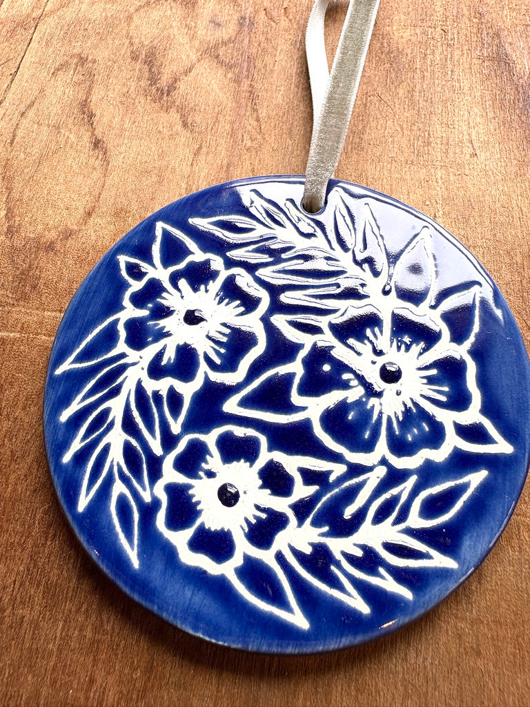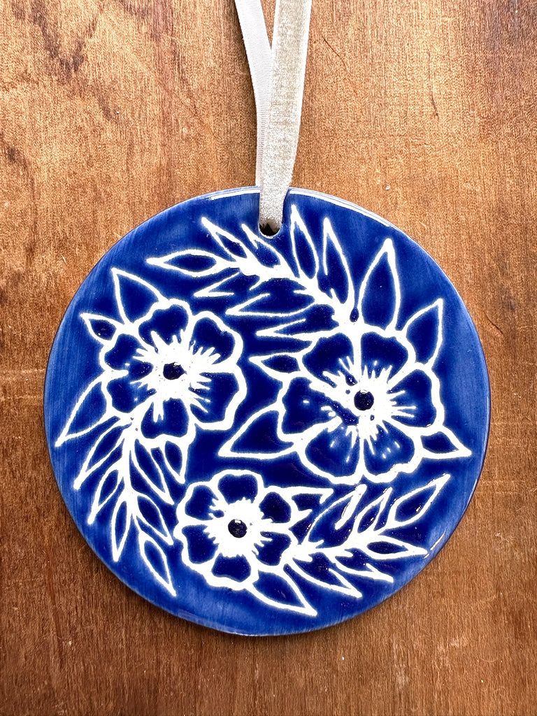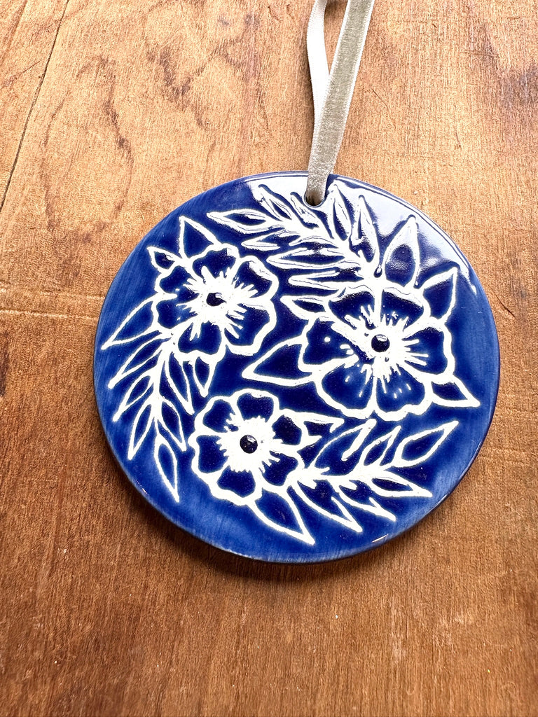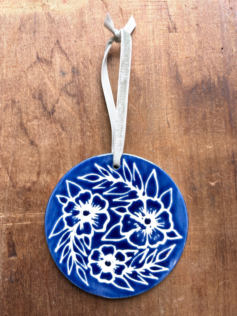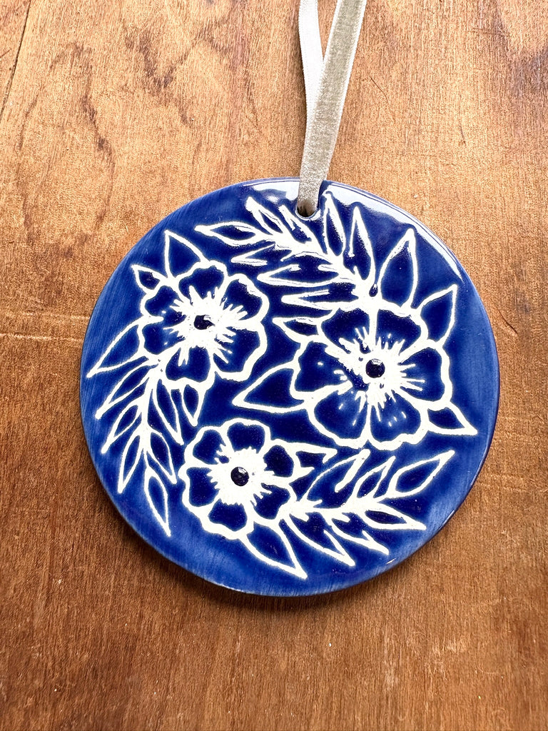 This ceramic ornament features an original hand-painted design by Katharine Watson. The ornament is glazed on the front and unglazed on the back.