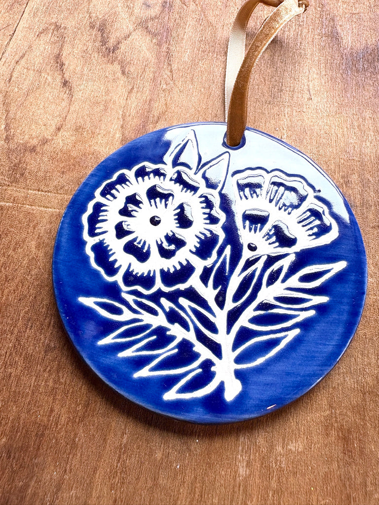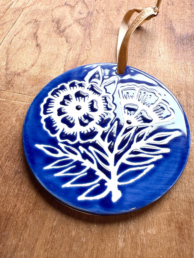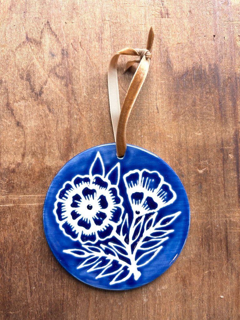 This ceramic ornament features an original hand-painted design by Katharine Watson. The ornament is glazed on the front and unglazed on the back.