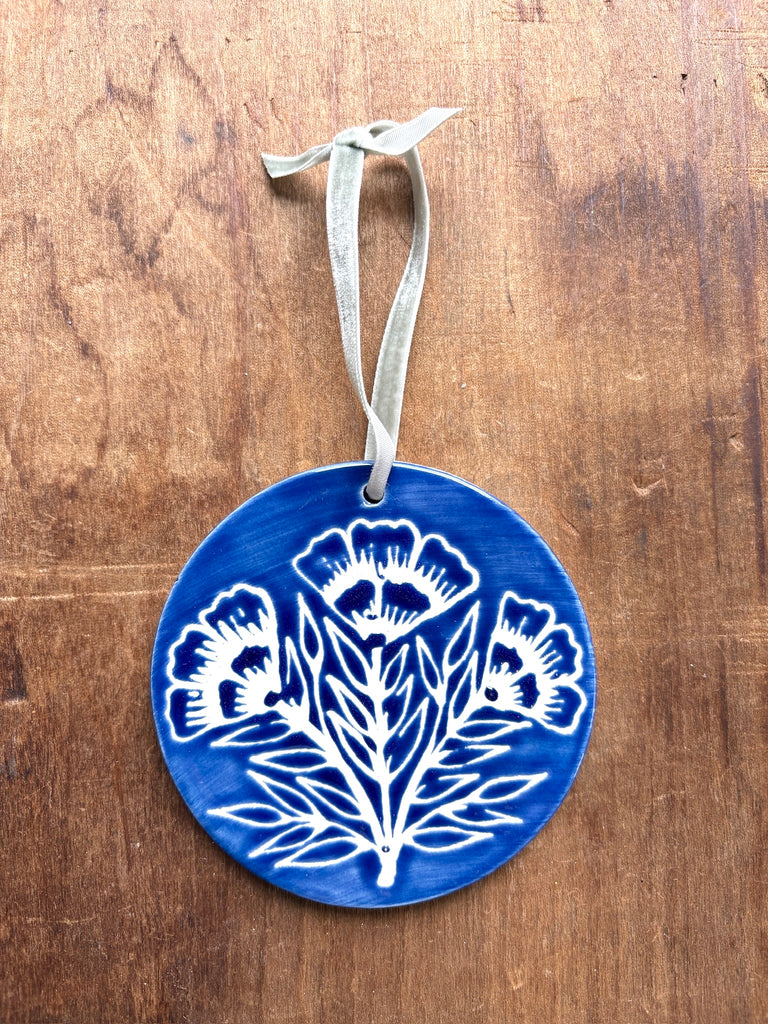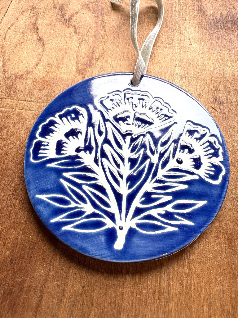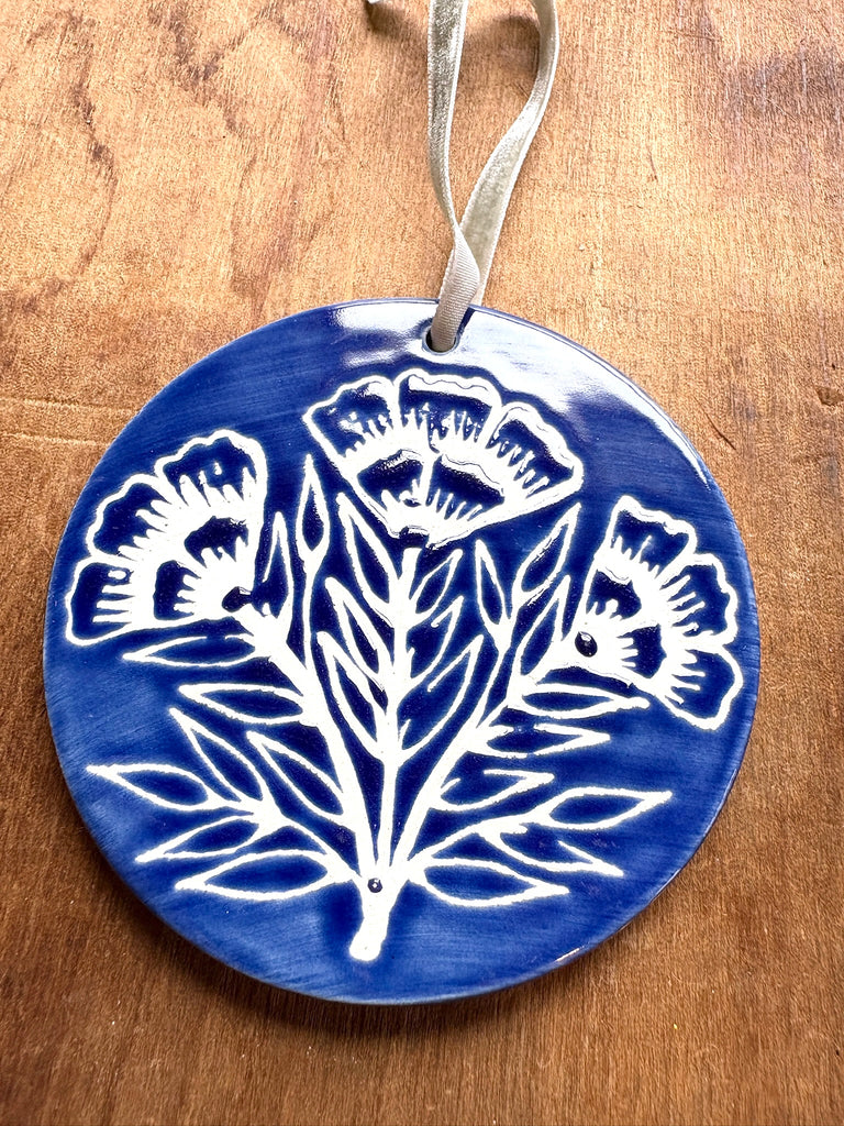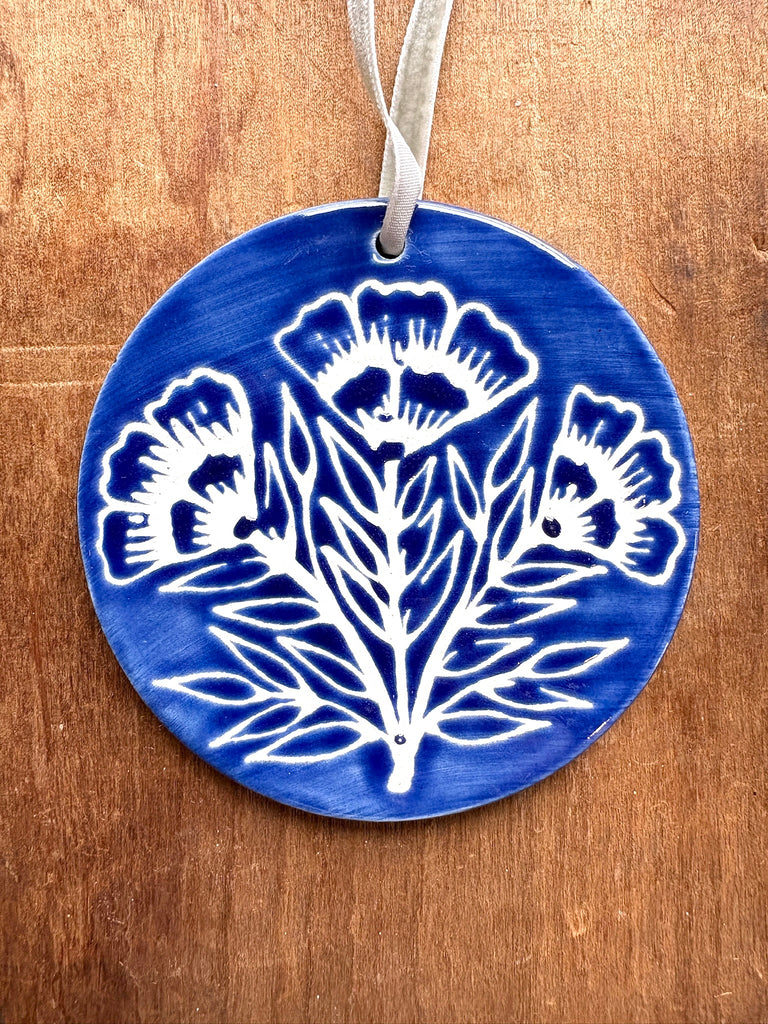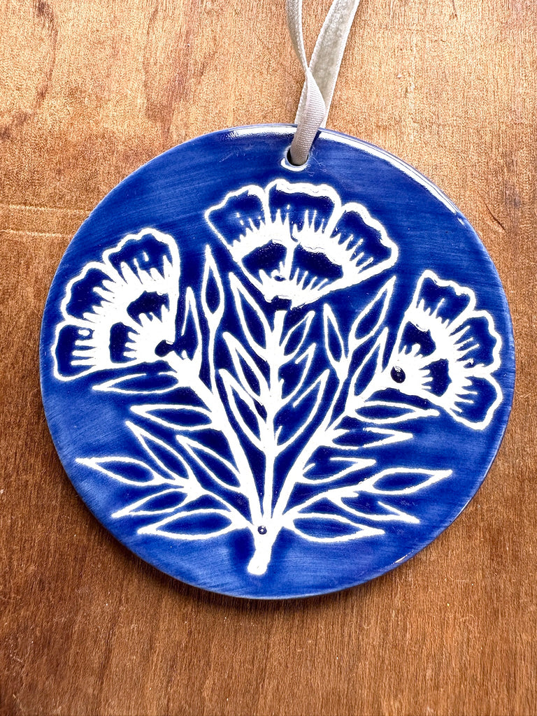 This ceramic ornament features an original hand-painted design by Katharine Watson. The ornament is glazed on the front and unglazed on the back.