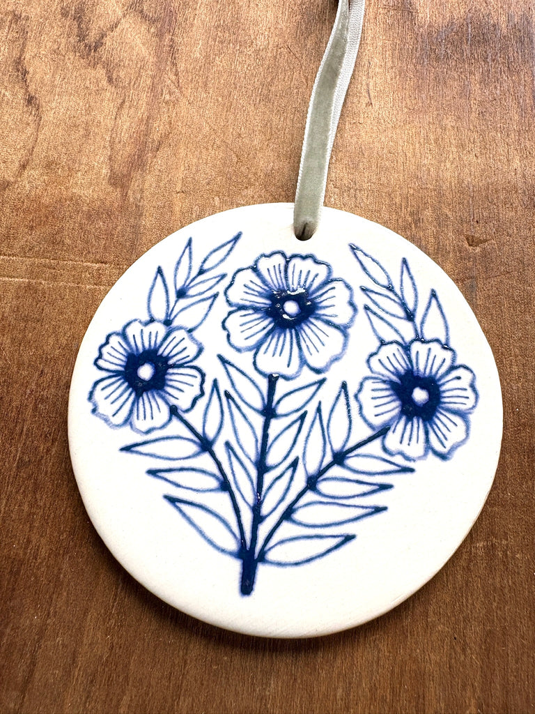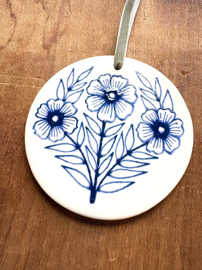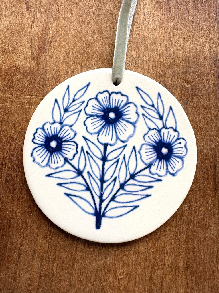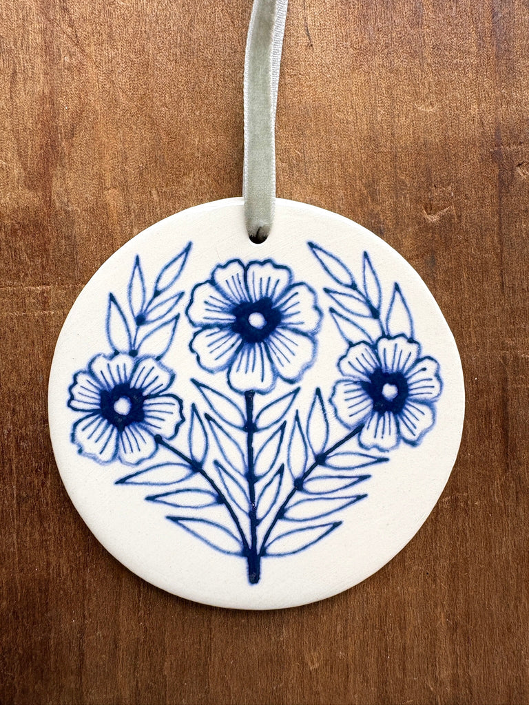 This ceramic ornament features an original hand-painted design by Katharine Watson. The ornament is glazed on the front and unglazed on the back.