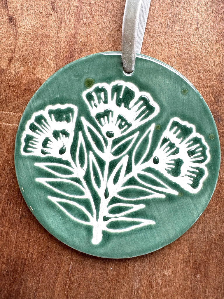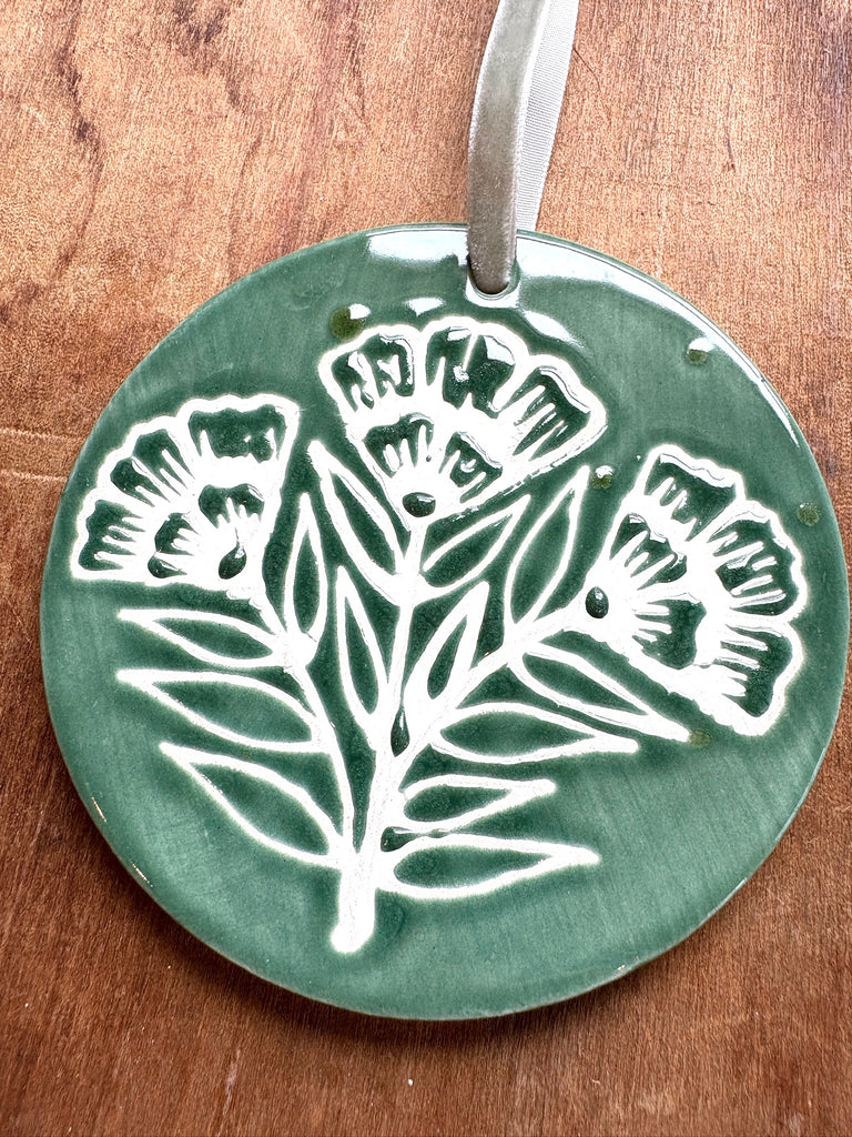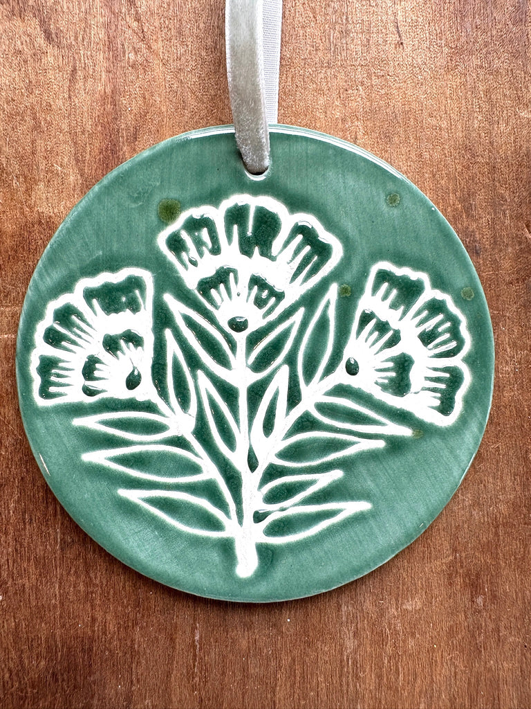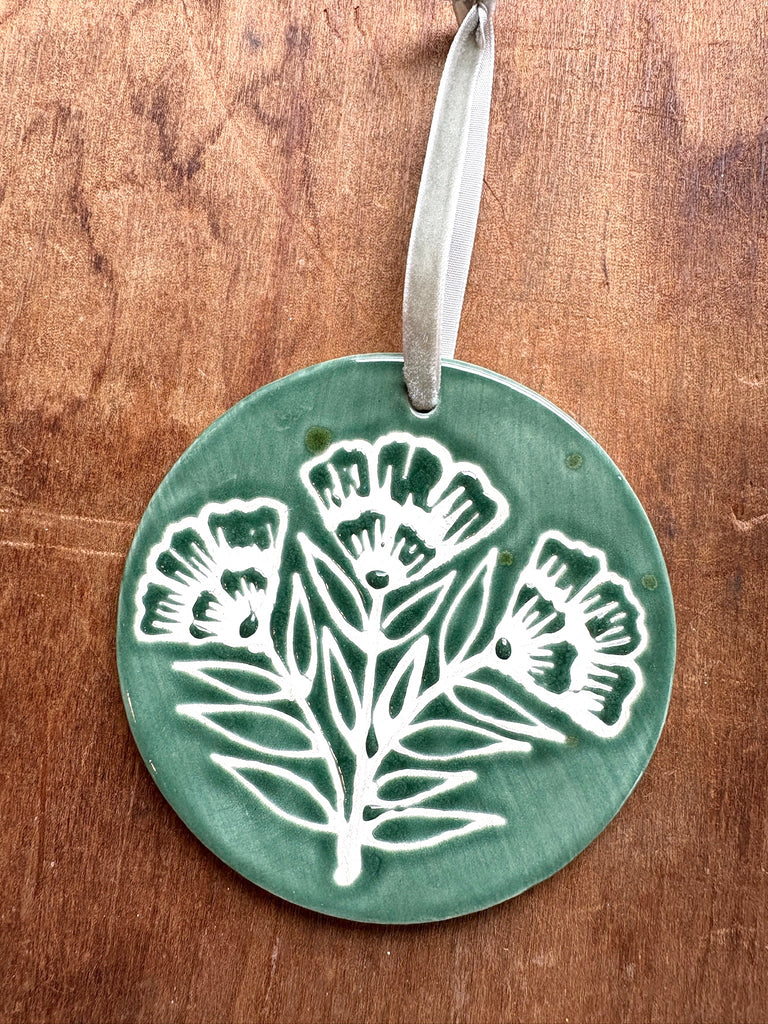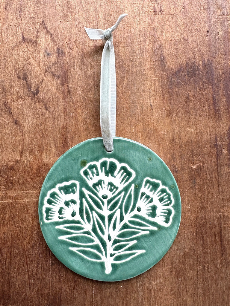 This ceramic ornament features an original hand-painted design by Katharine Watson. The ornament is glazed on the front and unglazed on the back.