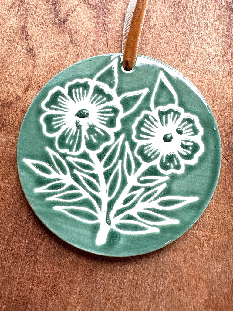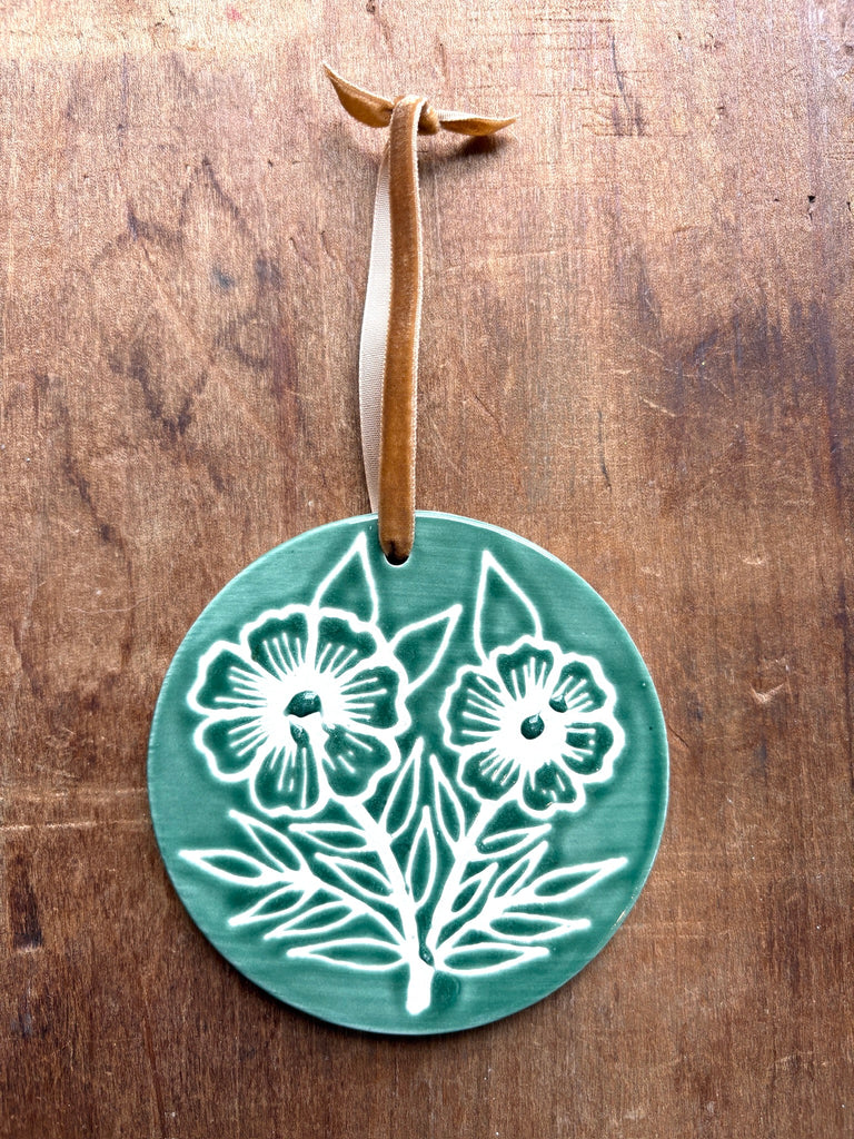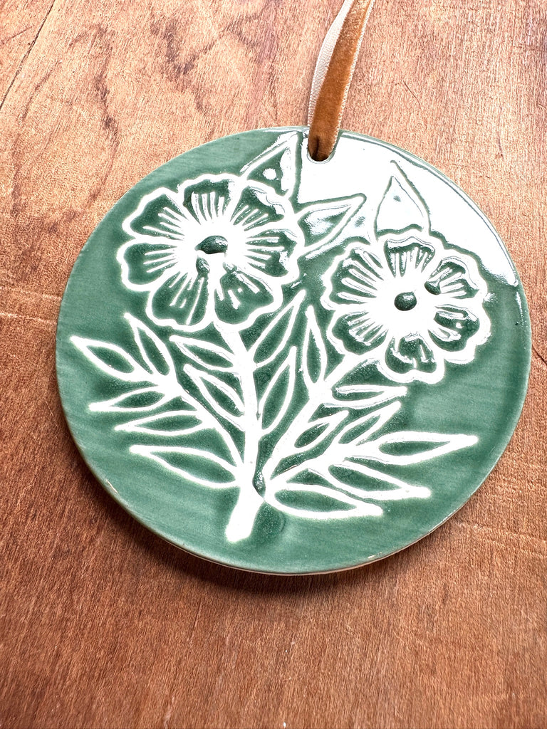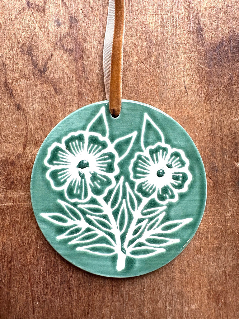 This ceramic ornament features an original hand-painted design by Katharine Watson. The ornament is glazed on the front and unglazed on the back.