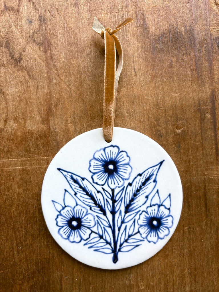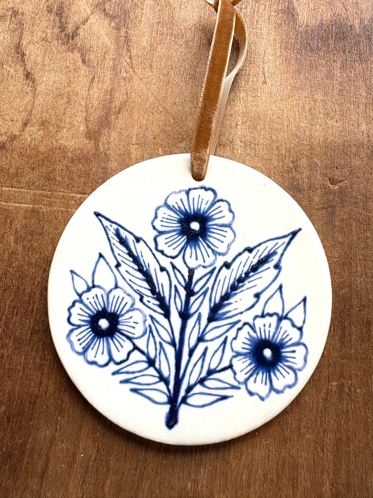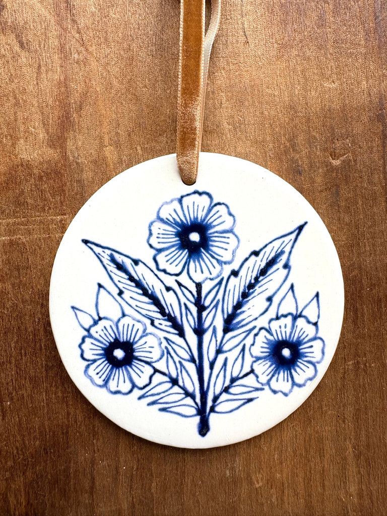 This ceramic ornament features an original hand-painted design by Katharine Watson. The ornament is glazed on the front and unglazed on the back.