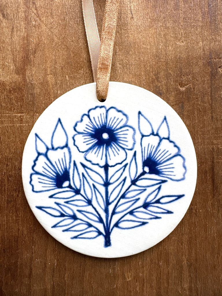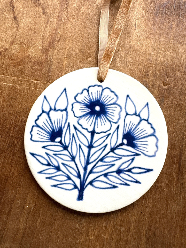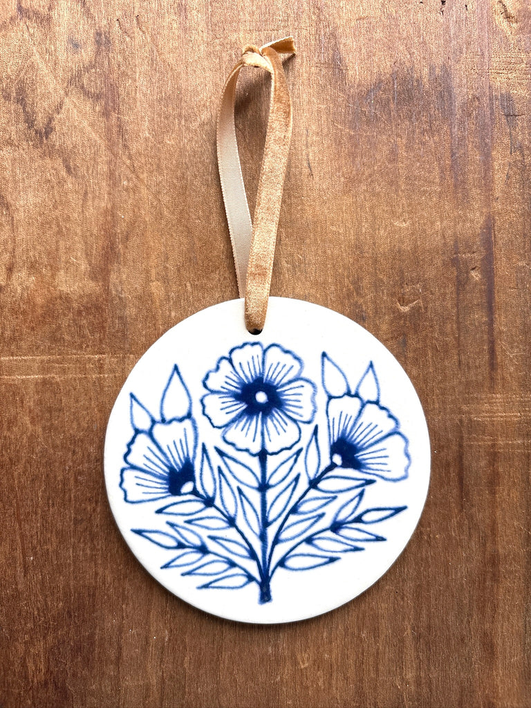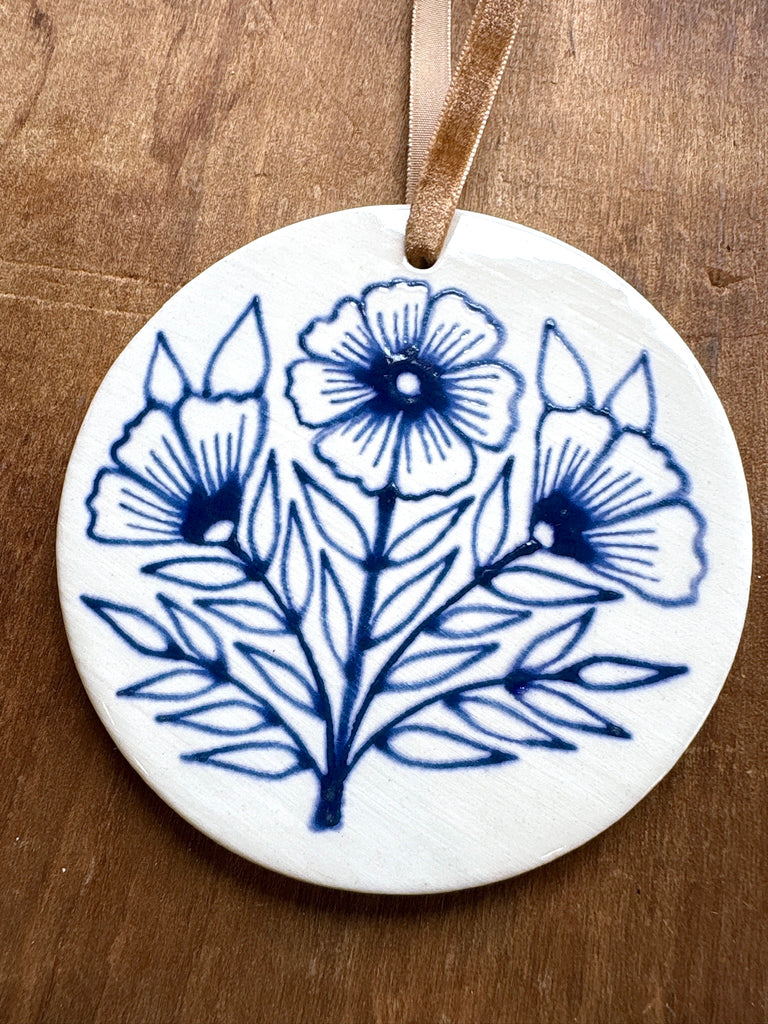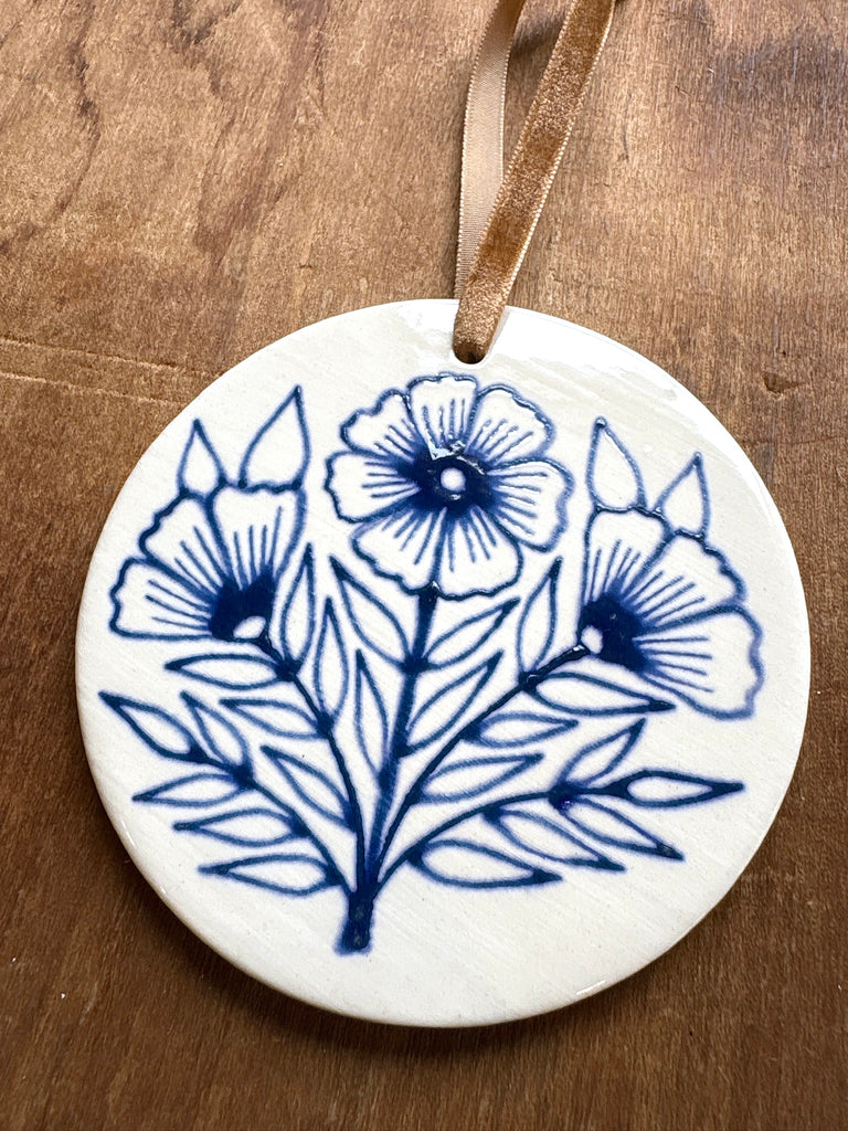 This ceramic ornament features an original hand-painted design by Katharine Watson. The ornament is glazed on the front and unglazed on the back.