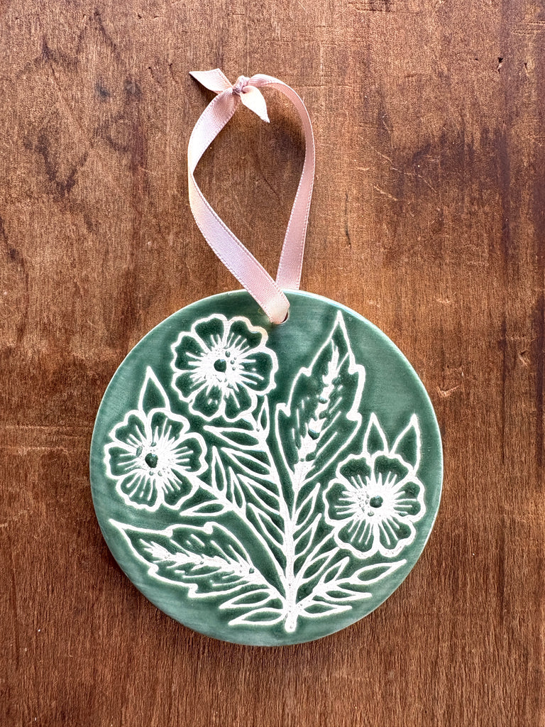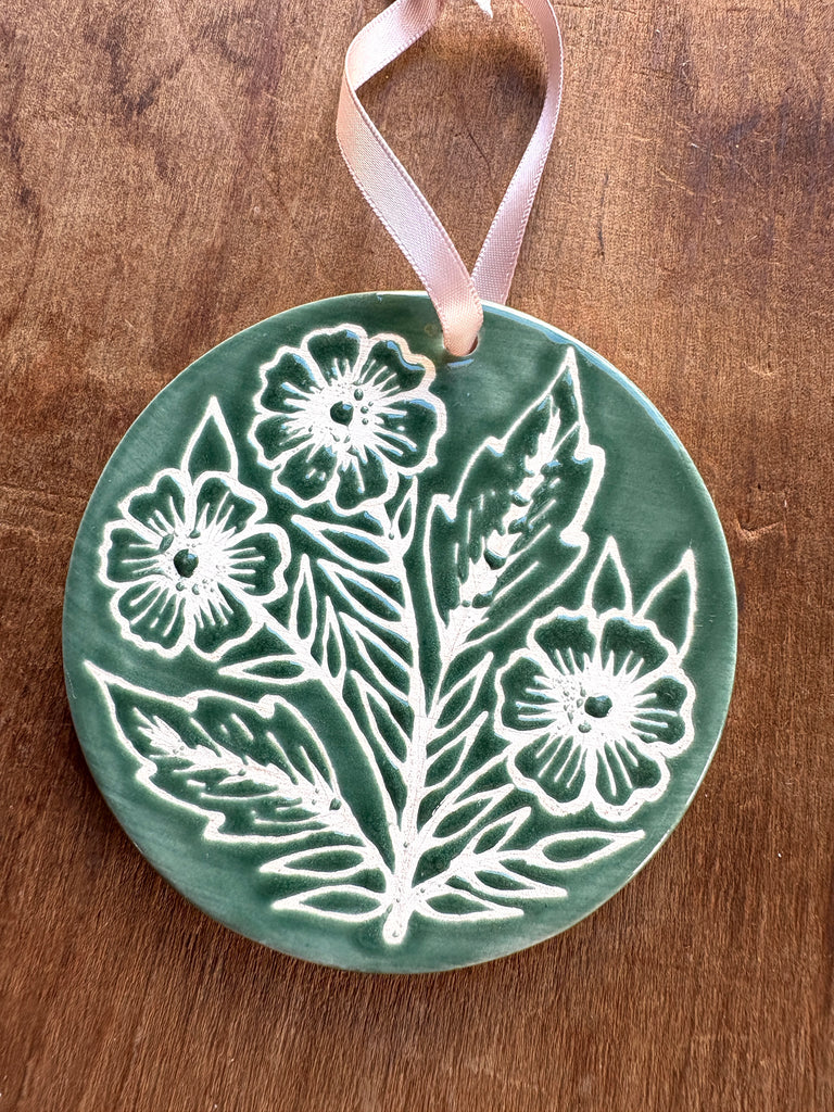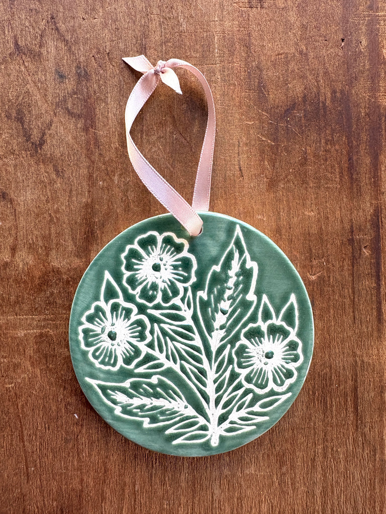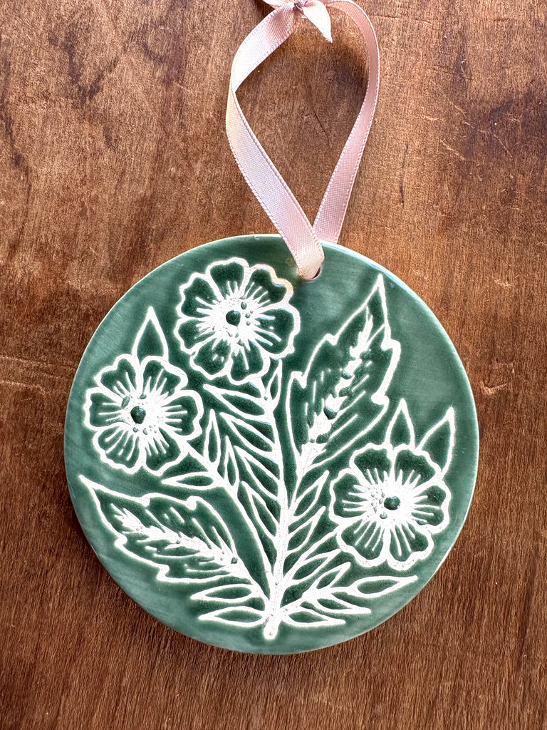 This ceramic ornament features an original hand-painted design by Katharine Watson. The ornament is glazed on the front and unglazed on the back.