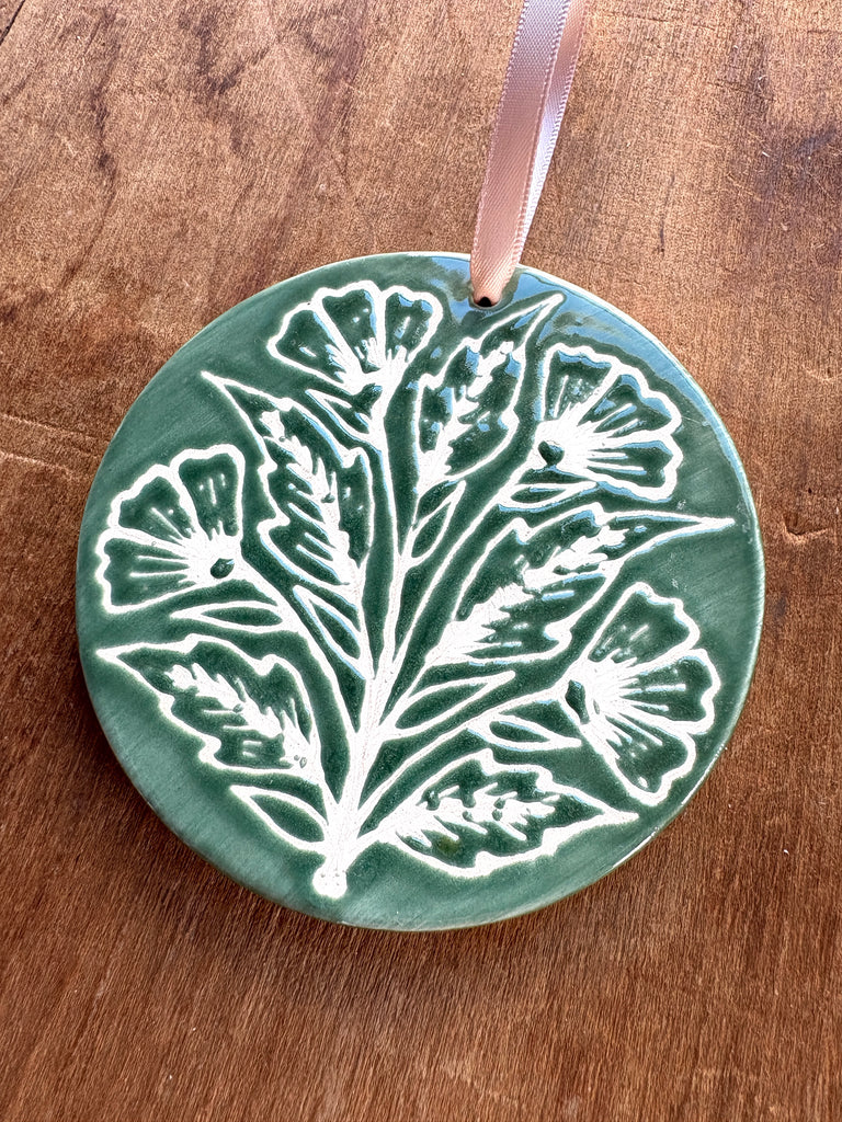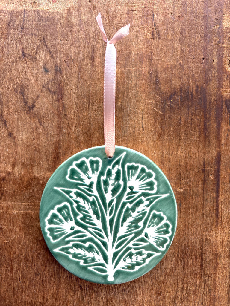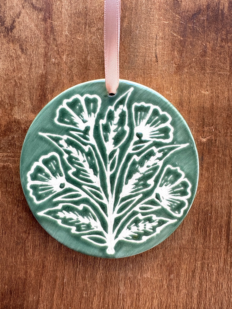 This ceramic ornament features an original hand-painted design by Katharine Watson. The ornament is glazed on the front and unglazed on the back.