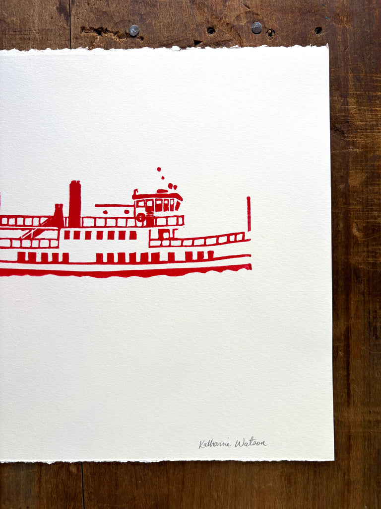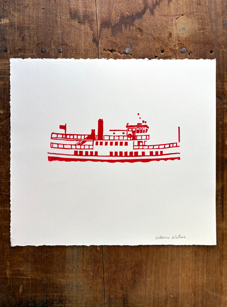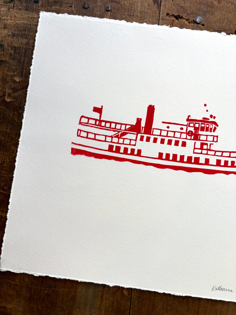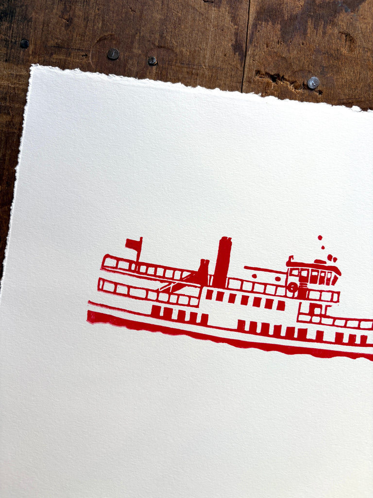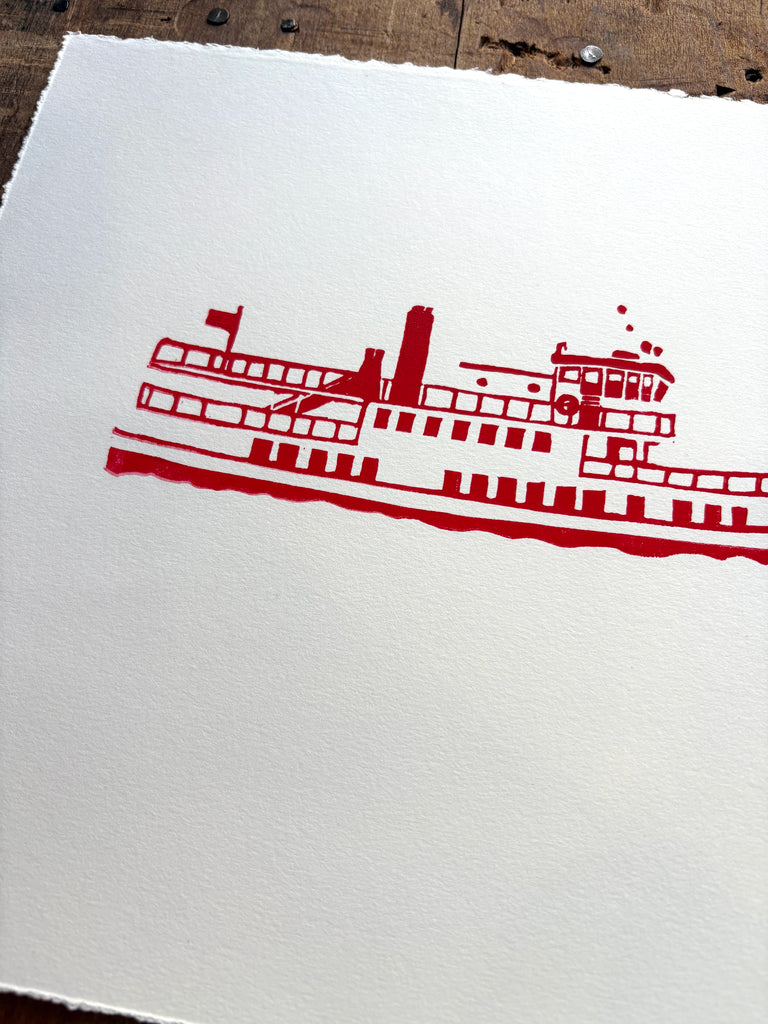 This print is a single color layer from our Casco Bay Ferry Reduction Print series. It's a single layer of red ink on cream paper.