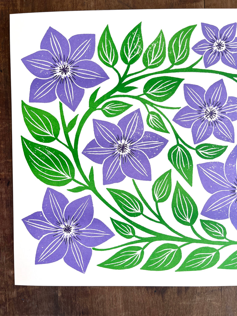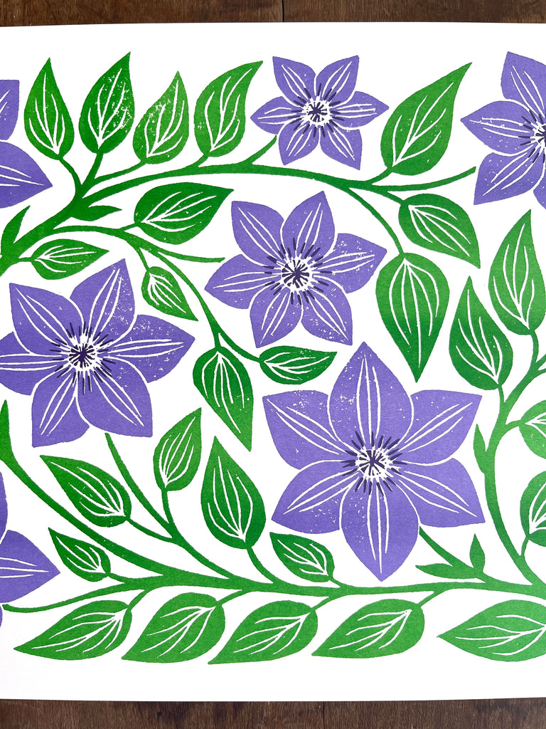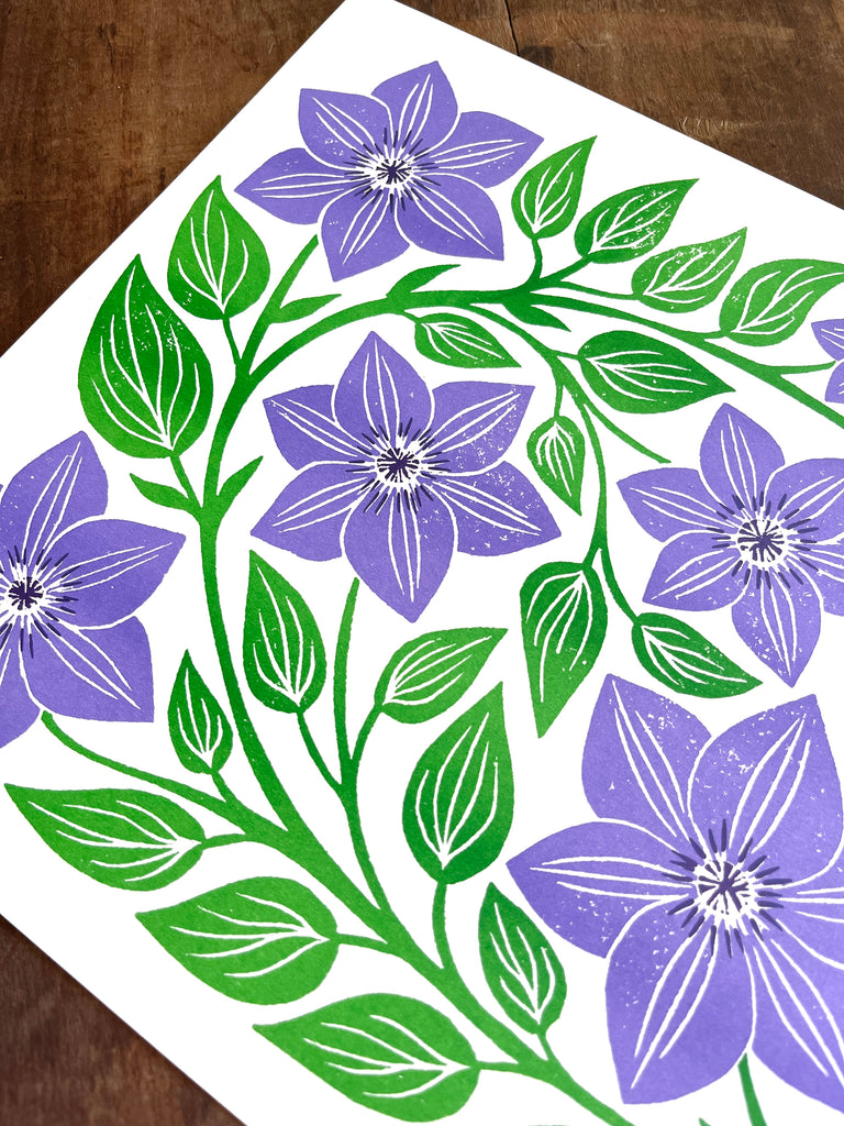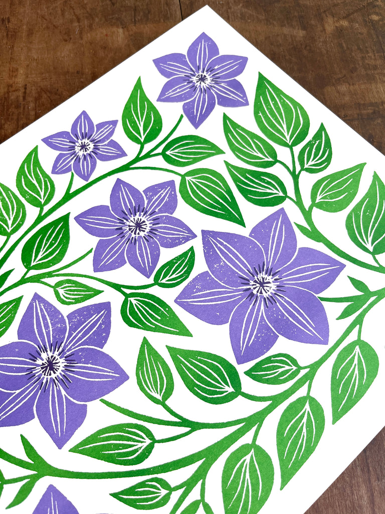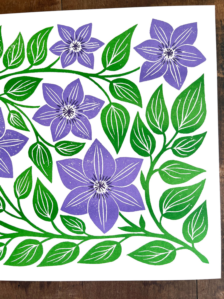 An original Katharine Watson clematis print, risograph printed in a vibrant purple and green color palette on cream paper.