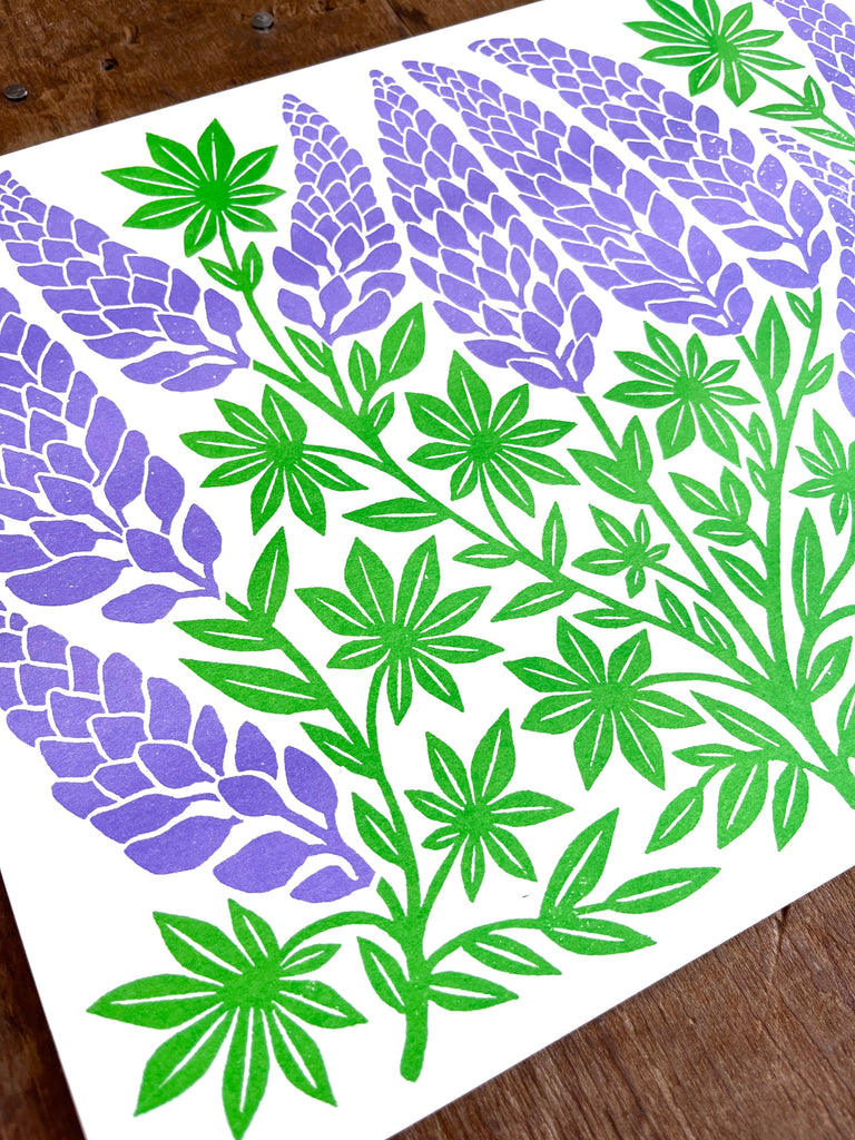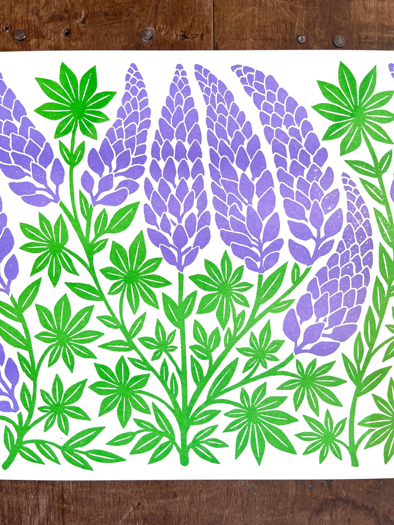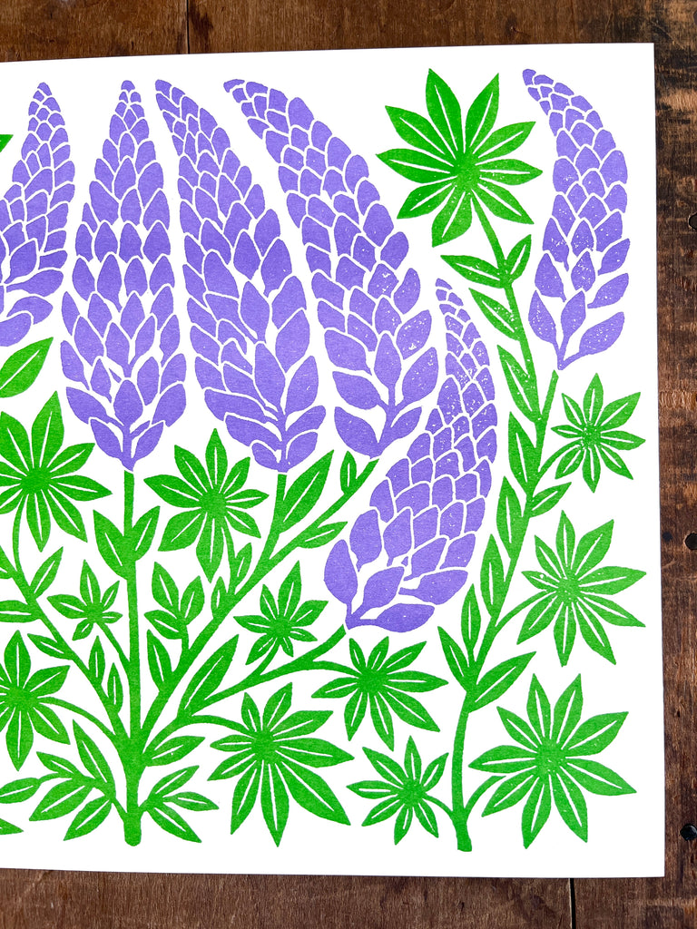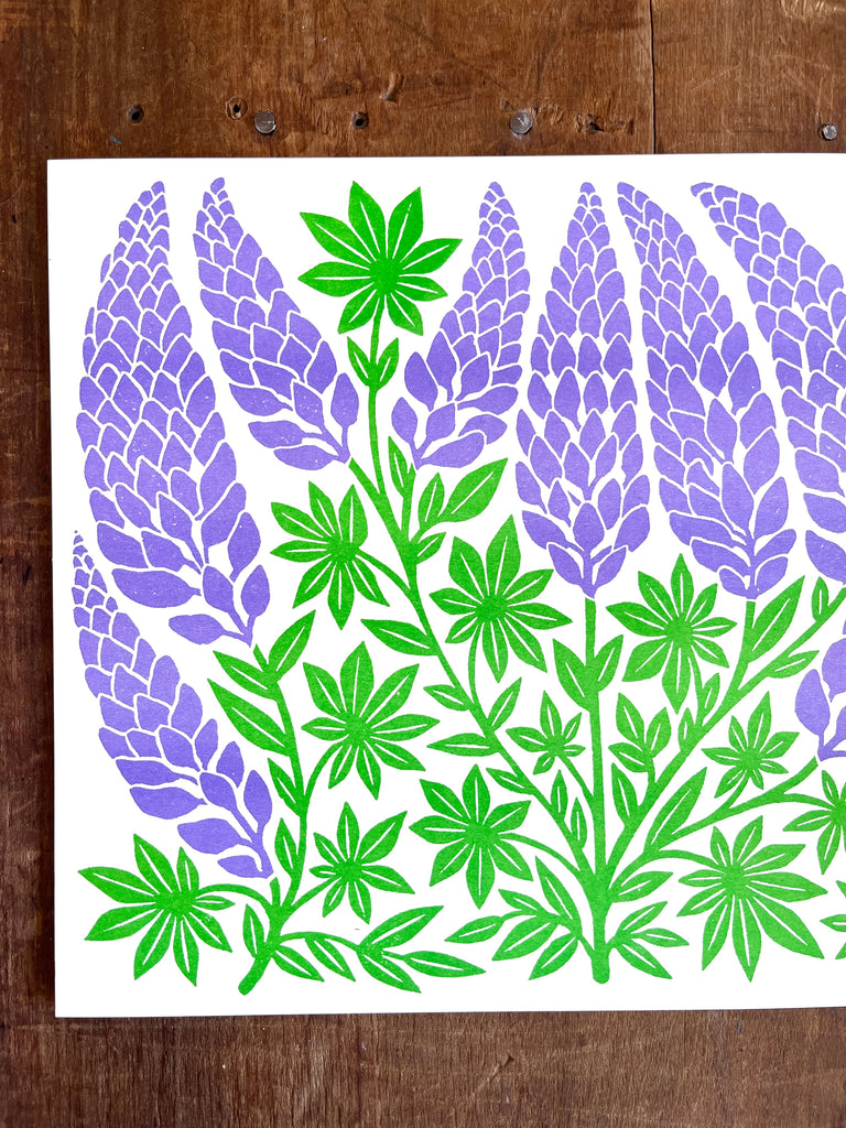 An original Katharine Watson lupines print, risograph printed in a bright color palette of purple and green on cream paper.