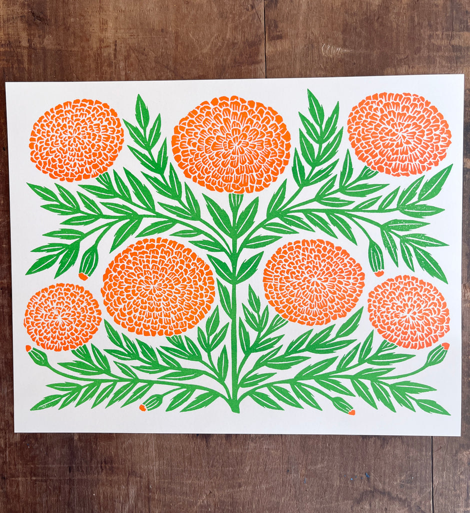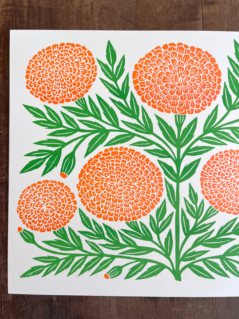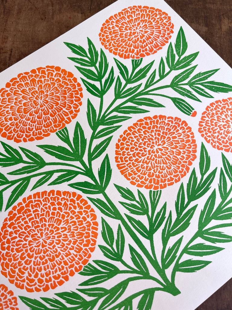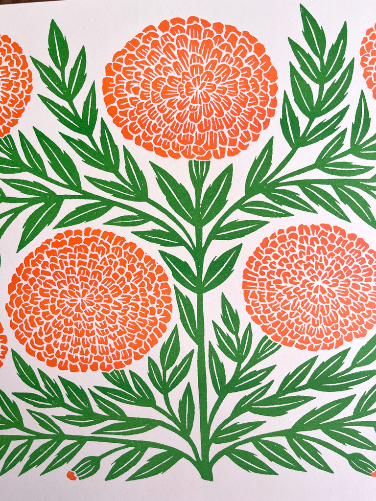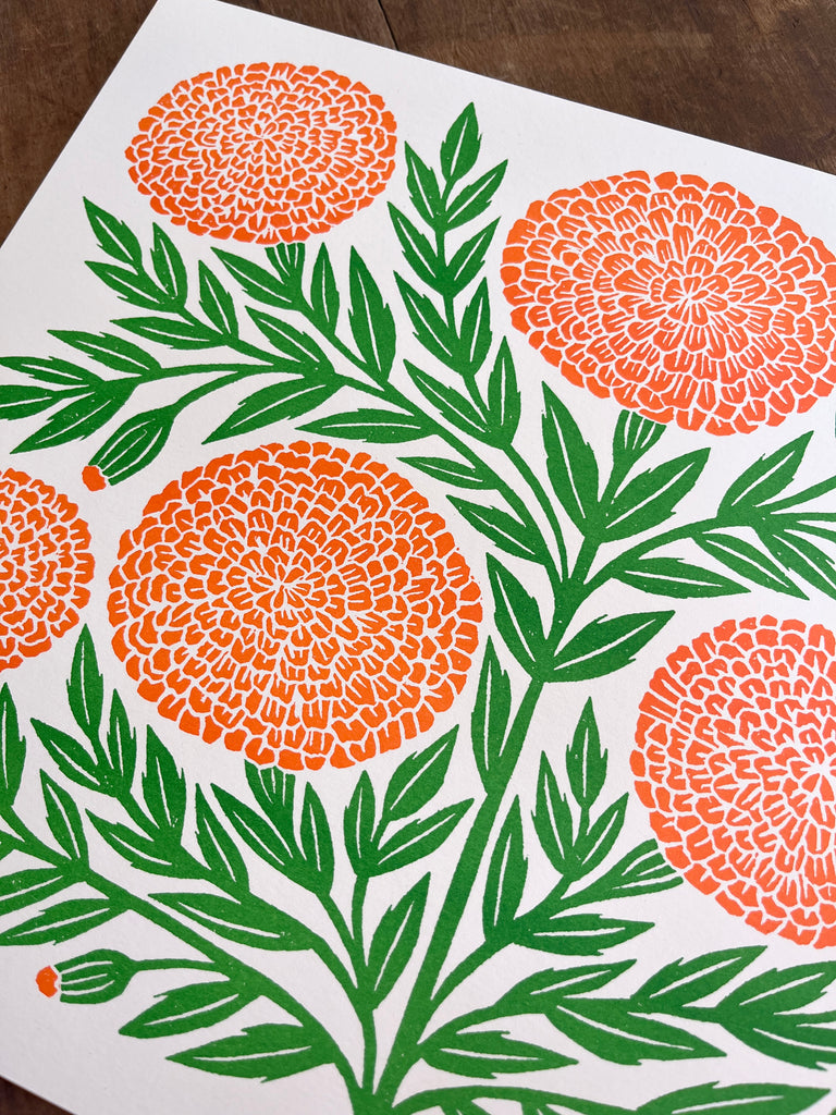 An original Katharine Watson marigold print, risograph printed in a vibrant orange and green color palette on cream paper.