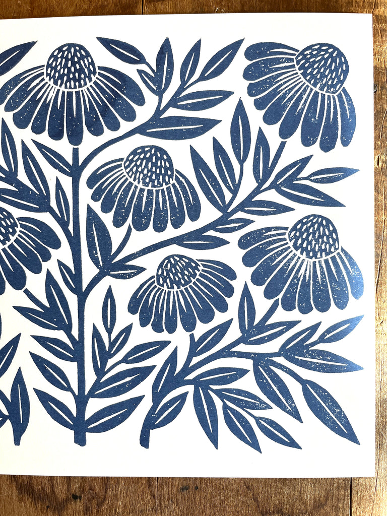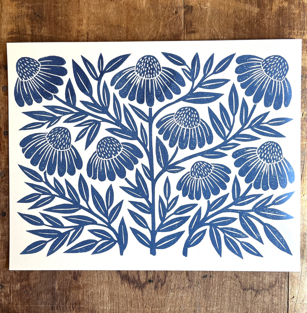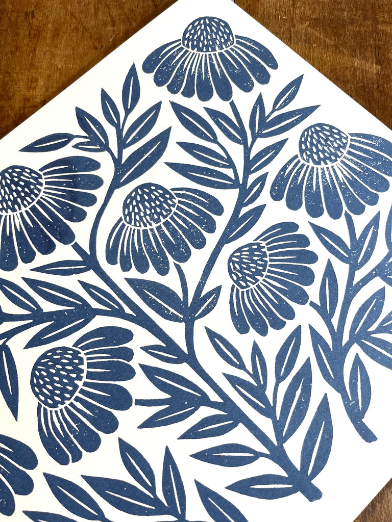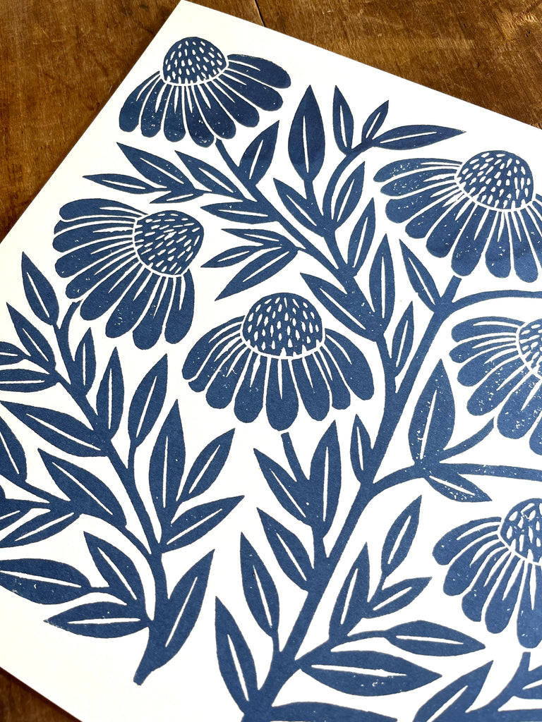 An original Katharine Watson echinacea (coneflower) print, risograph printed in a monochrome navy color palette on cream paper.