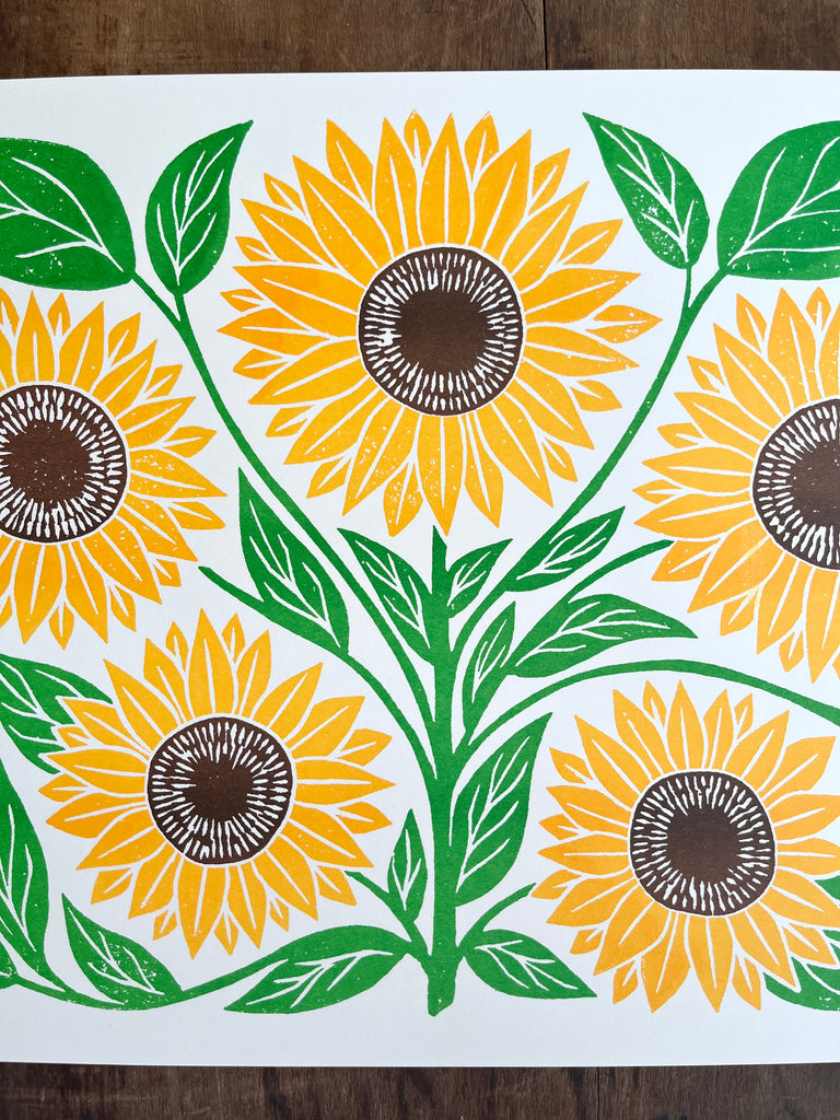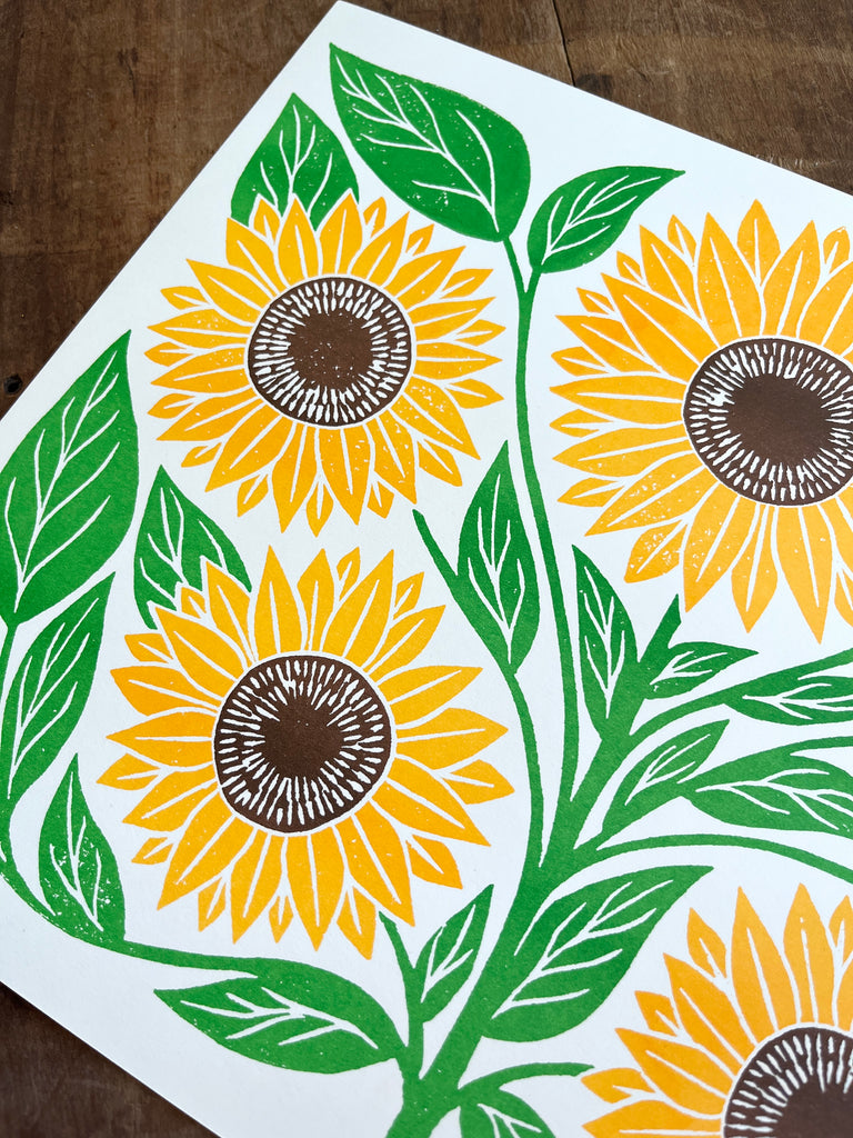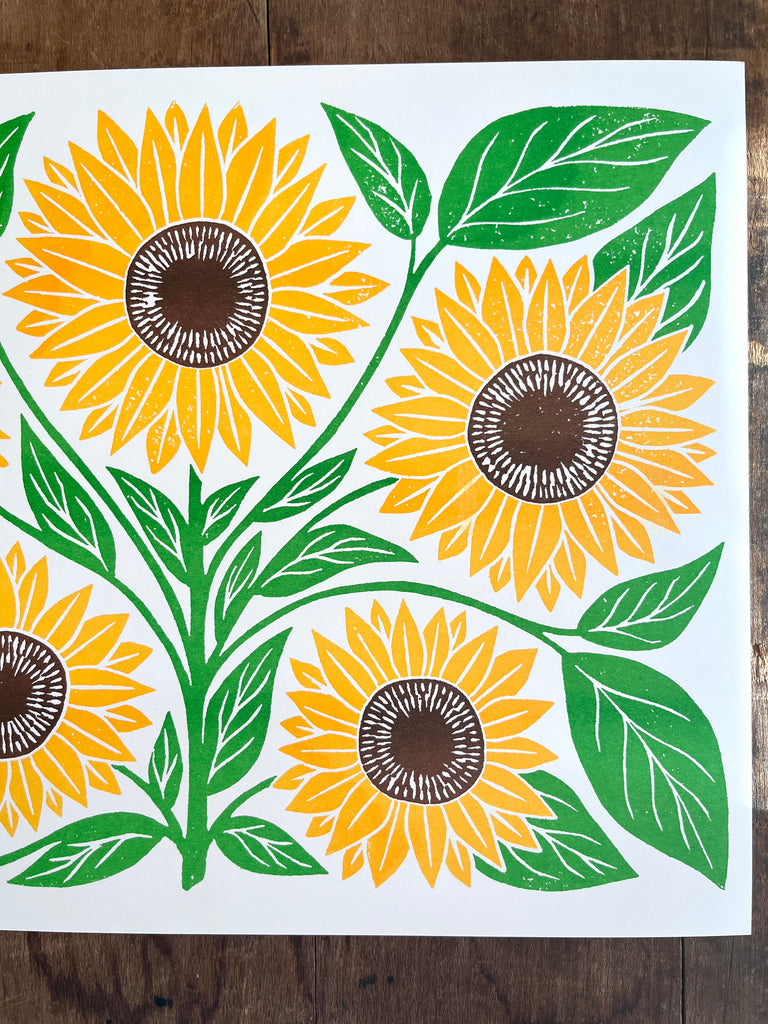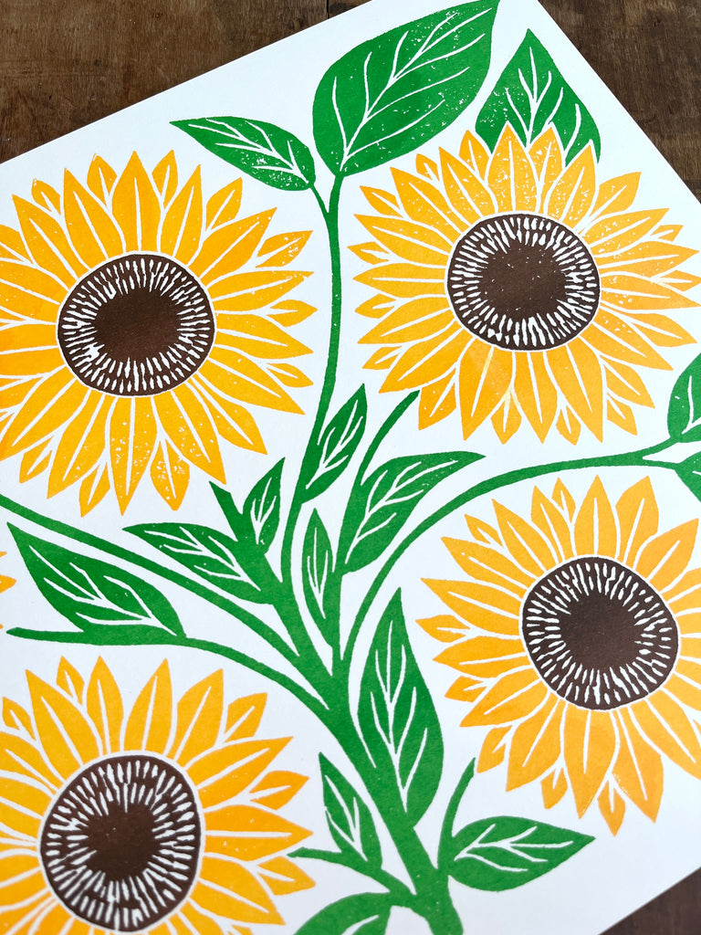 An original Katharine Watson sunflower print, risograph printed in a vibrant color palette of green, yellow, and brown ink on cream paper.
