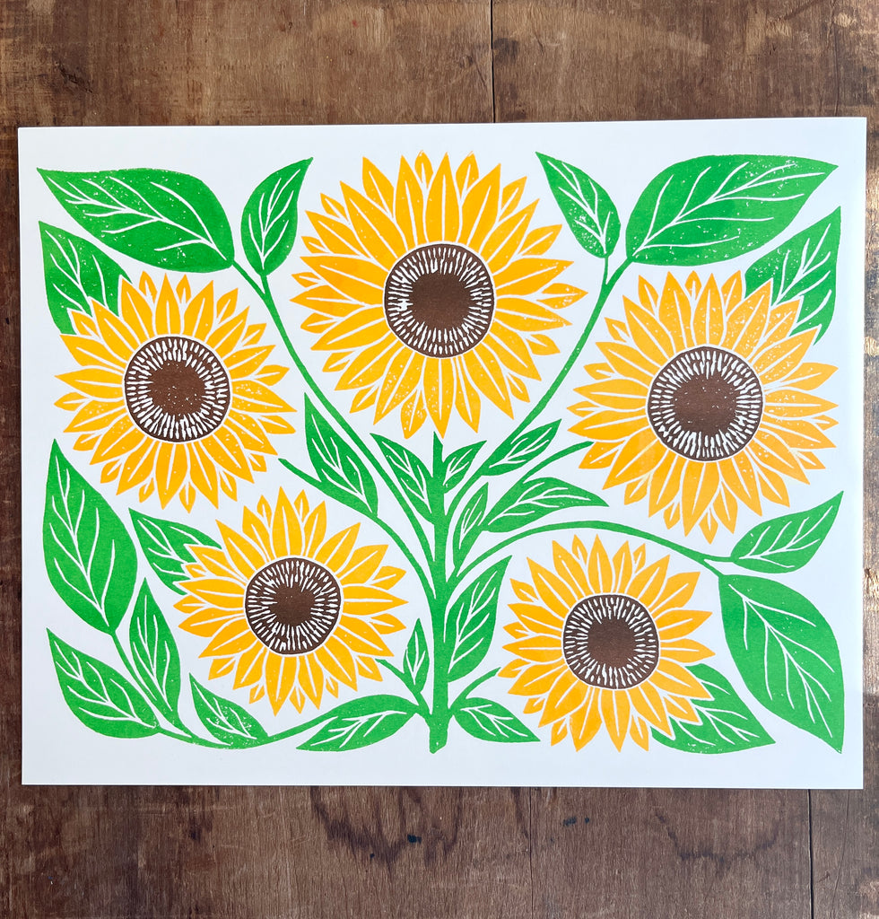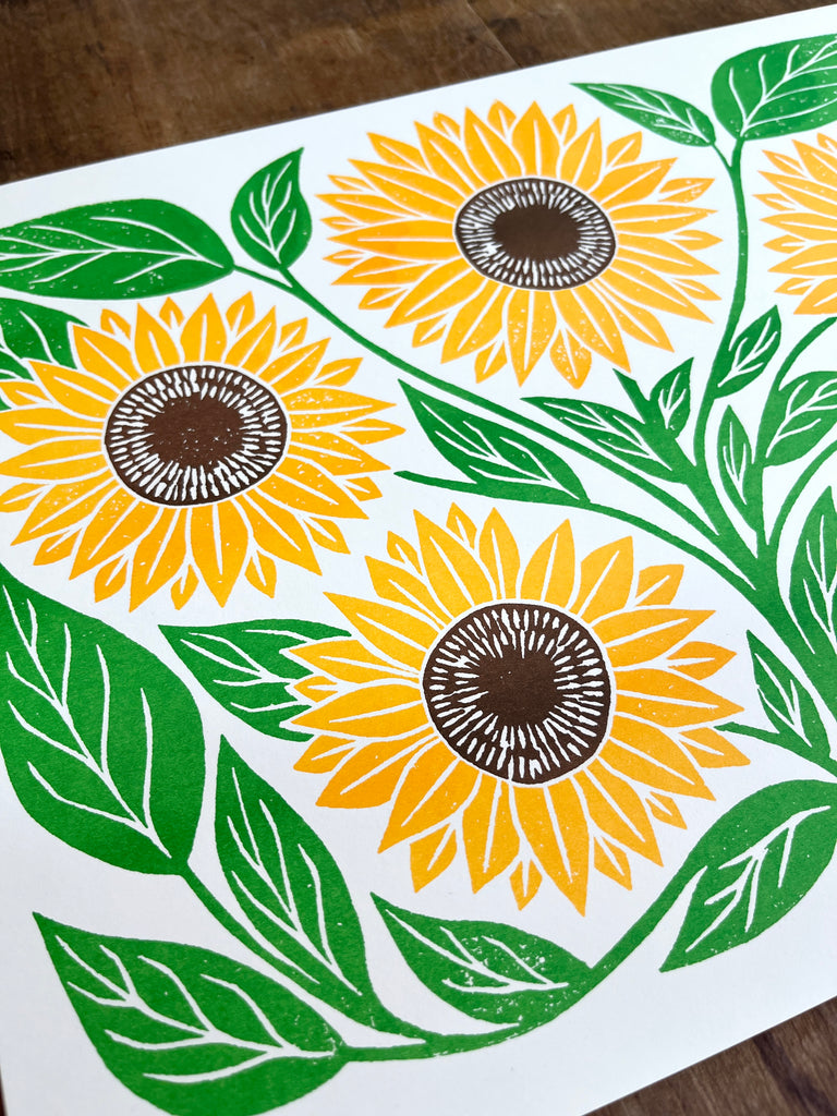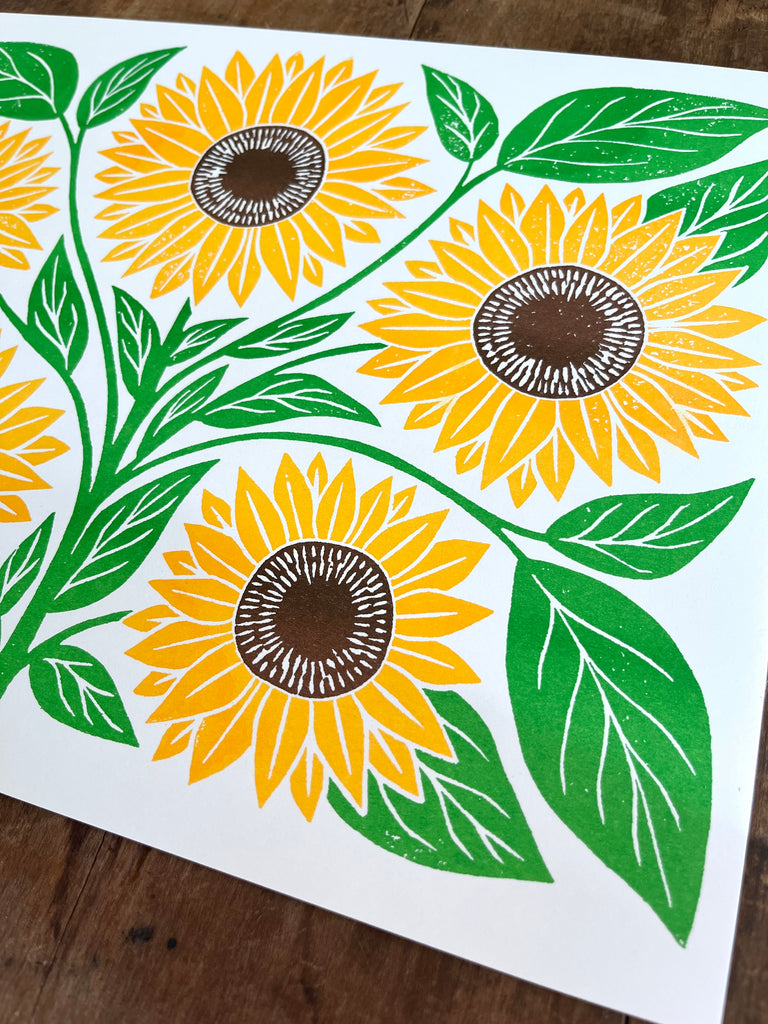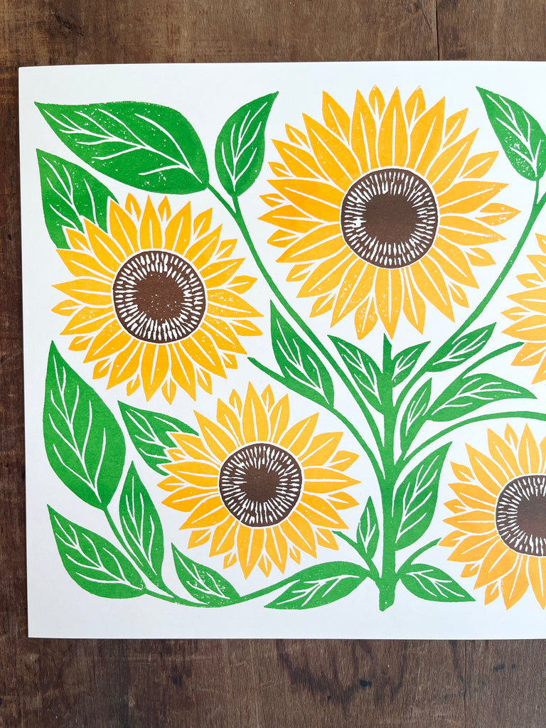 An original Katharine Watson sunflower print, risograph printed in a vibrant color palette of green, yellow, and brown ink on cream paper.