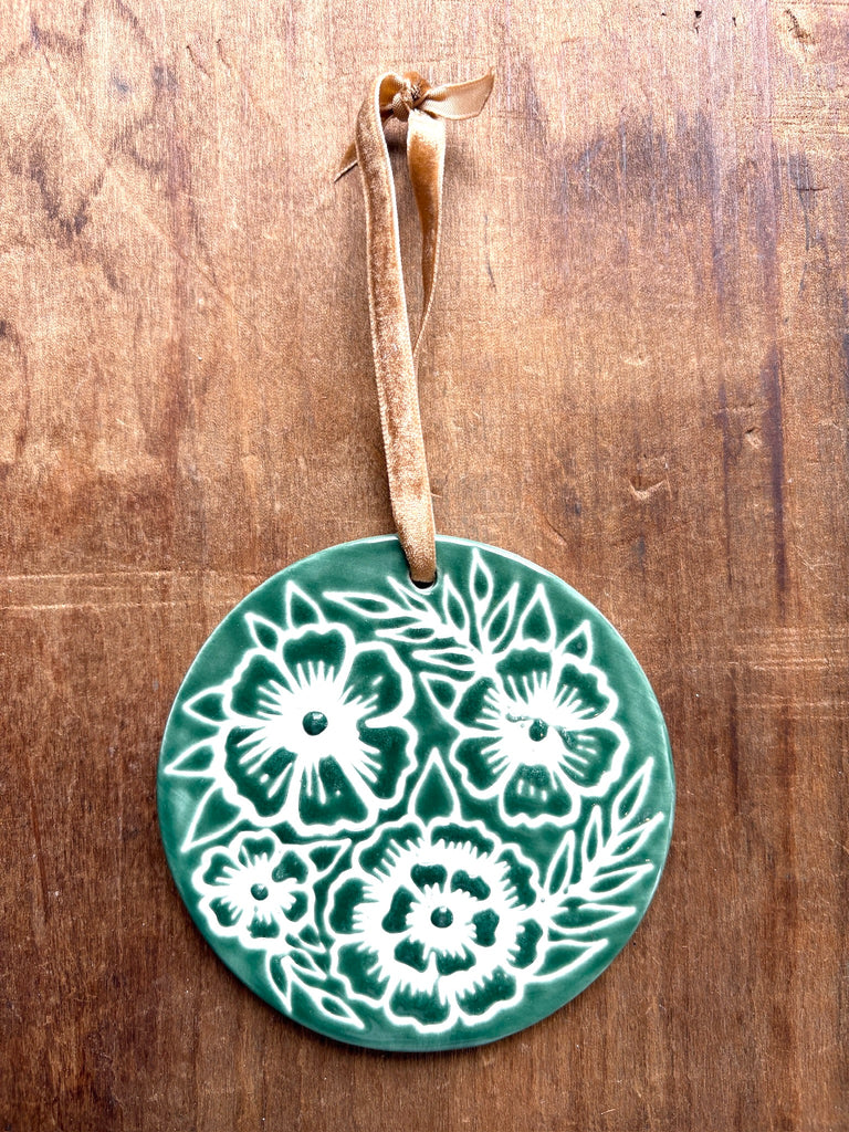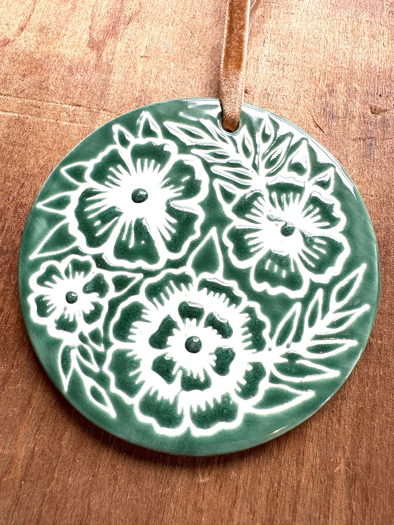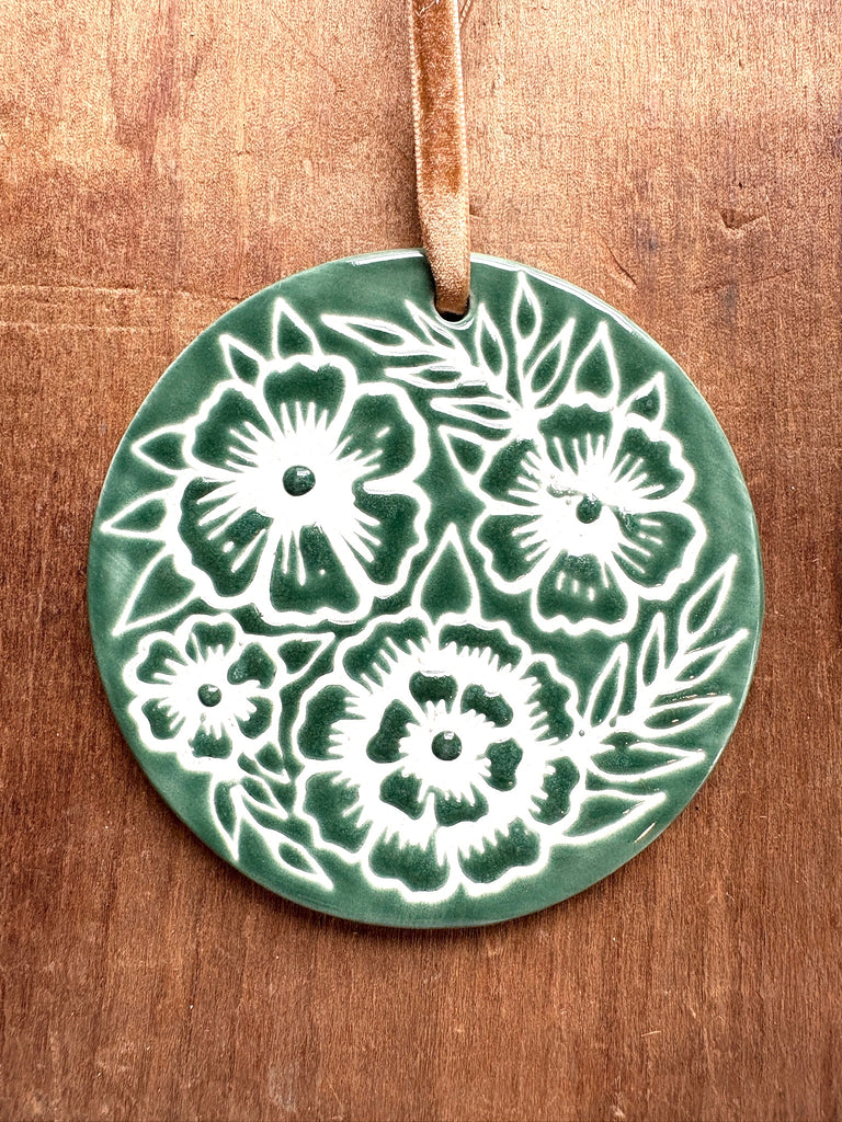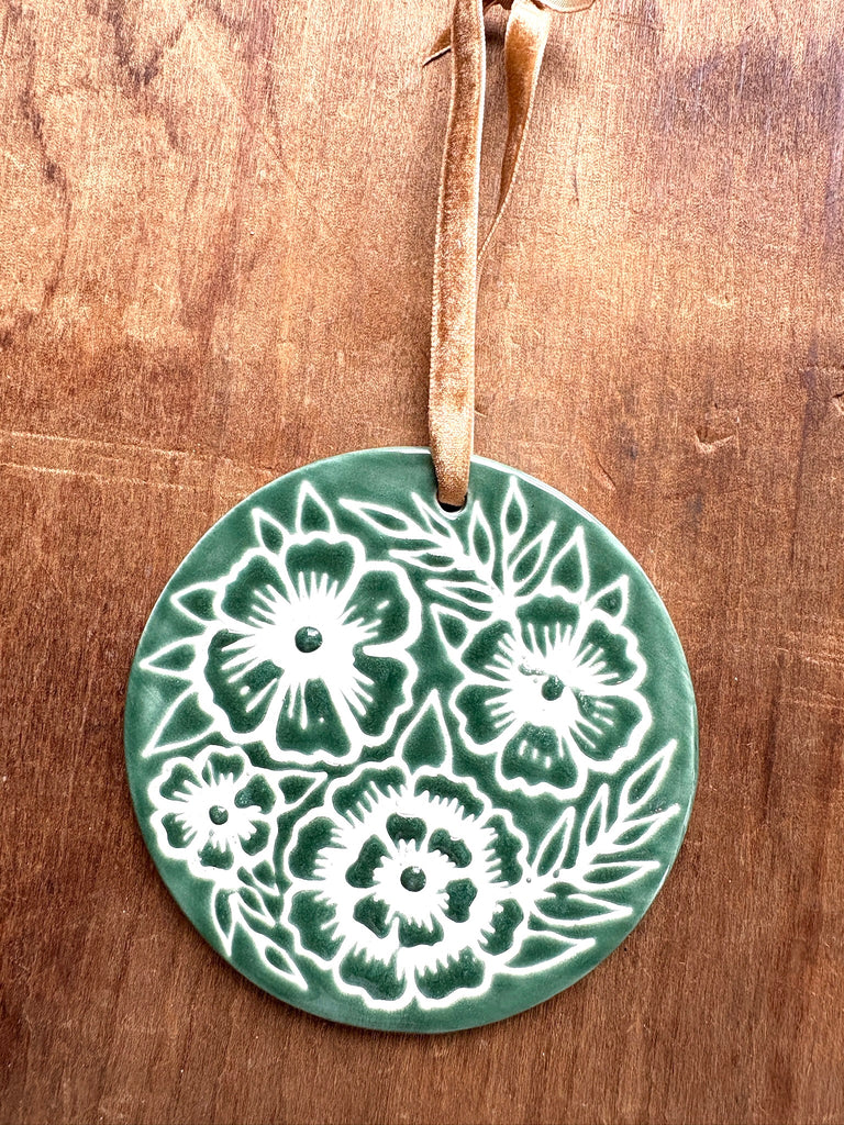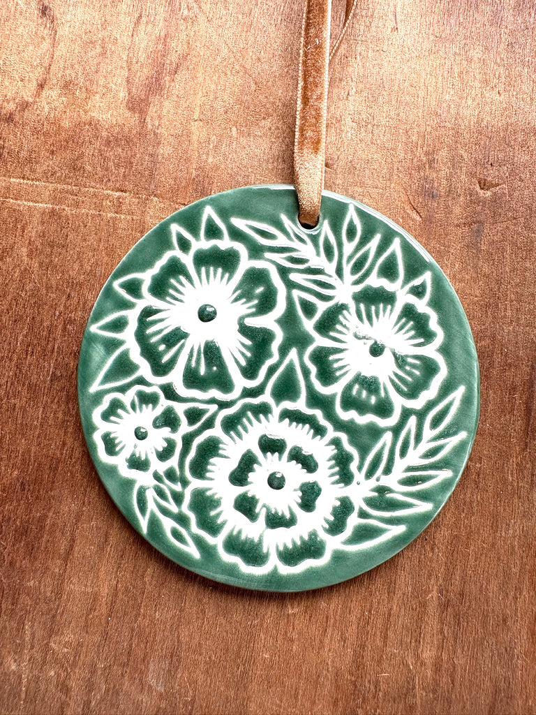 This ceramic ornament features an original hand-painted design by Katharine Watson. The ornament is glazed on the front and unglazed on the back.