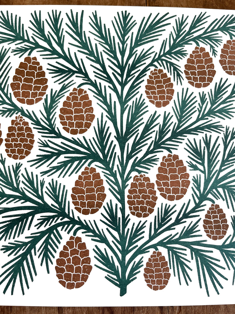 An original Katharine Watson pinecone print, risograph printed in a muted color palette of dark green and brown on cream paper.